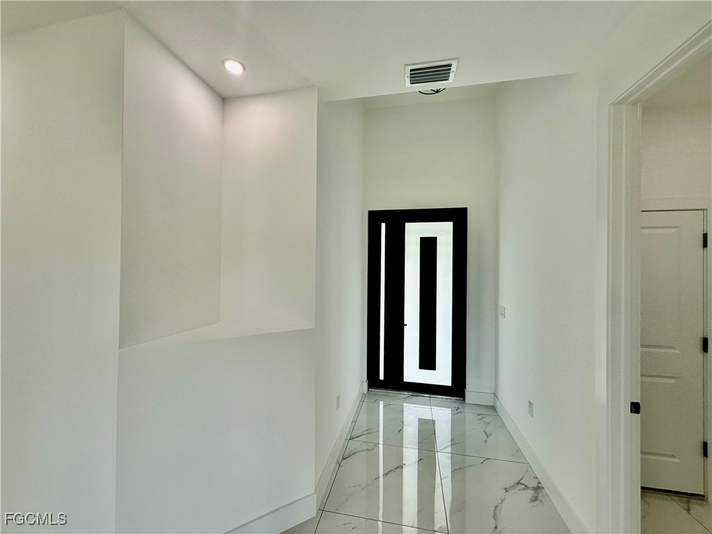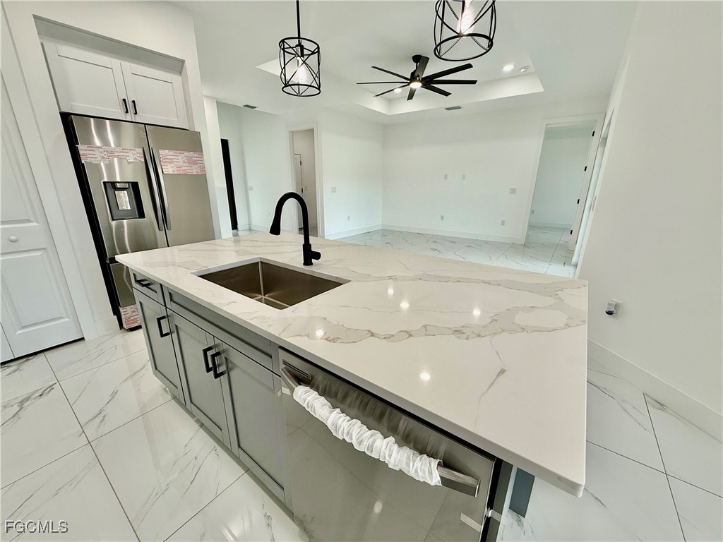 Brand New Home located in Southwest Lehigh, MOVE IN READY 4 BEDROOM 3 FULL BATHROOMS with TWO MASTER SUITES, EXCELLENT FOR IN LAW QUARTERS, C.O. HAS BEEN ISSUED, 32 X 32 POLISHED PORCELAIN TILE FLOORS THROUGHOUT THE ENTIRE HOME with 5 inch baseboards, impact resistant windows and doors, covered front porch leads to large great room, upgraded front door with side light that opens up to make moving in easy, high entry foyer with lighted decorative shelf, high volume ceilings throughout with tray ceilings in the living room and master bedroom, shaker cabinets with soft close doors and drawers, pendant lighting over breakfast bar, QUARTZ TOPS in kitchen and baths, stainless steel appliance package, large dining area with upgraded light fixtures, spacious master bedroom with dual walk in closets, private bath with dual sinks with upgraded light fixtures and built in controls in the mirror, tiled walk in shower with frameless glass doors, 4th bedroom guest quarters off of the kitchen area with it's own private bathroom, indoor laundry room, covered porch in rear overlooking the backyard, covered front porch as well, double garage with grey seal coated floors, excellent location just minutes to SR 82, I-75, Ft Myers and the International airport. NO FLOOD INSURANCE REQUIRED HERE. LEHIGH IS THE HIGHEST ELEVATION IN LEE COUNTY.