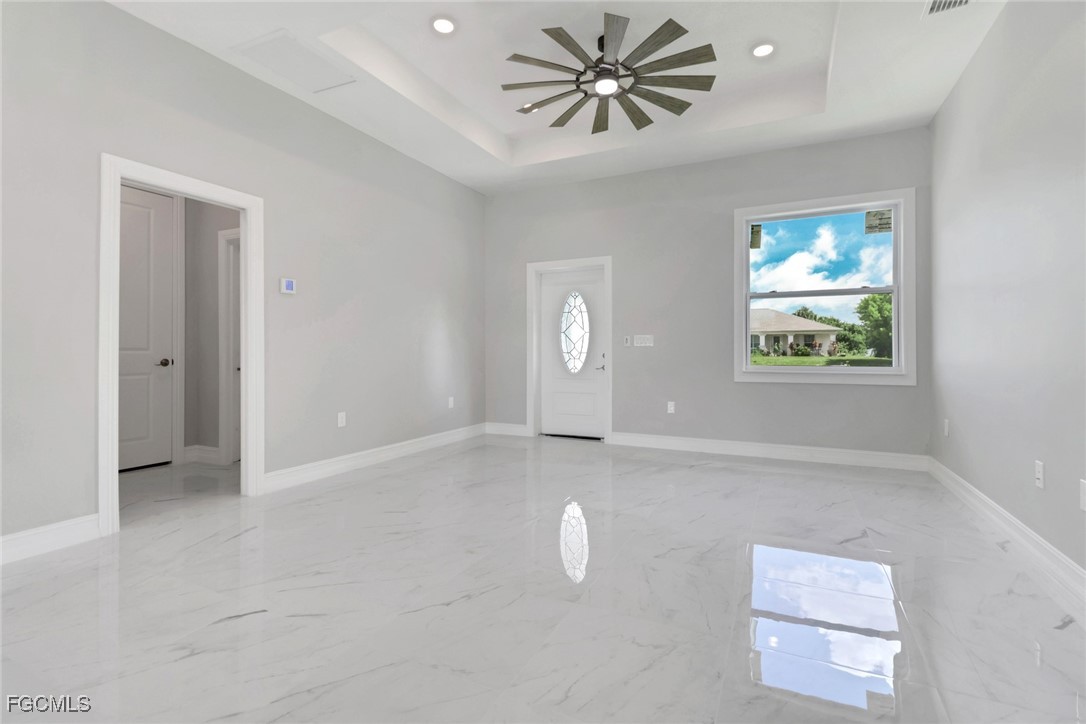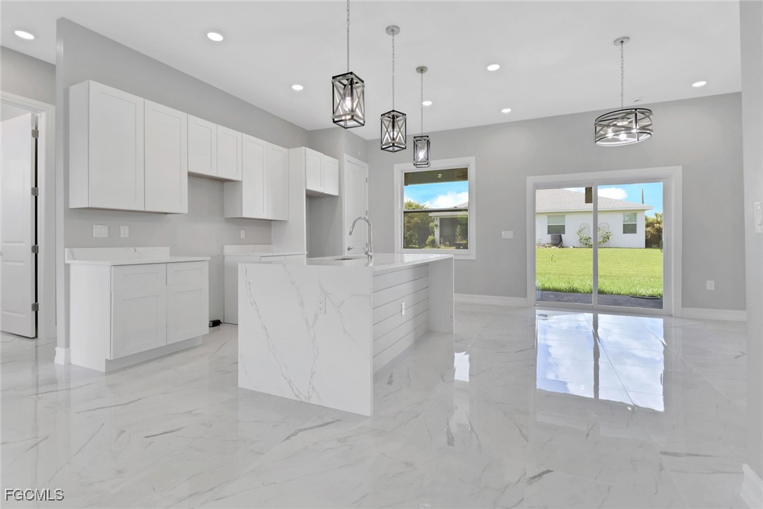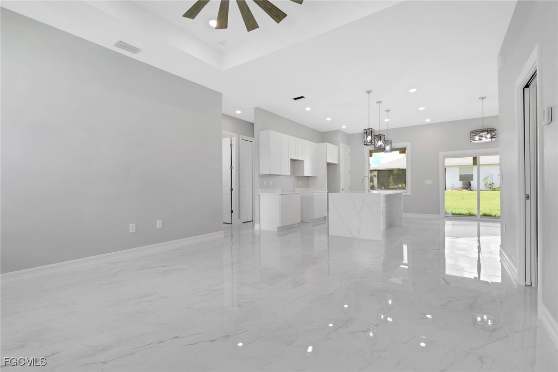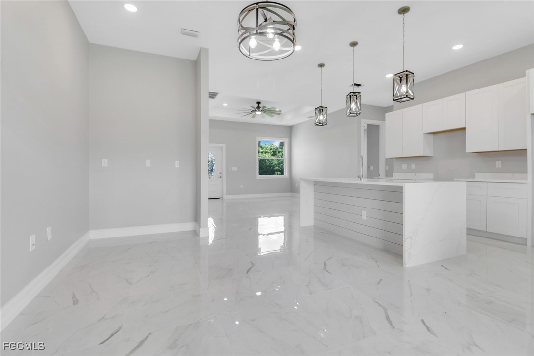 Beautiful new Construction in Fort Myers. 3-bedroom, 2-bathroom home, almost 1600 sq feet. Offers a 2 car garage, Lanai, and in-home laundry. Upgrades throughout include Hurricane Impact windows and doors, coffer ceilings, Tile floors throughout, Quartz countertops and soft close wood cabinets throughout. Kitchen has an Island with waterfall quartz sides, breakfast bar, pantry, and Stainless-Steel appliances (to be installed). Master Bedroom has 3 closets for extra storage! Including large 2 walk-ins with custom shelving. Master bathroom features 2 separate sinks and vanities, and a walk-in shower. No Flood insurance or HOA fees to worry about.