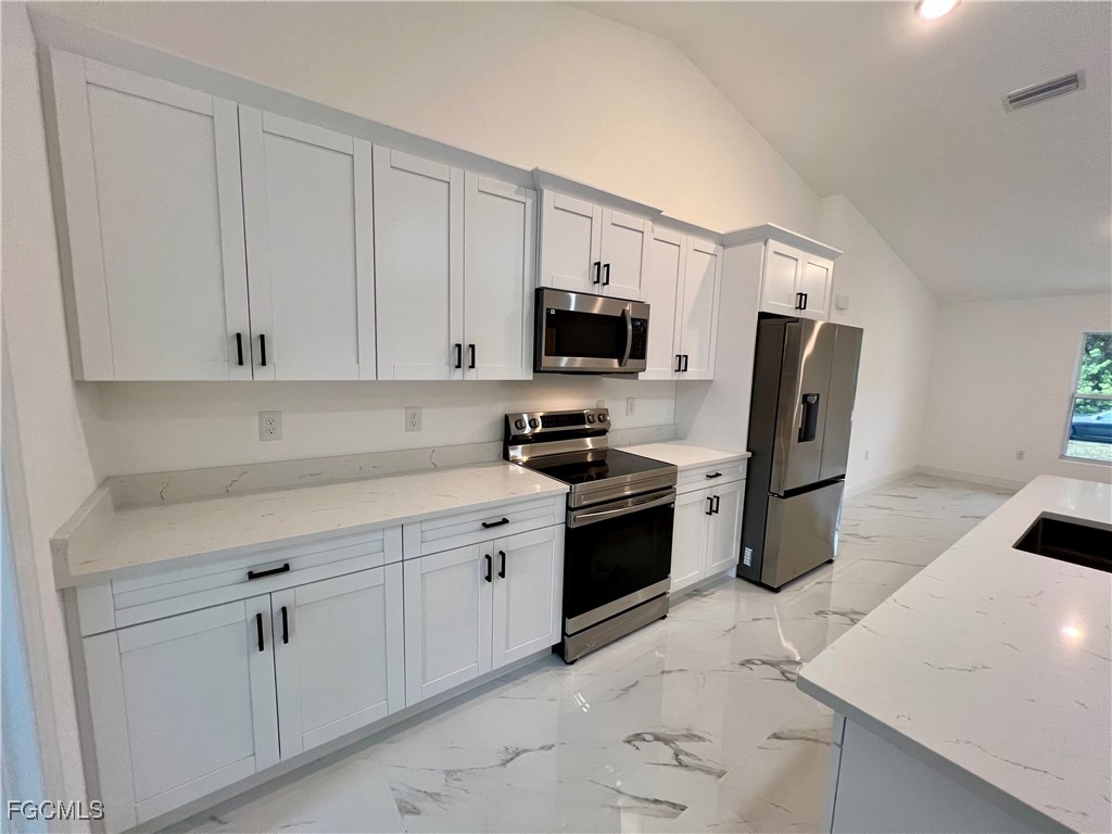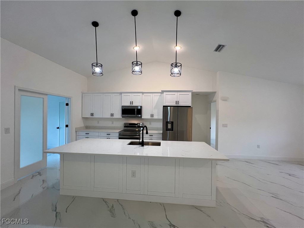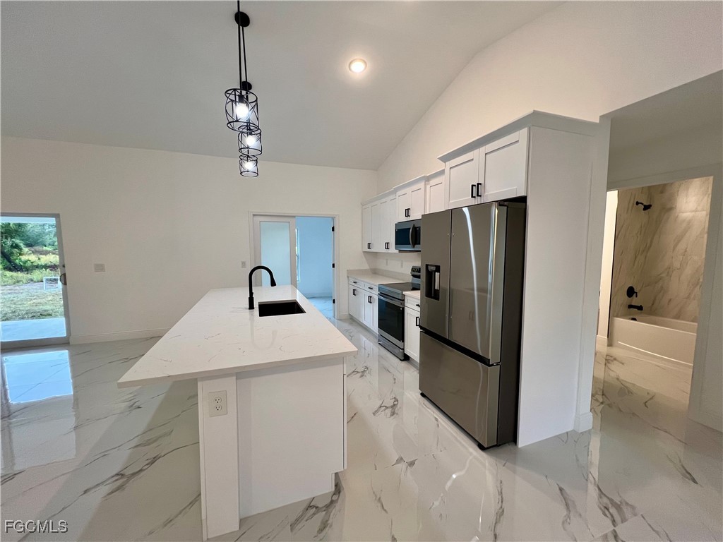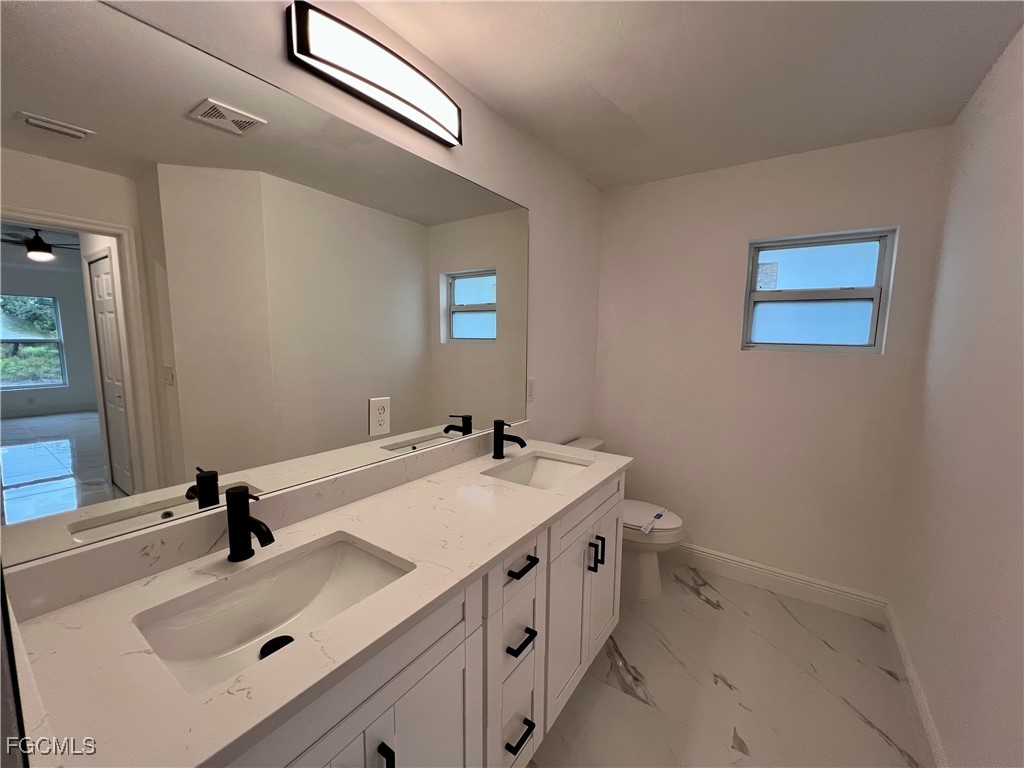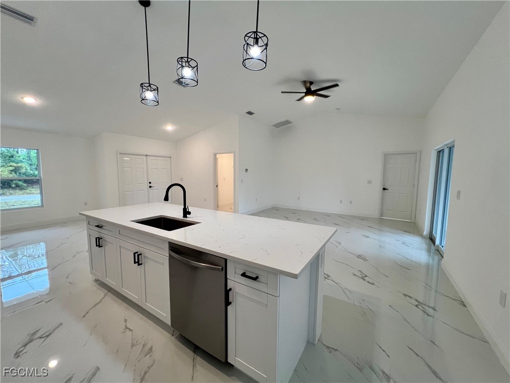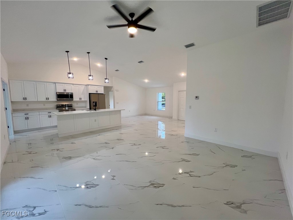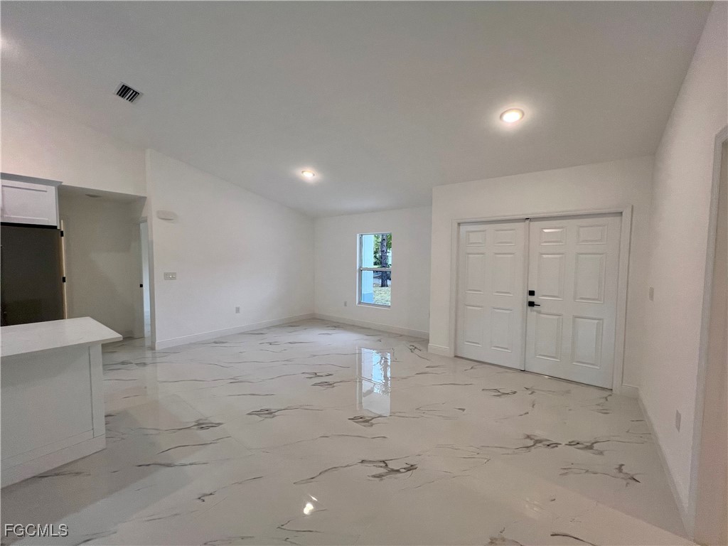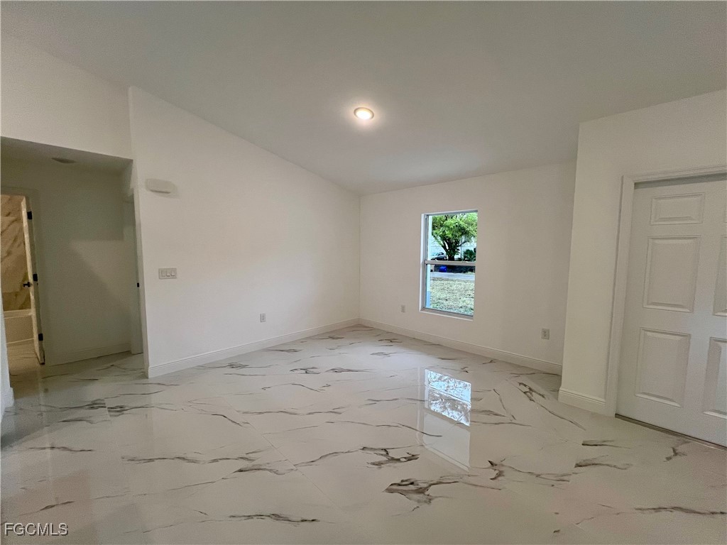 Brand New Home located in Northeast Lehigh on a HALF ACRE LOT at the end of a QUIET DEAD END STREET, MOVE IN READY 3 BEDROOM 2 BATH WITH A DEN with a closet that may be used as 4TH BEDROOM. C.O. HAS BEEN ISSUED, double door entry to the den for privacy, 32 X 32 POLISHED PORCELAIN TILE FLOORS THROUGHOUT THE ENTIRE HOME with 5 inch baseboards, impact resistant windows, covered front porch leads to large great room, high ceilings throughout with tray ceilings in the living room and master bedroom, shaker cabinets with soft close doors and drawers, pendant lighting over breakfast bar, QUARTZ TOPS in kitchen and baths, stainless steel appliance package, pantry, large dining area off of the kitchen, spacious master bedroom with walk in closet, private bath with dual sinks and tiled walk in shower, indoor laundry room, covered porch in rear overlooking the HALF ACRE backyard with plenty of privacy, double garage with auto opener, extra long driveway with plenty of parking, excellent location just minutes to SR 80, I-75 and Ft Myers.