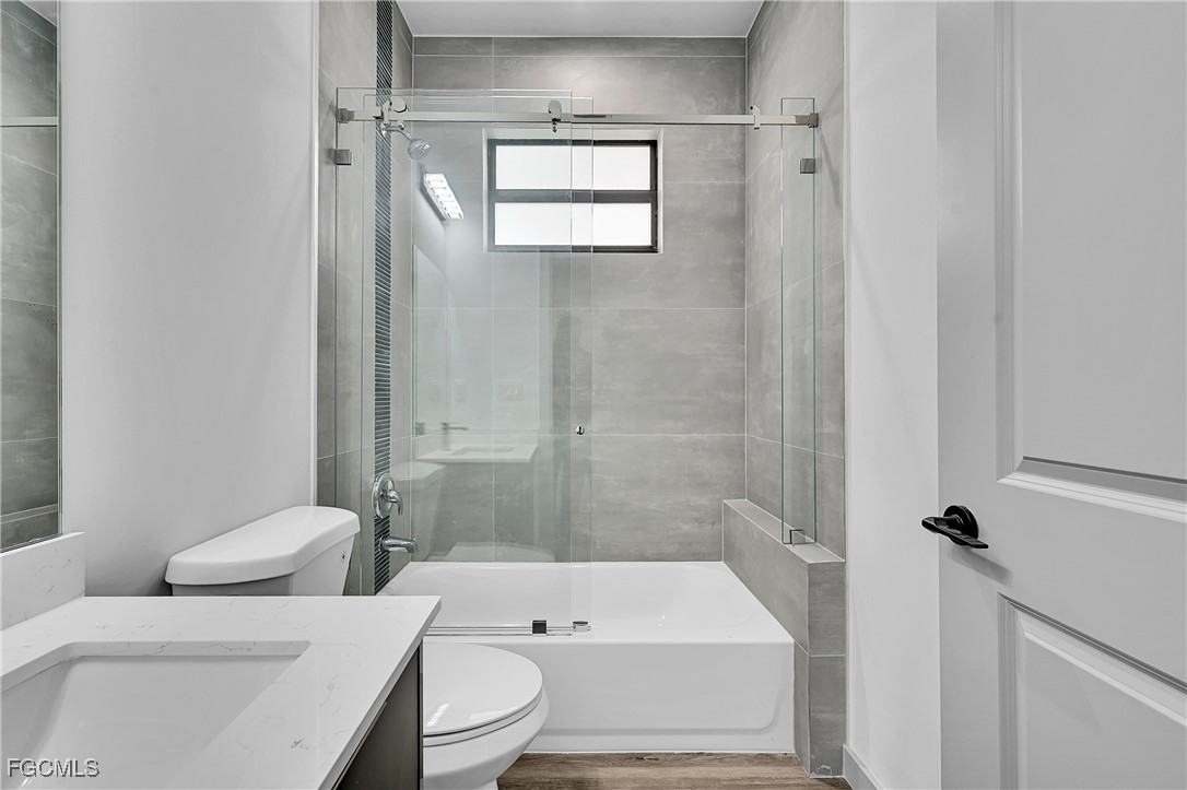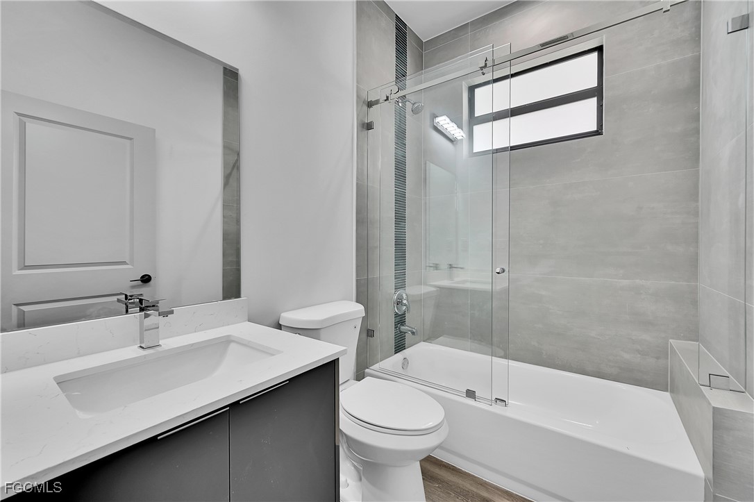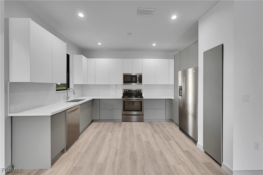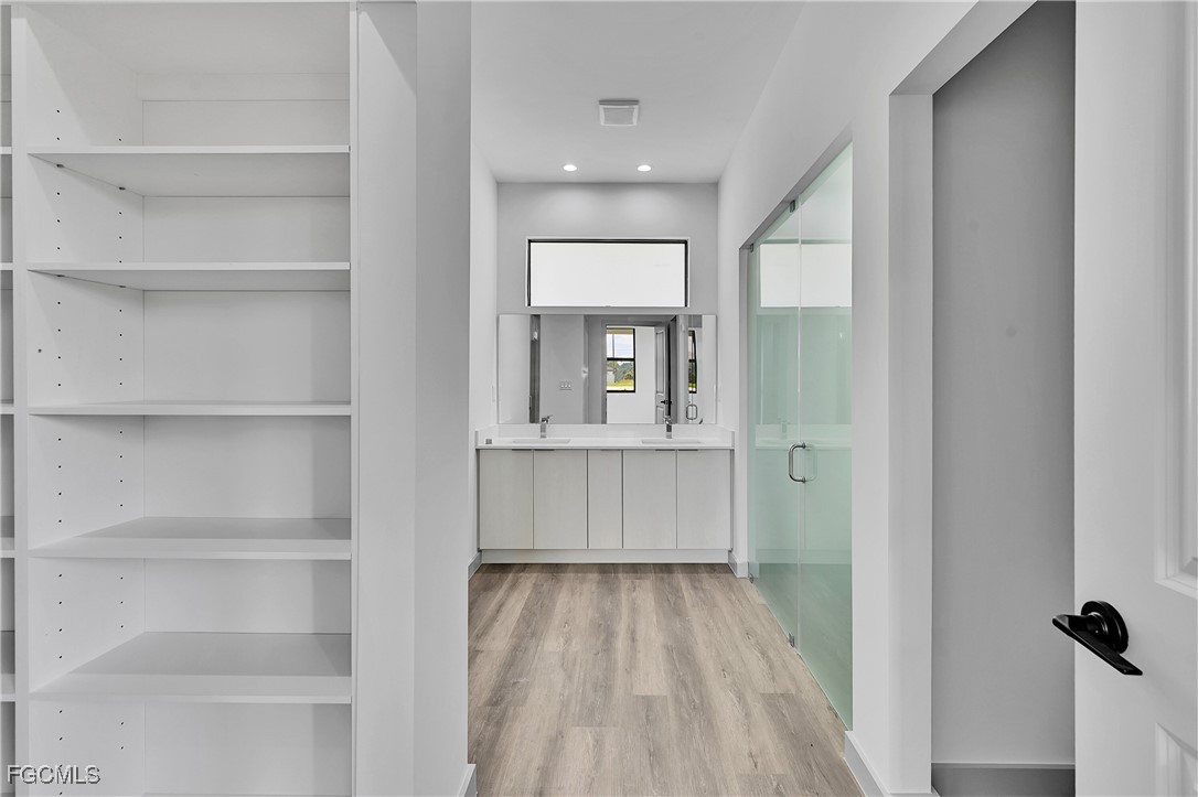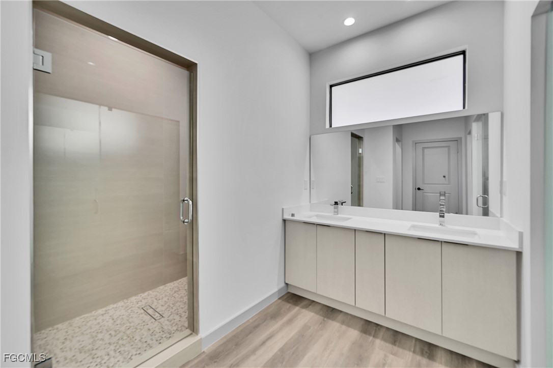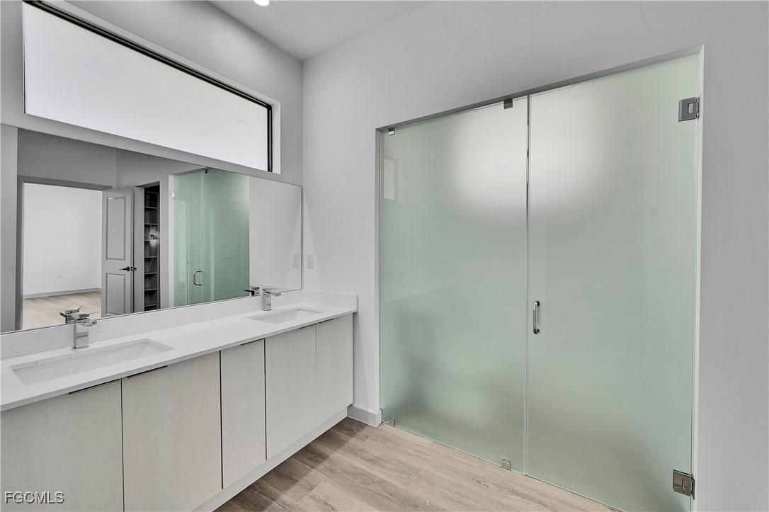 Step inside to discover high ceilings, elegant wood-look flooring, and abundant natural light throughout. The gourmet kitchen boasts sleek two-tone cabinetry, quartz countertops, stainless steel appliances, and a large open layout ideal for entertaining. The primary suite includes a walk-in closet and a spa-like bathroom with dual vanities and a glass-enclosed shower.