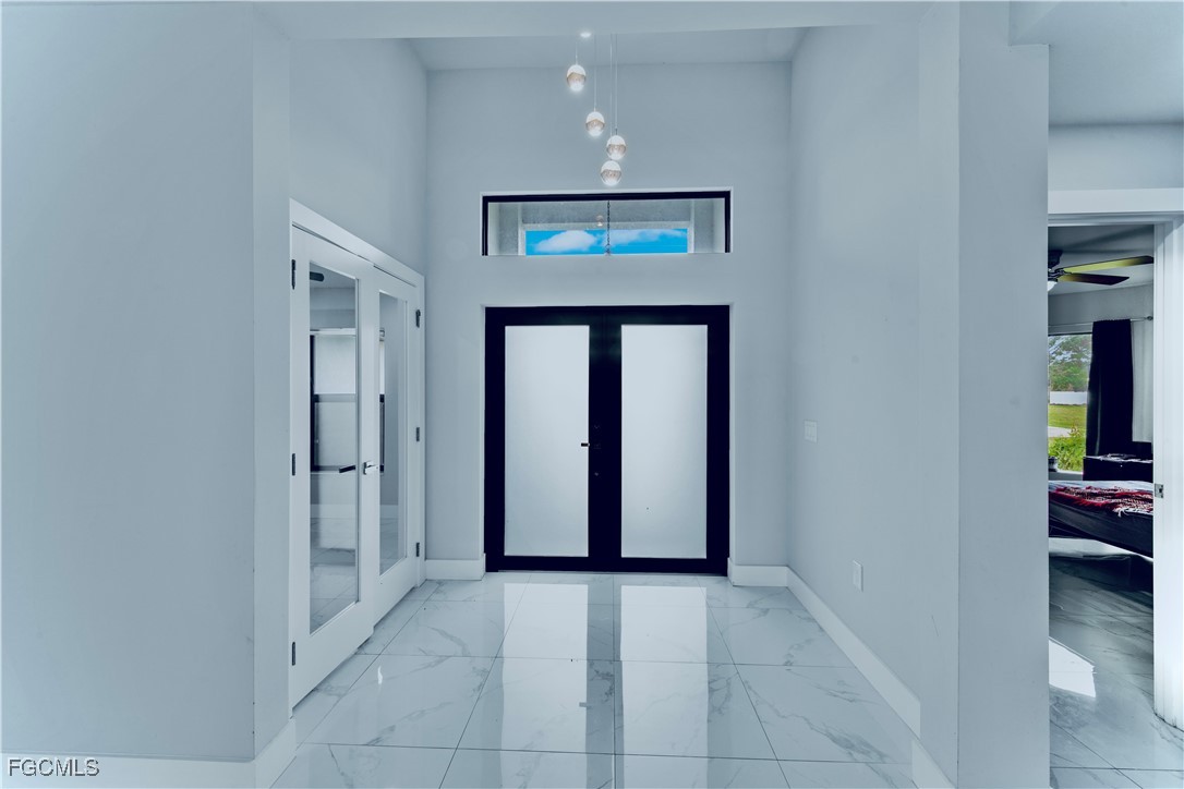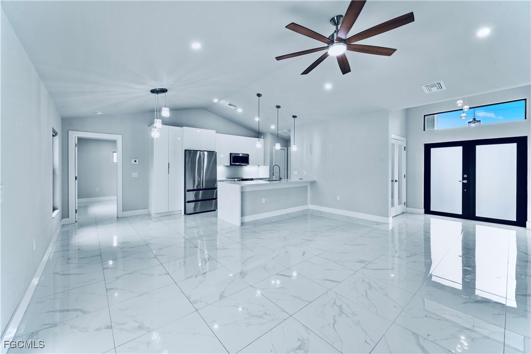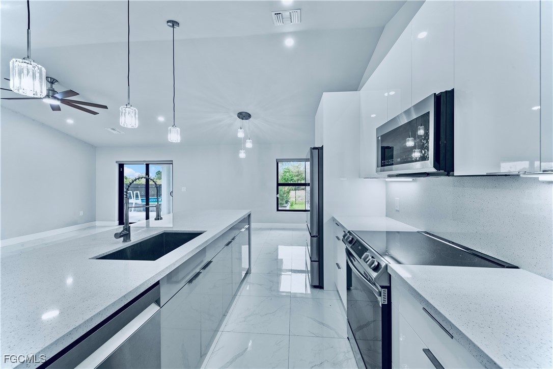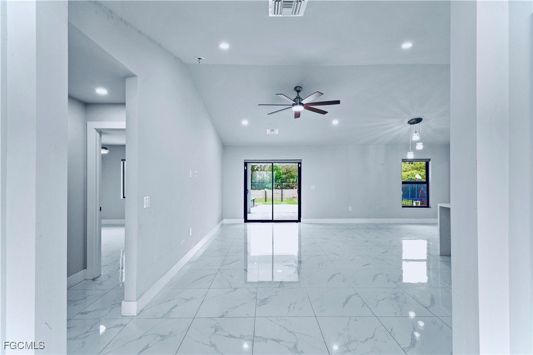 Welcome home to this MAGNIFICENT (2024) BUILT 3/2 + Den 6 ft. FENCED property with an extended patio plus decorative retaining wall & a POOL great for entertaining. This open floor plan spotlights an enticing OVERSIZED porcelain tile throughout, gorgeous rainfall QUARTZ countertops & backsplash with an awarding breakfast bar, desirable European high-gloss cabinetry with generous floating vanities, and an admirable frameless glass tiled shower with Rainfall & jetted shower system. The GRAND elevation with cathedral ceilings highlights IMPACT & refreshing BAY WINDOWS, flattering glass French doors, dual closets, premium STAINLESS STEEL appliances, and Upgraded fixtures & hardware. It has been nicely landscaped & also features, dual sinks & closets, under cabinet lighting, appealing illuminated mirrors, Recessed & pendant lighting, EPOXY garage flooring, window treatments, desirable built-in bath niches, an irrigation system, and the laundry room is under air with storage cabinets. This peaceful property is nestled away on a quiet paved street backed to a canal just minutes to major amenities & a quick commute to Fort Myers. Schedule your showing today! **This property is subject to a short sale.**
