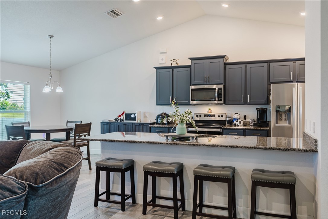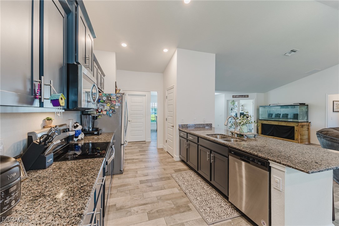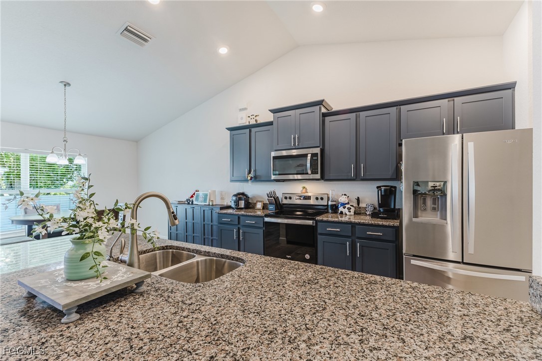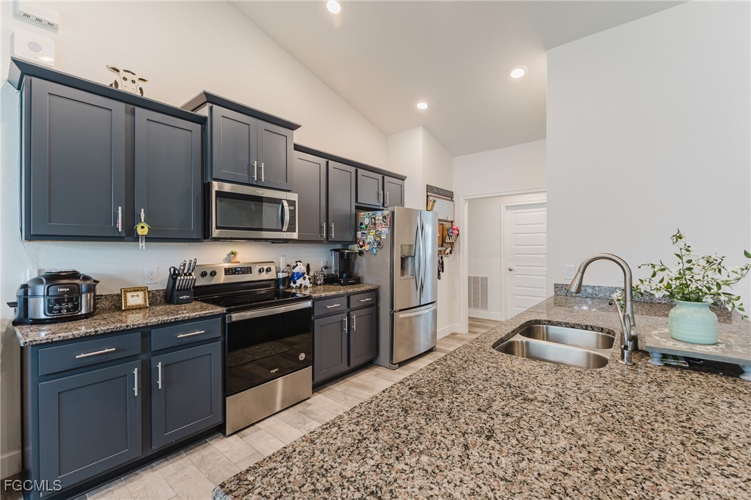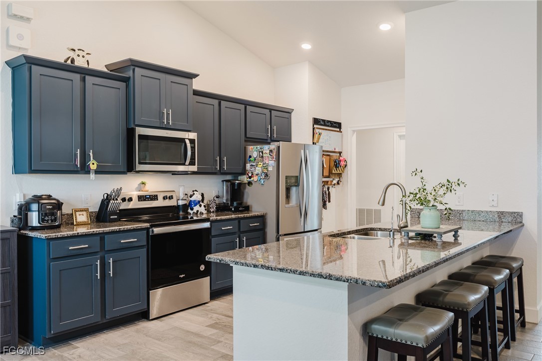 • Gourmet kitchen with Whirlpool appliances and bold Baltic Blue cabinets
