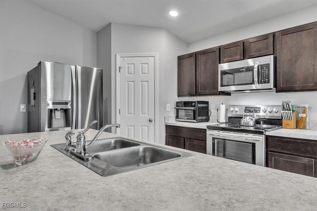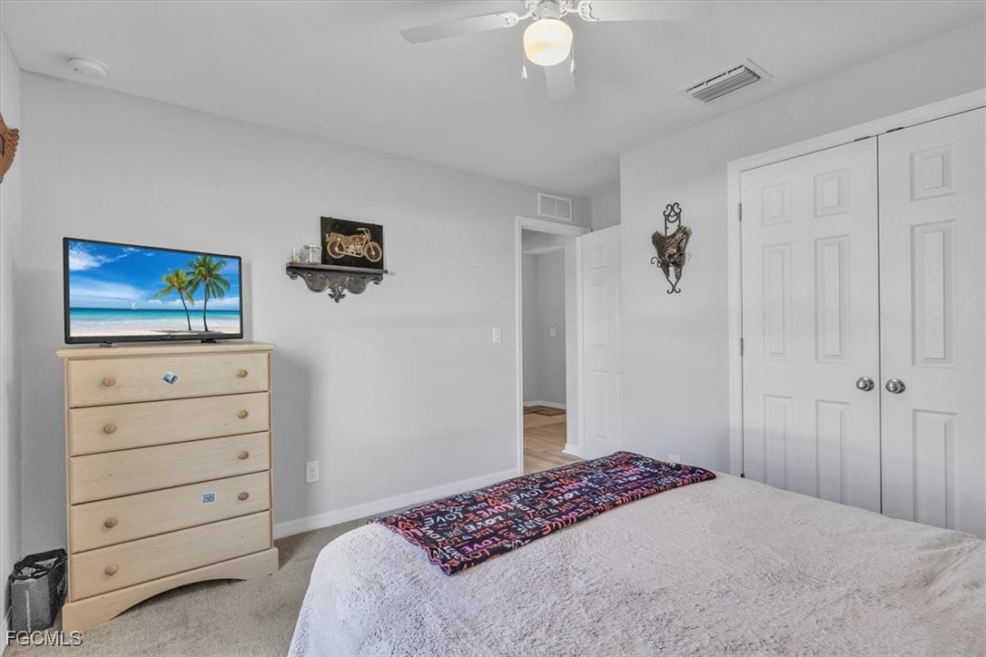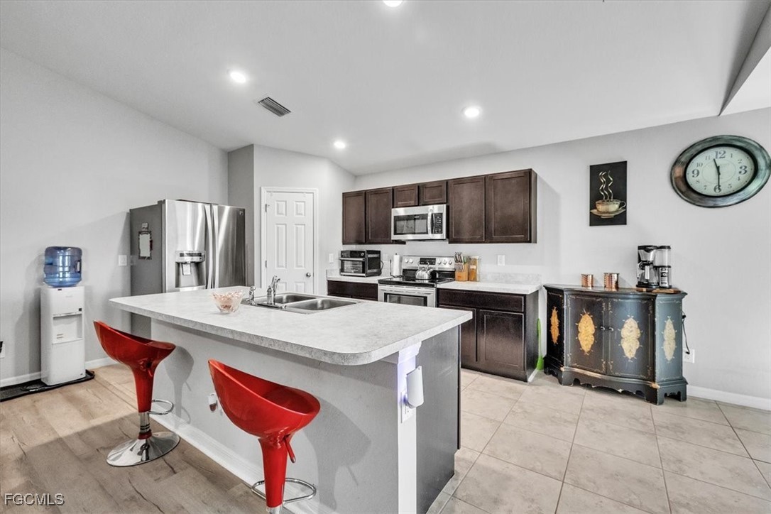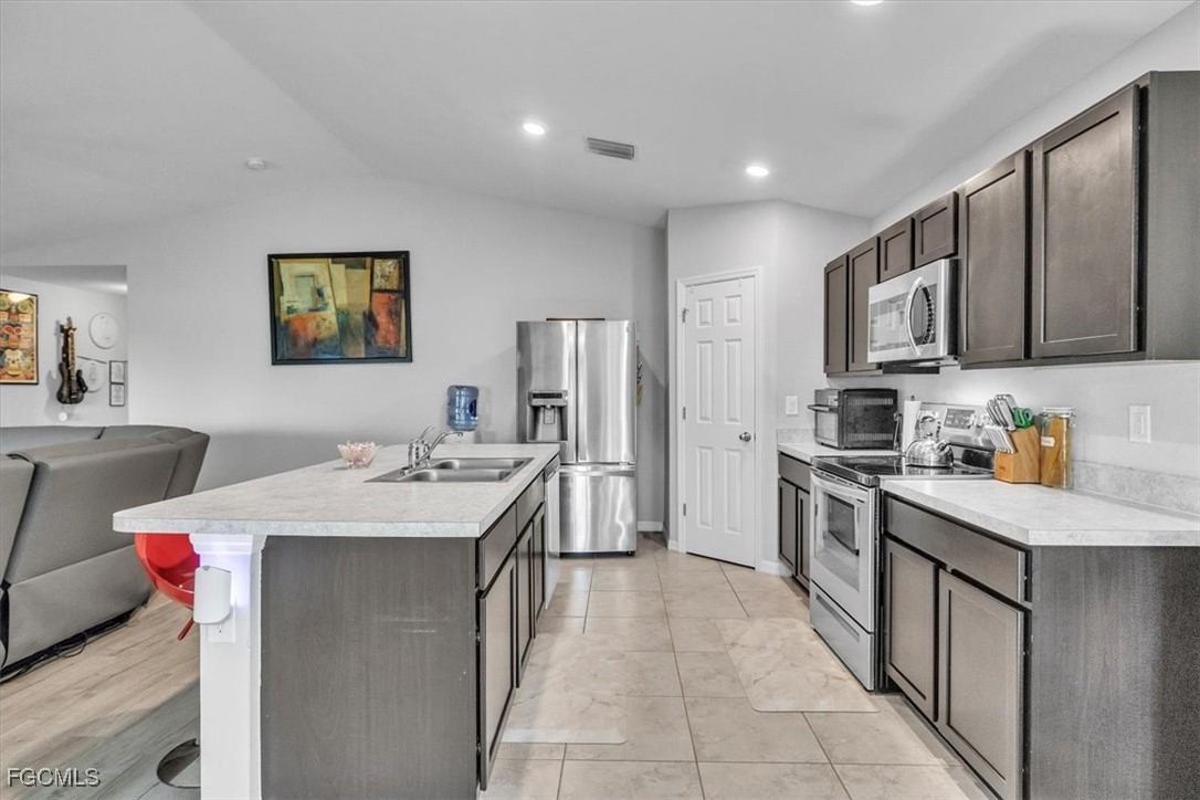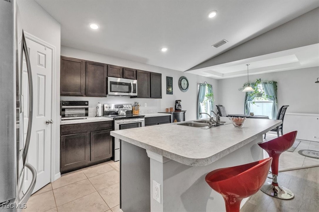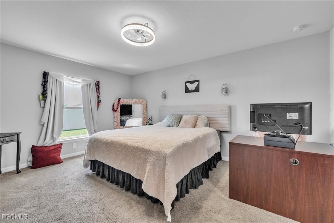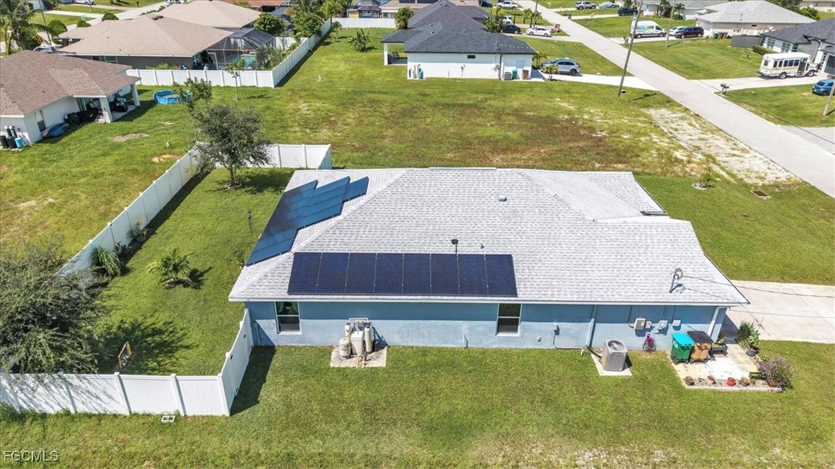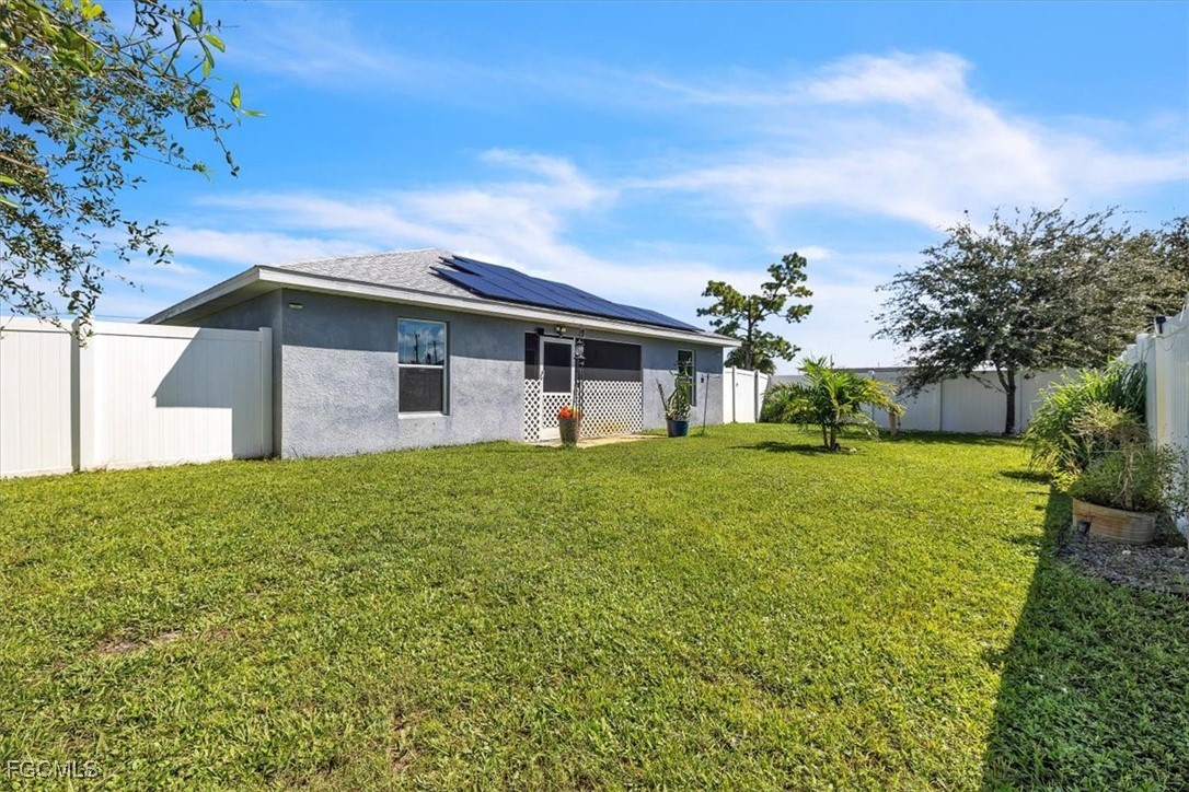 Located in the desirable Northwest Cape Coral area, this 4-bedroom, 2-bathroom home combines comfort, convenience, and Florida living at its best. Step through the foyer into an open-concept living space where the living room, dining area, and kitchen flow seamlessly together. The kitchen features stainless steel appliances, a center island with seating, a pantry closet, and shaker-style cabinetry—perfect for cooking and entertaining. High ceilings, a mix of Luxury Vinyl and tile flooring, and sliding doors that open to the screened lanai create a bright, airy, and inviting atmosphere. The primary bedroom offers plush carpeting and an attached bath with a walk-in closet, extended vanity with dual sinks, private toilet room, and walk-in shower. Three additional bedrooms feature carpet flooring, built-in closets, and share a full bathroom, offering versatile layouts ideal for family, guests, or a home office. The home also features Solar panels, to be paid off before closing, provide sustainable power and keep electric bills low, a laundry room, water softener, irrigation system, and an A/C installed in 2019. Recent updates include a vinyl fence added in 2022. With a spacious 2-car garage and a private fenced backyard, it’s perfect for everyday living and outdoor enjoyment. This home is minutes from shopping and dining at Walmart, Target, Publix, and local eateries. Outdoor enthusiasts will love proximity to Cape Coral’s 400 miles of canals for fishing and kayaking, as well as attractions like Coral Oaks Golf Course and Sun Splash Family Waterpark. Lee County schools are nearby, and the vibrant commercial hubs of Cape Coral and Fort Myers offer additional entertainment and dining options just a short drive away. Don’t miss this exceptional property—schedule your showing today! - **PLEASE ENJOY THE 3D INTERACTIVE VIRTUAL TOUR ASSOCIATED WITH THIS LISTING**