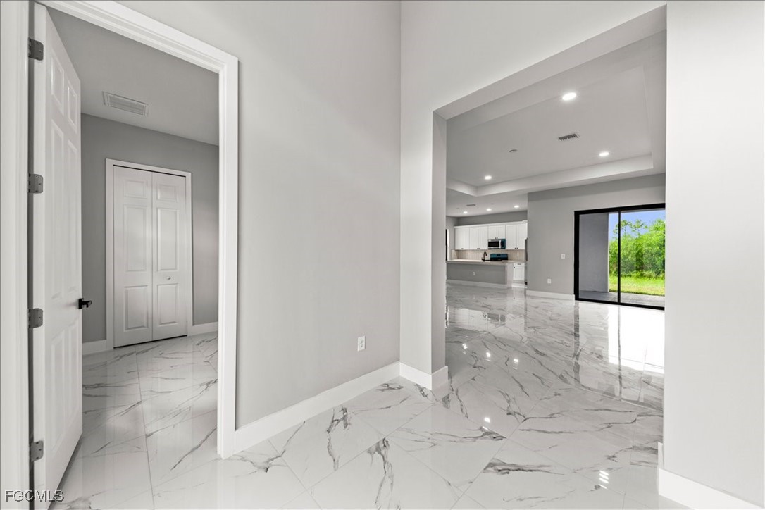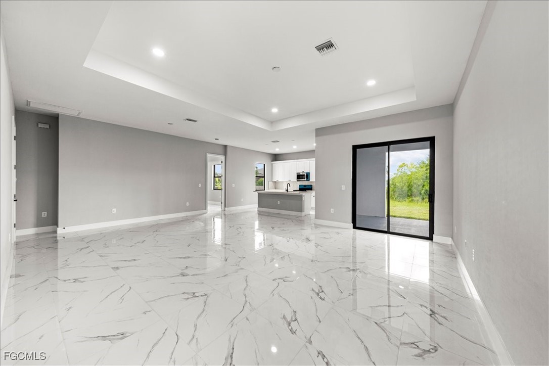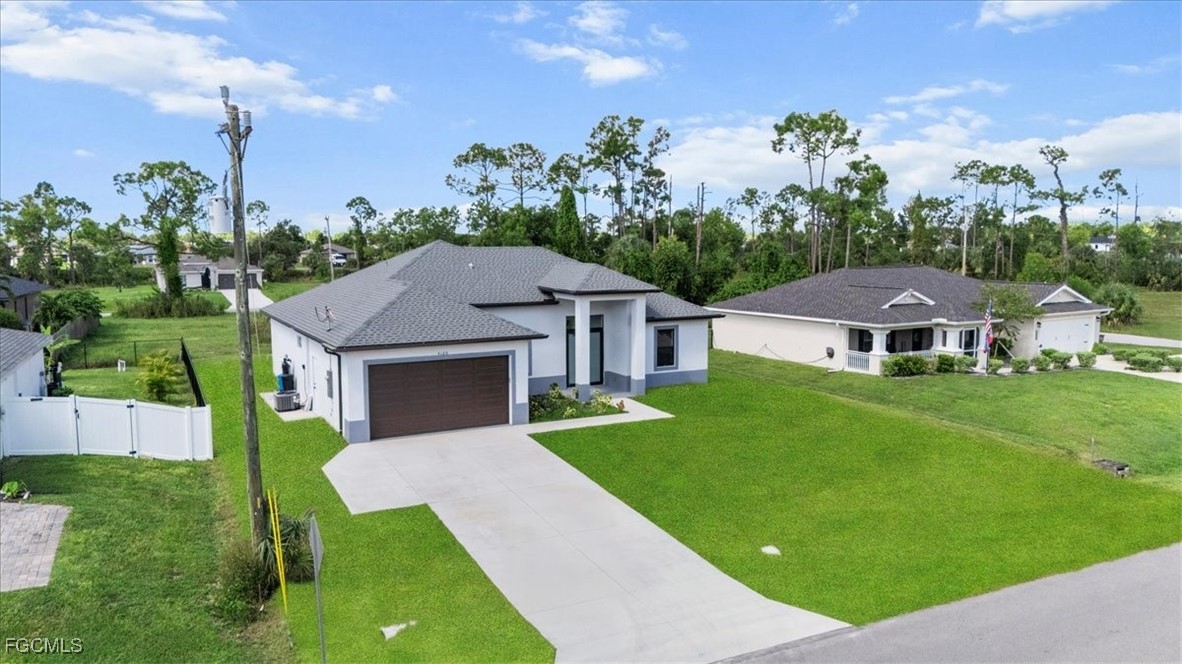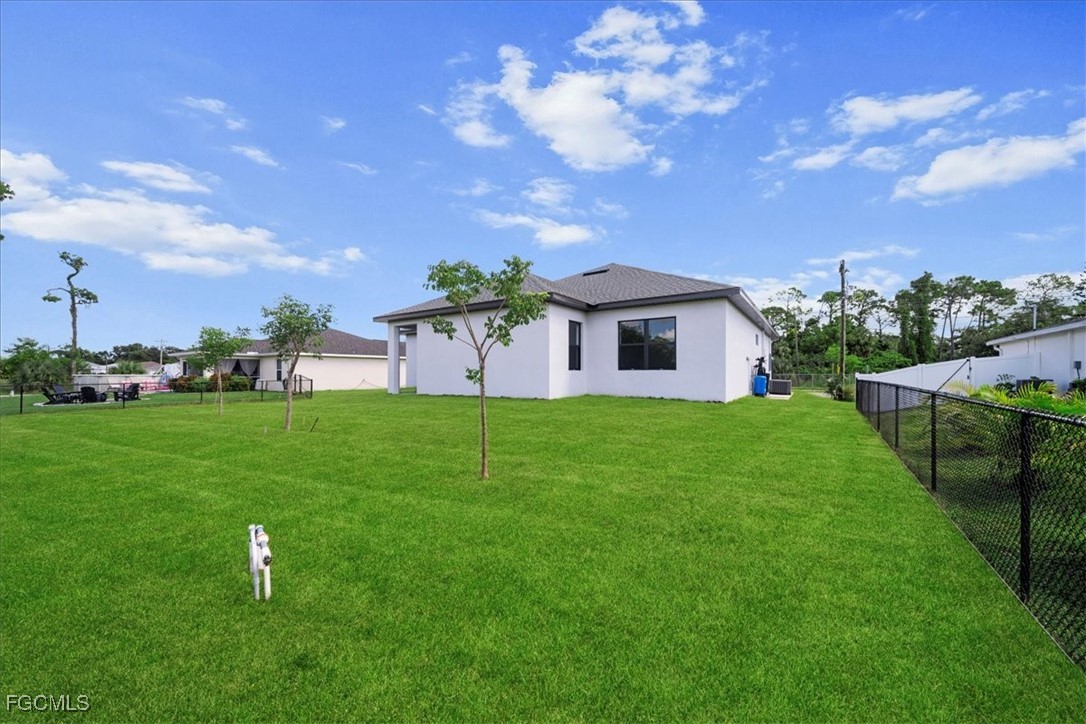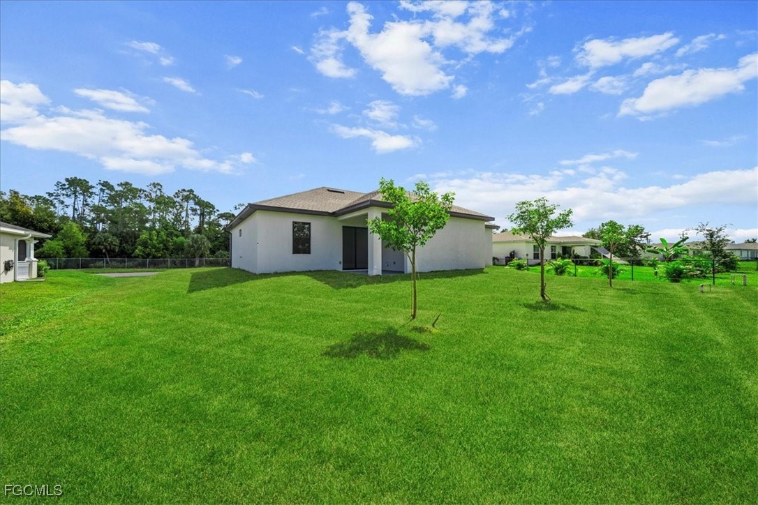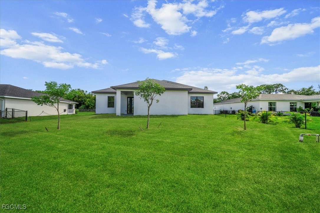 Step into modern elegance with this newly built 4-bedroom, 2-bath home featuring 1,960 sq. ft. under air and a total of 2,458 sq. ft. including a spacious lanai and 2-car garage. Located in the fast-growing northeast Cape Coral corridor, this property blends sleek design with everyday functionality, soaring ceilings, hurricane-impact windows and doors, quartz countertops, shaker cabinets, and oversized tile flooring throughout. The spacious master suite showcases tray ceilings, dual walk-in closets, and a walk-in shower. The laundry room includes washer/dryer hookups and extra storage space. The covered lanai is ideal for adding your own outdoor summer kitchen. Whether you're looking for a full-time residence or a seasonal getaway, this home offers stylish living in a convenient location just minutes from schools, parks, and local dining. Your next home is waiting—schedule a tour today!