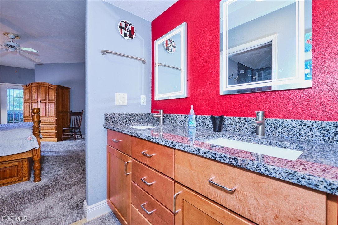 Inside, the home is designed with neutral tile throughout most rooms, extending into the enclosed lanai and kitchen. The enormous primary bedroom offers both space and comfort, featuring a sitting area with French doors leading to the lanai, a spacious walk-in closet, and a beautifully appointed bath with dual sinks, custom lighted mirrors and a large built-in mirrored storage closet. The split floor plan ensures privacy, with the guest bedroom and adjacent bath located on the opposite side of the home. The guest bath includes a tub and shower combination with attractive sliding glass doors, providing both style and functionality. The laundry room accommodates a full-size washer, dryer and hot water heater, with cabinets and additional storage space above, along with convenient access to the garage.