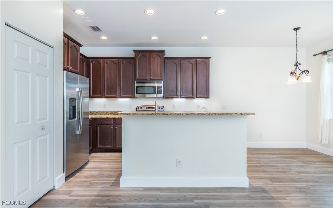 Step inside to discover an inviting open-concept layout that seamlessly connects the living, dining, and kitchen areas—perfect for entertaining or relaxing. The kitchen features granite countertops, stainless steel appliances, and rich wood cabinetry, while the spacious living room opens to a screened lanai overlooking a peaceful, landscaped backyard.