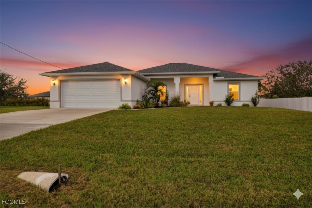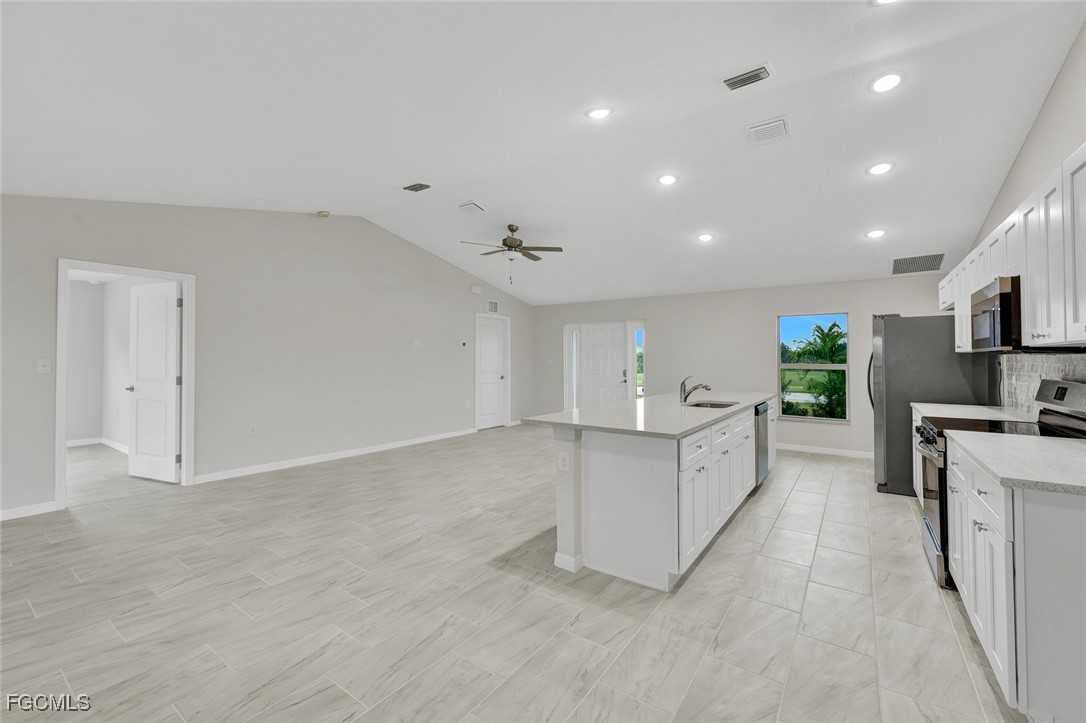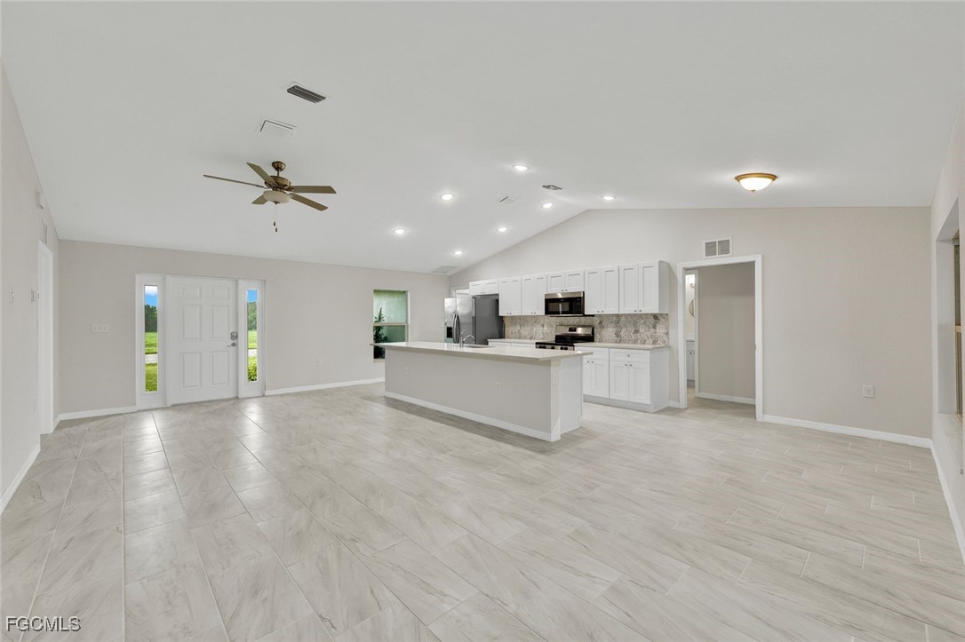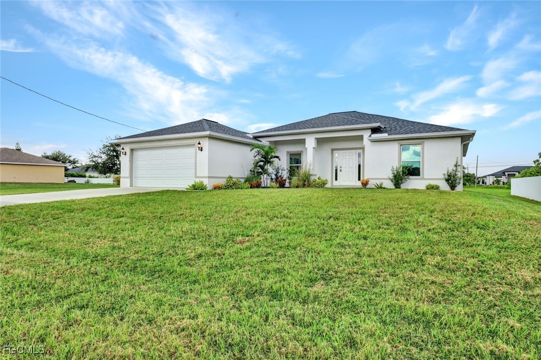 Beautiful 4 bedroom/3 bath concrete block home in desirable Northwest Cape Coral. PLEASE VIEW THE WALK-THROUGH TOUR (TOUR 2 EN ESPANOL). This popular Verona model features HURRICANE-RATED windows and doors (no shutters needed), a large and bright open-concept living space with large tile floors throughout, soaring cathedral ceiling and 3-panel sliding doors for abundant natural light and WESTERN VIEWS. The bright chef's kitchen features a huge island, Shaker wood soft-close cabinetry, Quartz countertops, beautiful tile backsplash, stainless steel appliances, and relaxing breakfast nook. The large owner's bedroom has a bright ensuite bath with Quartz counter tops, dual sinks, a tiled step-in shower, and walk-in closet. An optional SECOND OWNER'S SUITE has a bright, modern bathroom and direct access to the spacious lanai. Two more bedrooms and a third bathroom provide lots of room for kids, guests, a den, a flex space or a home office. In a family-friendly neighborhood with convenient access to Pine Island Road for shopping, dining, entertainment, and short drive to Florida's famous white-sand beaches. Schedule your showing today!