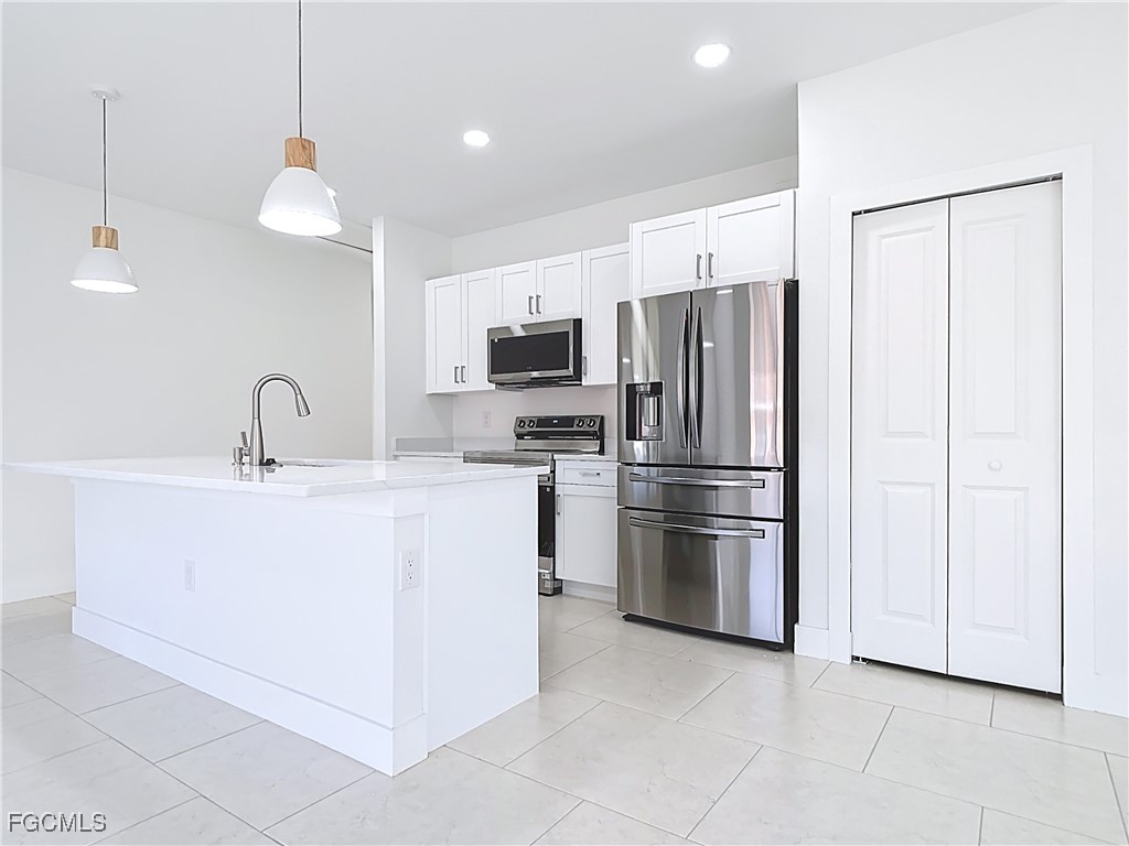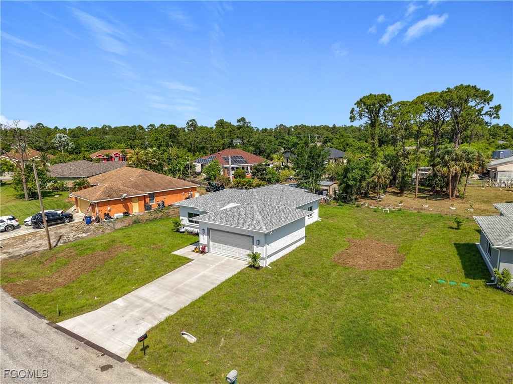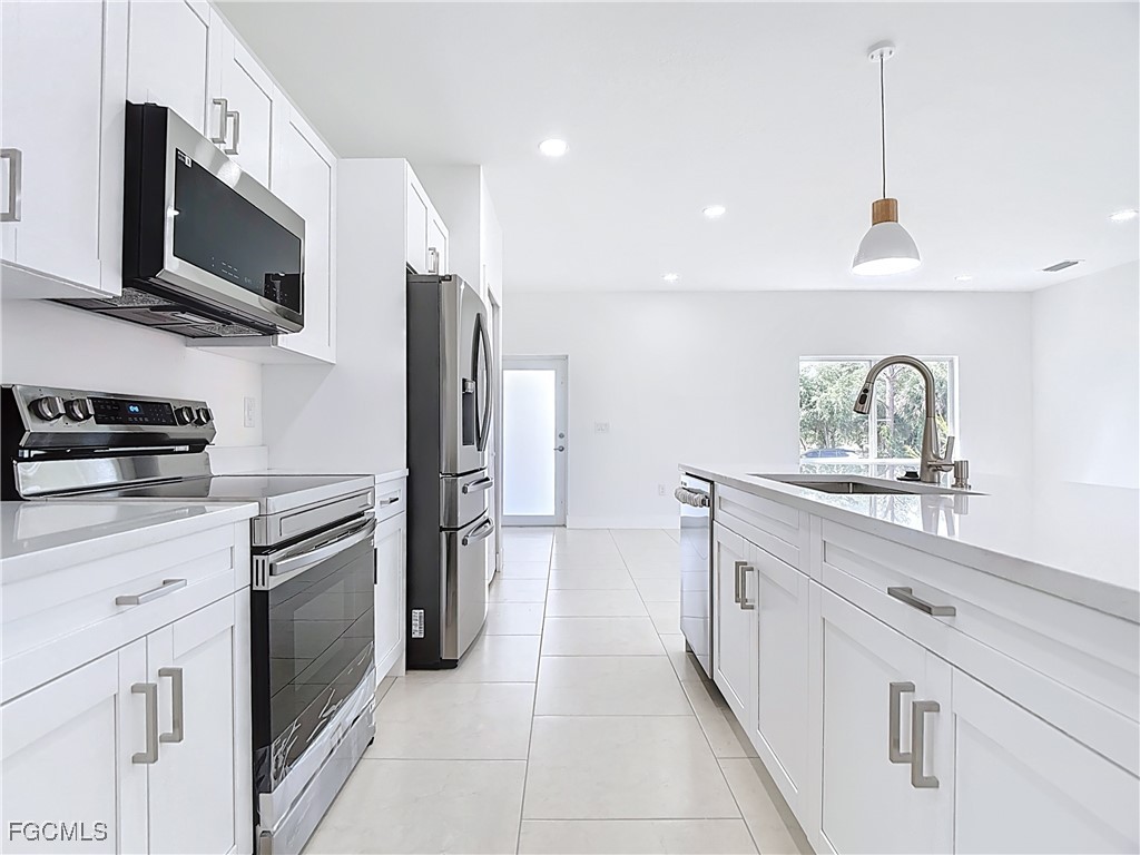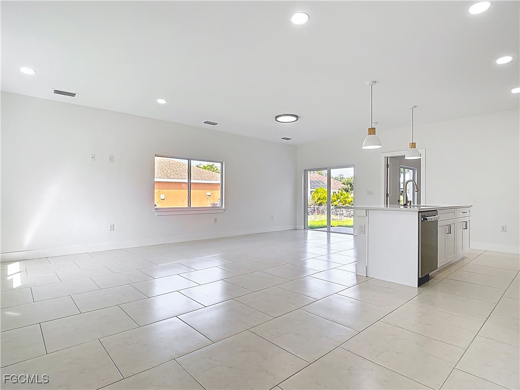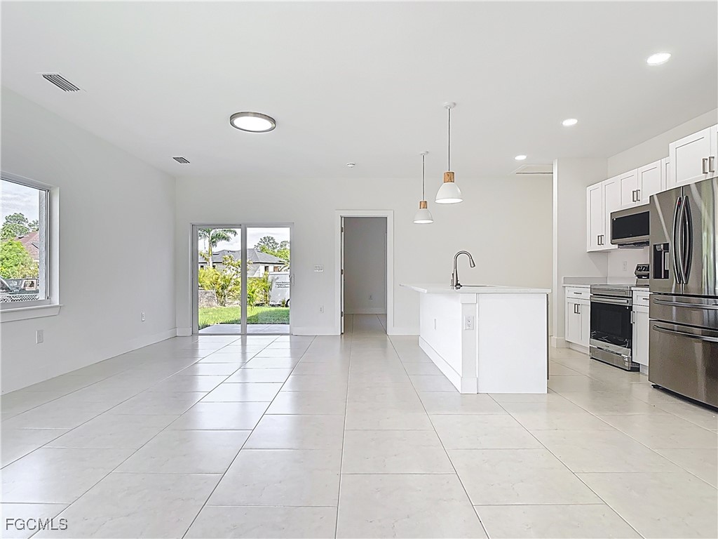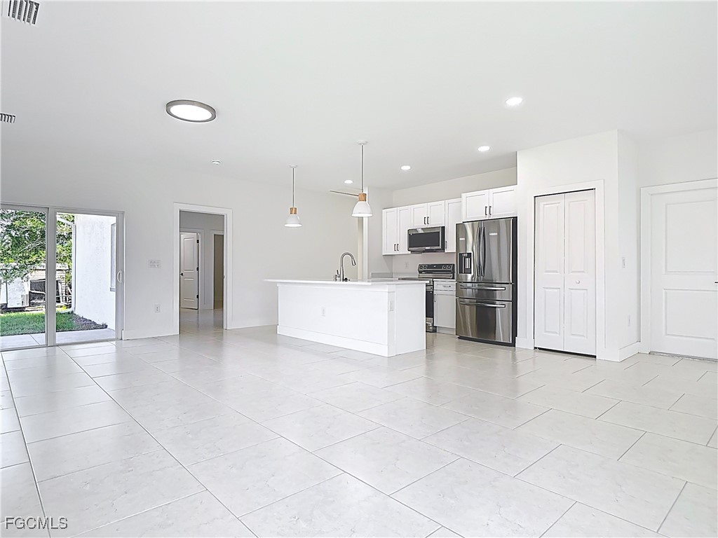 NEW CONSTRUCTION—modern, bright, and move-in ready in Lehigh Acres. This 1,903 sqft residence showcases a true open-concept layout with continuous tile flooring for a clean, cohesive look and effortless care. The designer kitchen takes center stage with sleek quartz waterfall countertops, a functional island, abundant cabinetry, and a full suite of stainless steel appliances—ideal for everyday cooking and easy entertaining.