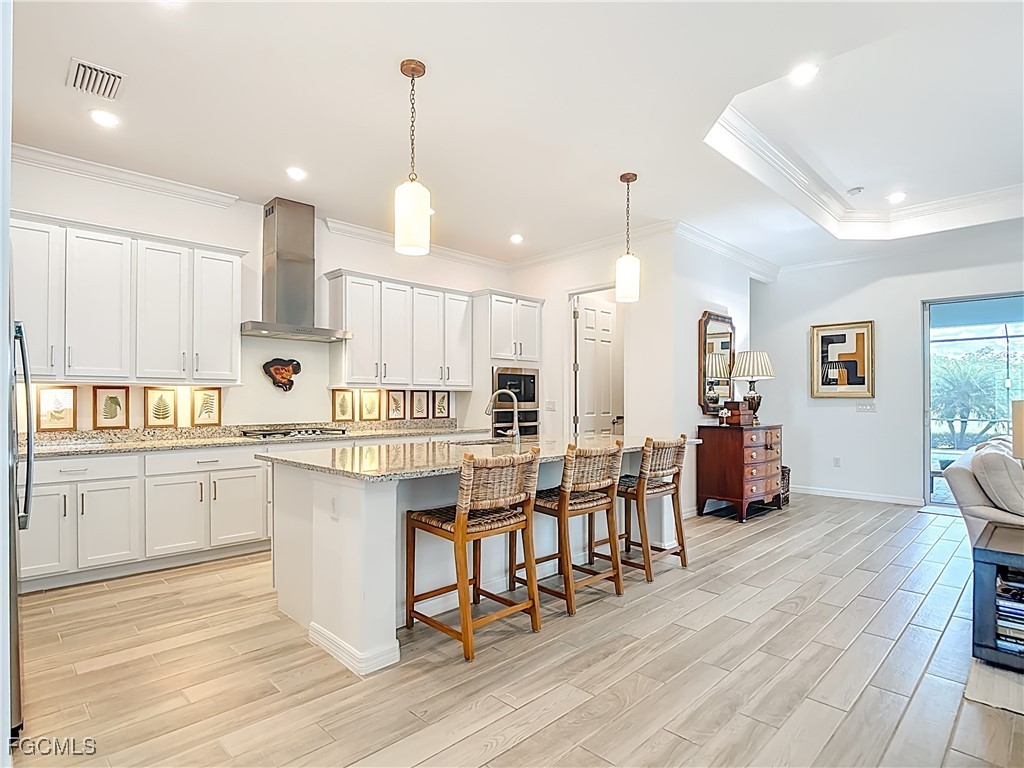 Inside, the primary suite offers a plush king bed and a spa-inspired ensuite bath, while guests can unwind in two beautifully appointed queen bedrooms or on the comfortable pull-out sofa. A dedicated den with built-in desk provides the ideal space for working remotely. The gourmet kitchen with a large center island flows seamlessly into the great room, creating an inviting space for entertaining. Remote-controlled lanai blinds and modern designer finishes elevate the home’s luxurious ambiance.