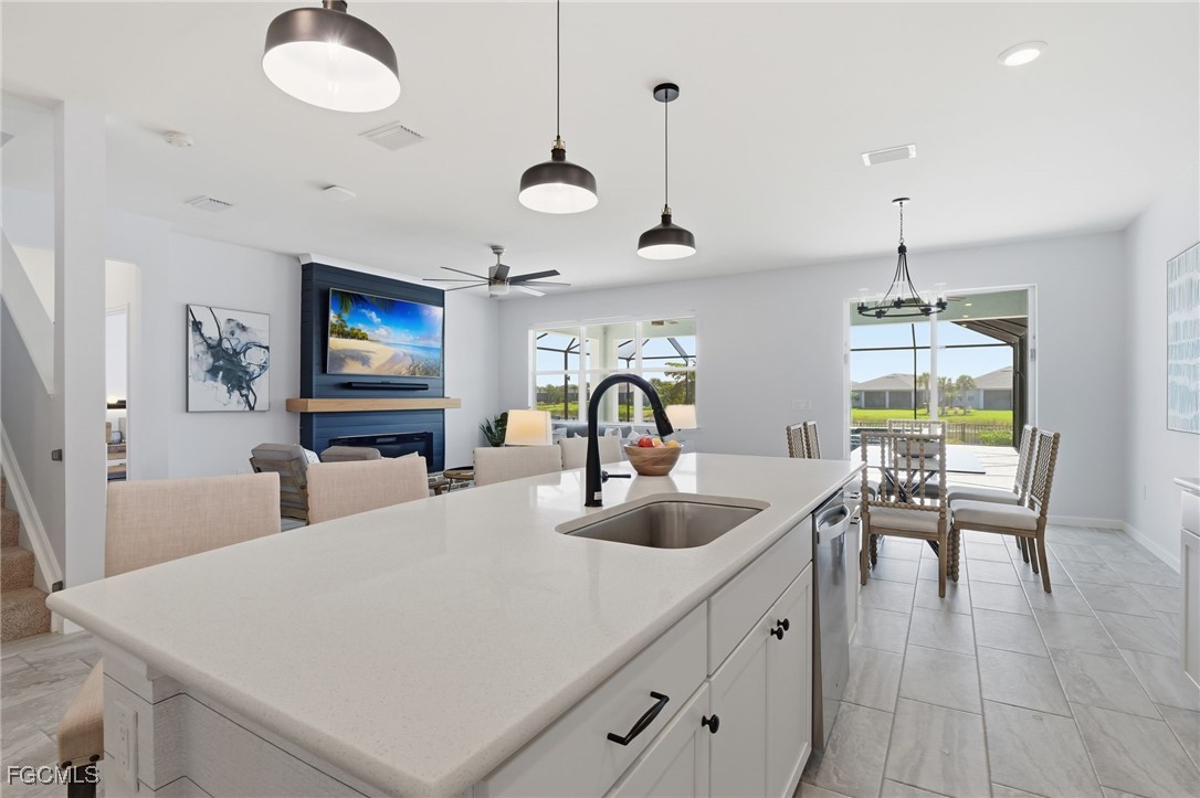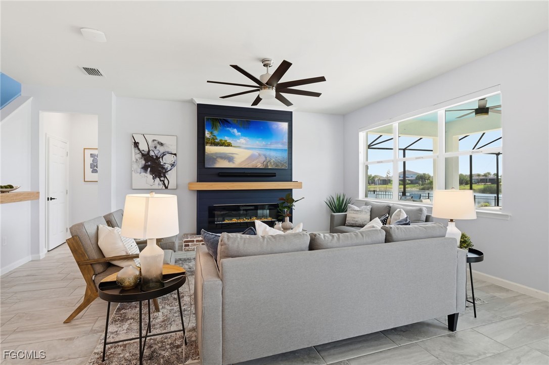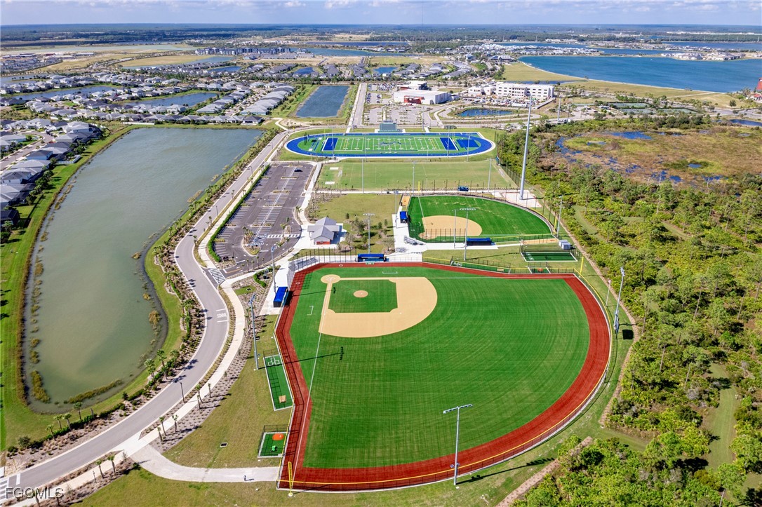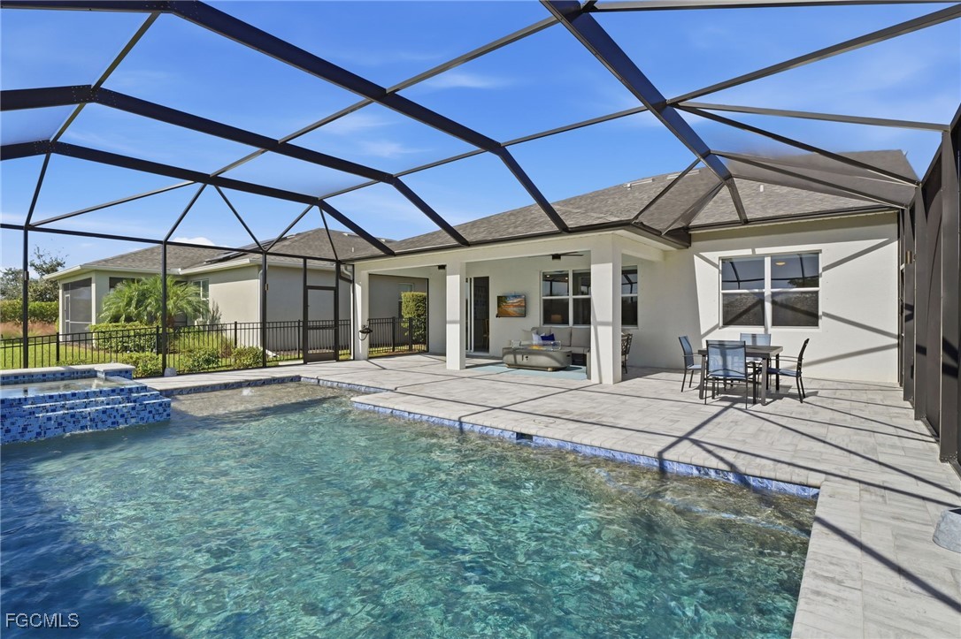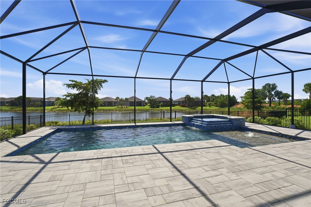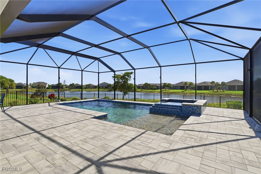 When you enter this stunning Pulte-built Citrus Grove home, featuring four bedrooms and an owner's suite on the main floor, plus a den and loft overlooking the lake, you'll feel right at home! Located at the end of a cul-de-sac. Enjoy beautiful southwest sunset views. Immerse yourself in the luxury of a custom-designed pool featuring a soothing hot tub, a spacious sunshelf perfect for lounging, and intricate mosaic designs that add a touch of artistic elegance. This home boasts beautiful finishes, including an oversized quartz island, gas stove, corner pantry, custom drop zone for shoes and bags, high-end woodwork in the den, a custom fireplace, a tile backsplash, upgraded appliances, and additional upgrades that set this home apart. The downstairs owner's suite has double sinks, a large walk-in custom closet, and a spacious shower with a glass barn door, making it a perfect retreat, while three more bedrooms and a loft on the second floor provide comfort for family or guests. This well-designed home perfectly combines luxury, convenience, and waterfront living. The two-car garage has an epoxy floor and overhead storage. You are conveniently located within walking distance to Founders Square and Telegraph Park, where you can enjoy Food Truck Fridays with live music or Farmer Market Sundays. Babcock Ranch is the first solar-powered town, offers a welcoming community and beautiful nature, and features modern technology, ranking among the top 50 places to live in the United States.