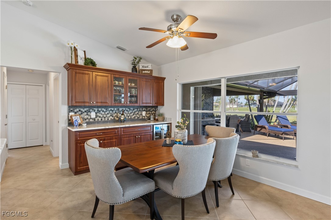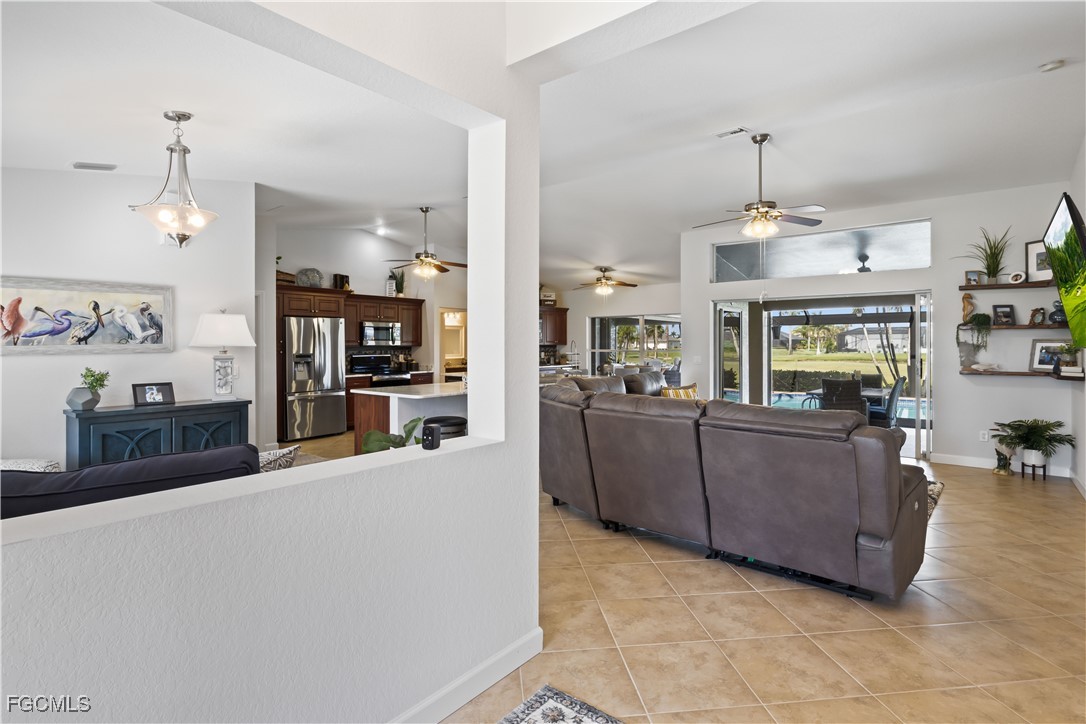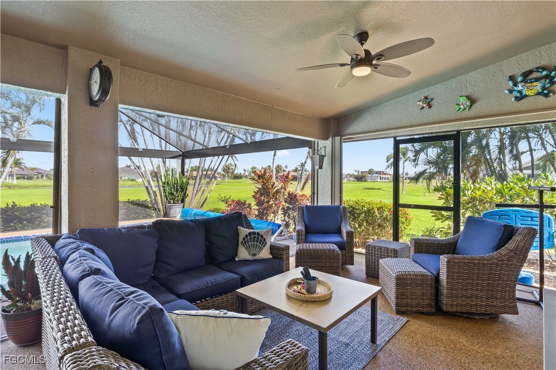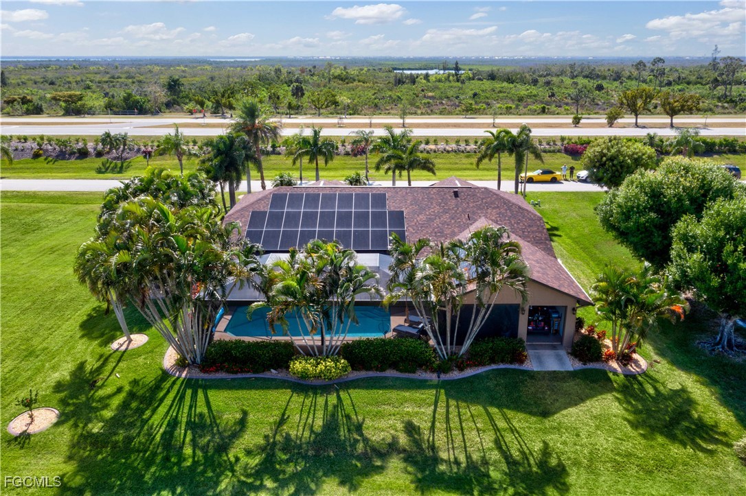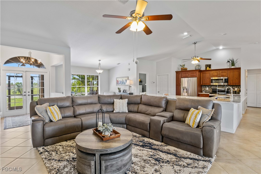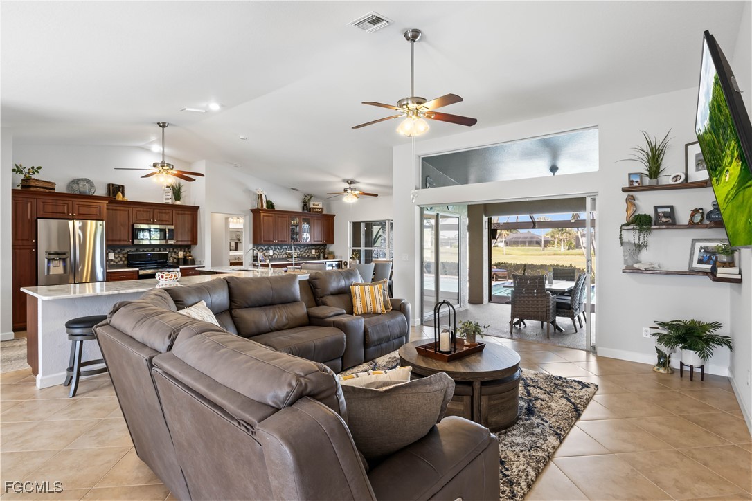 Country Club Living at its Best. This FULLY REMODELED AND BEAUTIFULLY UPDATED home is ready for new owners to move into - Here you will enjoy a beautiful Golf Course Lifestyle with INCREDIBLY LOW COMMUNITY FEES! This wonderful home is absolutely like no other around, boasting a new outdoor living addition onto the back of the house that features a full outside kitchen, a country club inspired television room with a fireplace, a brand new infinity pool cage and as its shining jewel, a double golf cart storage room right off of the King James golf course. The home also features a new and fully remodeled and updated inside kitchen with enormous granite countertops, newly tiled bedroom floors and baseboards, along with new light fixtures inside and out. The residence has 3 bedrooms, 2 full baths. As soon as you arrive, you'll notice the FRESHLY PAINTED EXTERIOR, NEW ROOF, NEWLY RESURFACED POOL, NEW LANDSCAPING, a new culvert system in the enhanced front yard along with all new trees, landscape curbing, new sod and outdoor lighting on the landscaping! STEP INSIDE and be greeted by a wide open concept, vaulted ceilings, freshly painted interior, FORMAL DINING area with extra cabinetry, plus FORMAL LIVING AREA with DOUBLE POCKET SLIDERS heading out to the pool and additional sitting area, all overlooking the LARGE LANAI, GOLF COURSE and even a LAKE. The STUNNING EAT-IN kitchen offers incredible cabinetry with soft close drawers and cabinets, handpicked GRANITE COUNTERTOPS, top of the line STAINLESS APPLIANCES, and an indulgence of beautiful cabinets & counter space. The owners spent over $200,000 in upgrades and remodeling including $40,000 in a completely paid for solar panels that will keep you’re A/C COLD and your pool heater running till your swimming pool is HOT. Best of all, your electrical bills now will be only $27. Instead of over $400. Cape Royal, with 27 holes of championship golf also offers BOCCE & PICKLEBALL, CORN HOLE, and TENNIS, plus the Caloosa Club RESTAURANT ~ open for breakfast/lunch/dinner ~ all for just over $100 per month!!! Unheard of!! You will also appreciate the lower taxes that you will be paying in comparison with most of Cape Coral as Cape Royal is located in unincorporated Lee County! Just off the Pine Island Corridor - you'll appreciate the dining & shopping options just outside the community gates! INCREDIBLE HOME, LOCATION AND COMMUNITY!