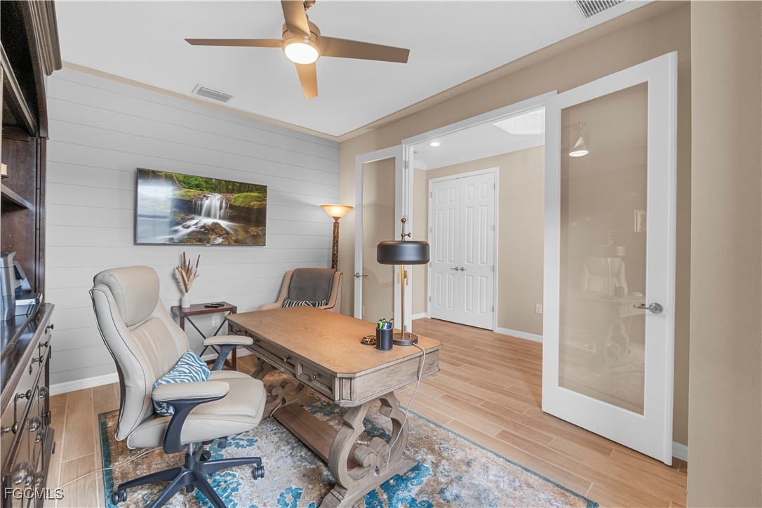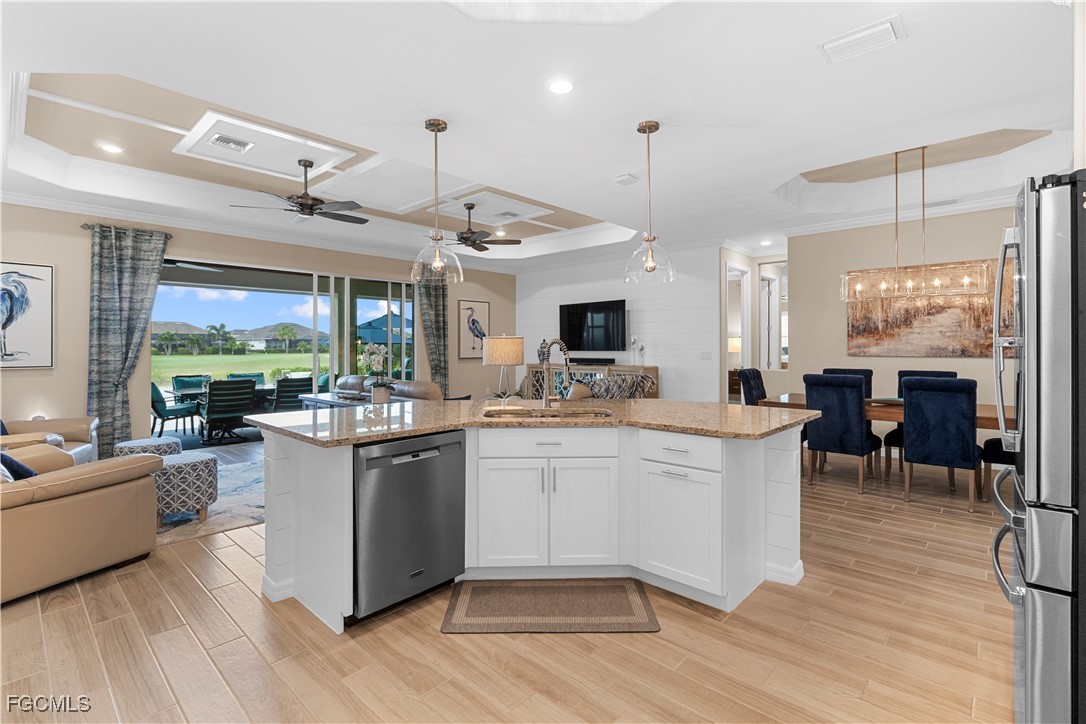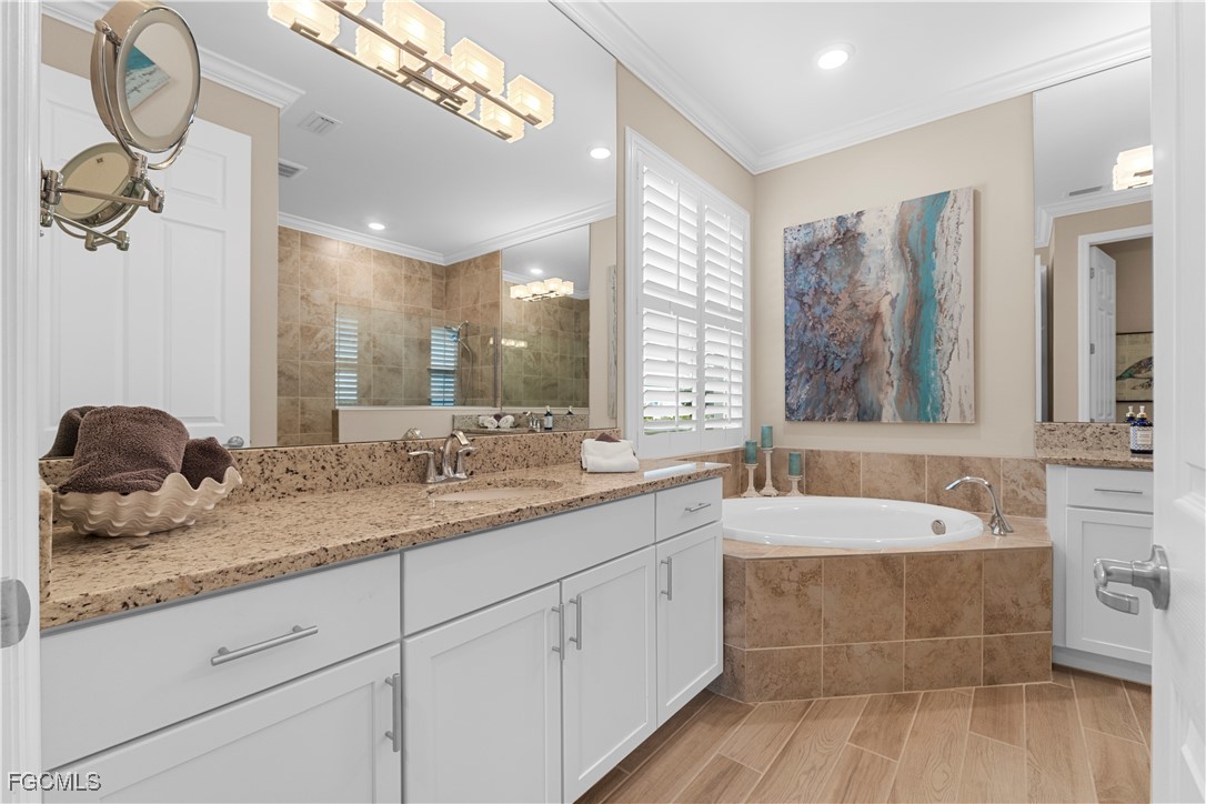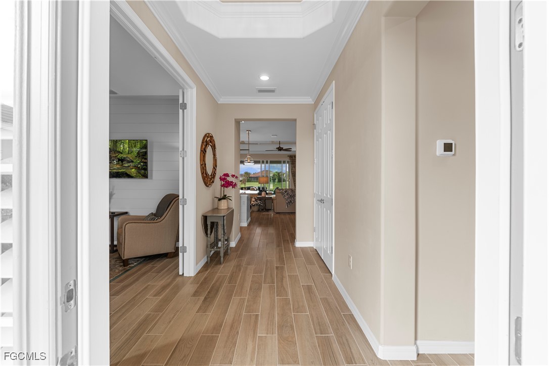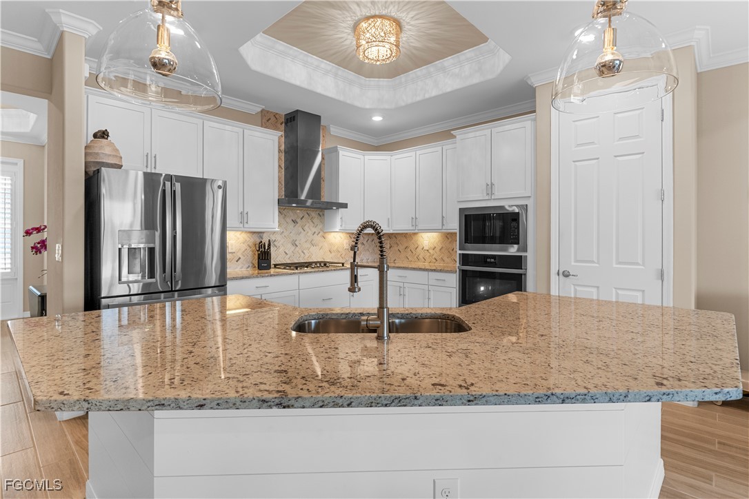 Absolutely gorgeous chef kitchen with GE profile French door refrigerator and 42 inch cabinets, full shaker overlay and huge kitchen island with walk-in pantry. Plank tile flooring and crown molding throughout the entire house with NO CARPET. Included in the sale are the mounted TVs and wall-mount systems in the great room, den, and lanai.