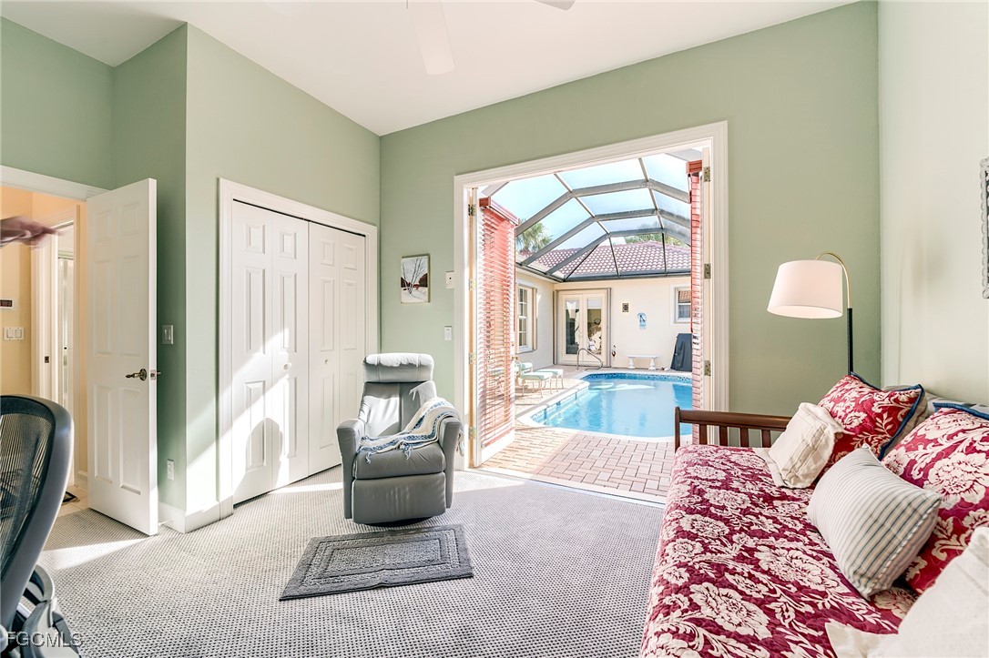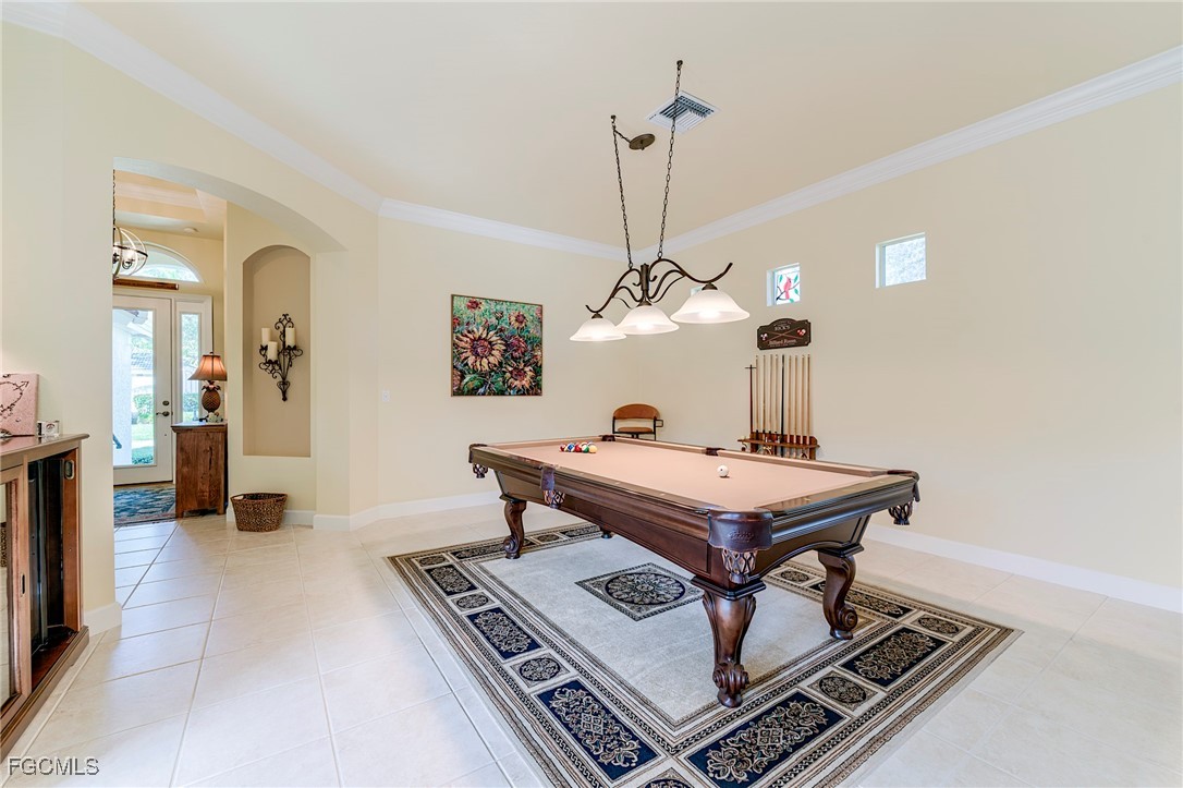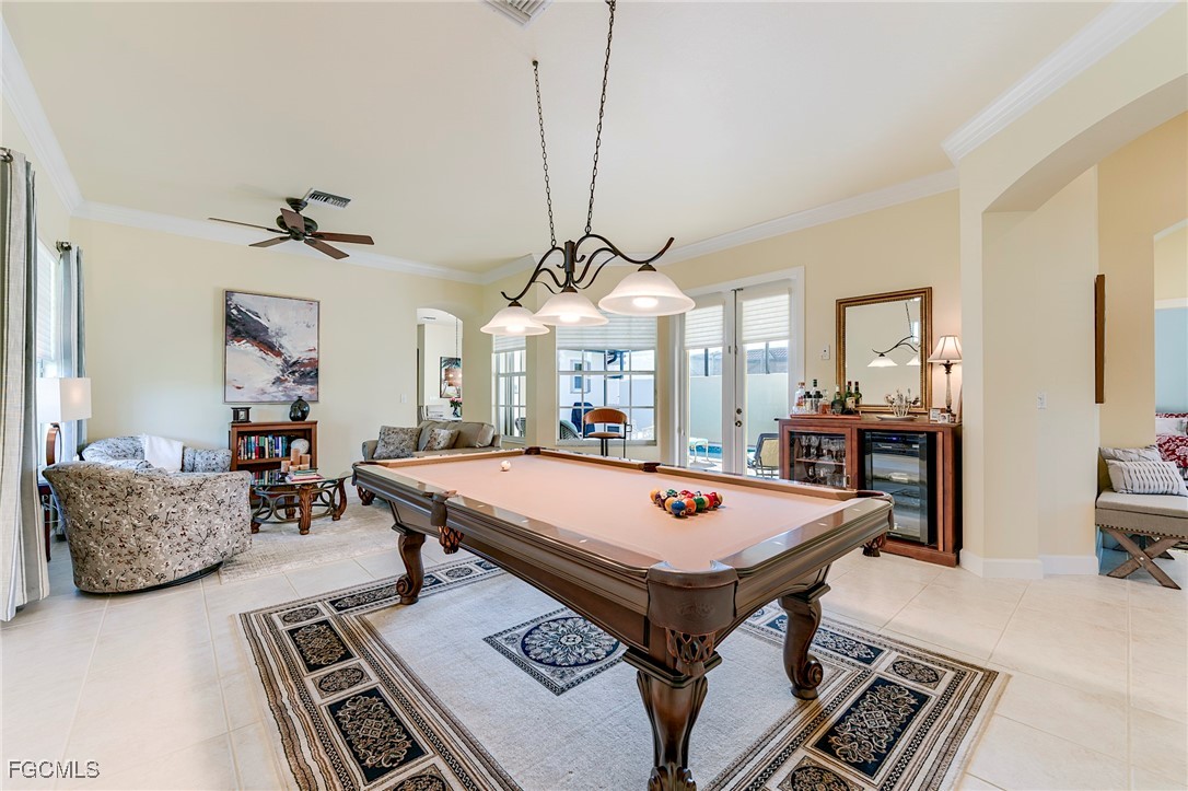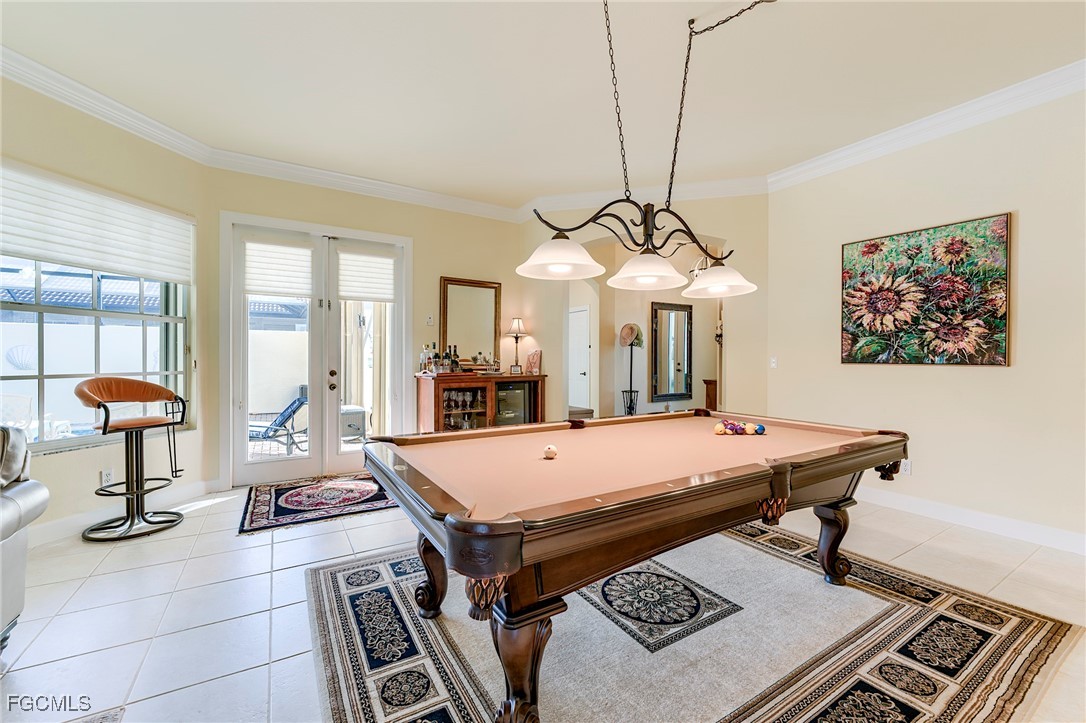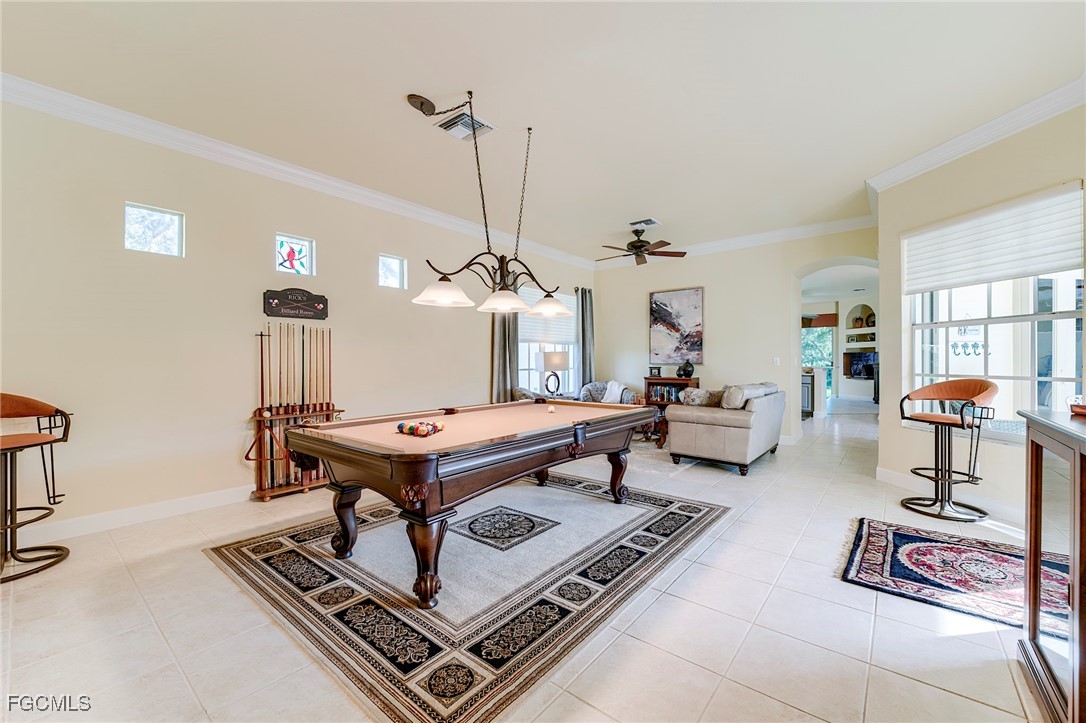 Roof, to kitchen, to pool, and even the garage floor - this house is extremely well updated!. And it is totally storm protected at all windows. The 3/3 courtyard home sits on a beautiful lakefront lot with wonderful aquatic bird watching from the open quartz kitchen and family room area. The formal living room, also with pool access, is currently used as a billiard room.This floorplan allows both the primary bedroom and bedroom #2 have en-suite baths, so #2 doubles as a "second primary". Bedroom #3 has pool access and also shares the full pool bath. The freshly resurfaced salt water pool has a new pump and electric heater, and is accessible from most every room in the house. The house was painted inside and out in 2025, and the new roof and gutters this year as well. A water softener, water heater, new lanai screens, washer/dryer, dishwasher and more were new in the last 2 years or less. The garage floor has a beautiful new high-tech polymer non-slip surface. See the Home Info Sheet in the attachments for full update details. The HOA is very well run with low quarterly fees providing all lawn maintenance on a weekly schedule, 24x7 attended gated access, a community pool, hot tub, 4 Har-Tru tennis courts, and well-equipped fitness center open 24x7. Comcast fiber-optic cable and the Xfinity X1 platform with up to 4 TV/DVR boxes, and high-speed Wi-Fi Internet are all part of the dues - over a $750 quarterly value at retail. Social (for Club restaurant access) or golf membership at The Golf Club at Crown Colony is optional. And there is no waitlist for membership! This Club was chosen for the 2022 LPGA $1.5M Drive-On Championship, hosting the world's top women golfers, and is also used for PGA qualifying events.