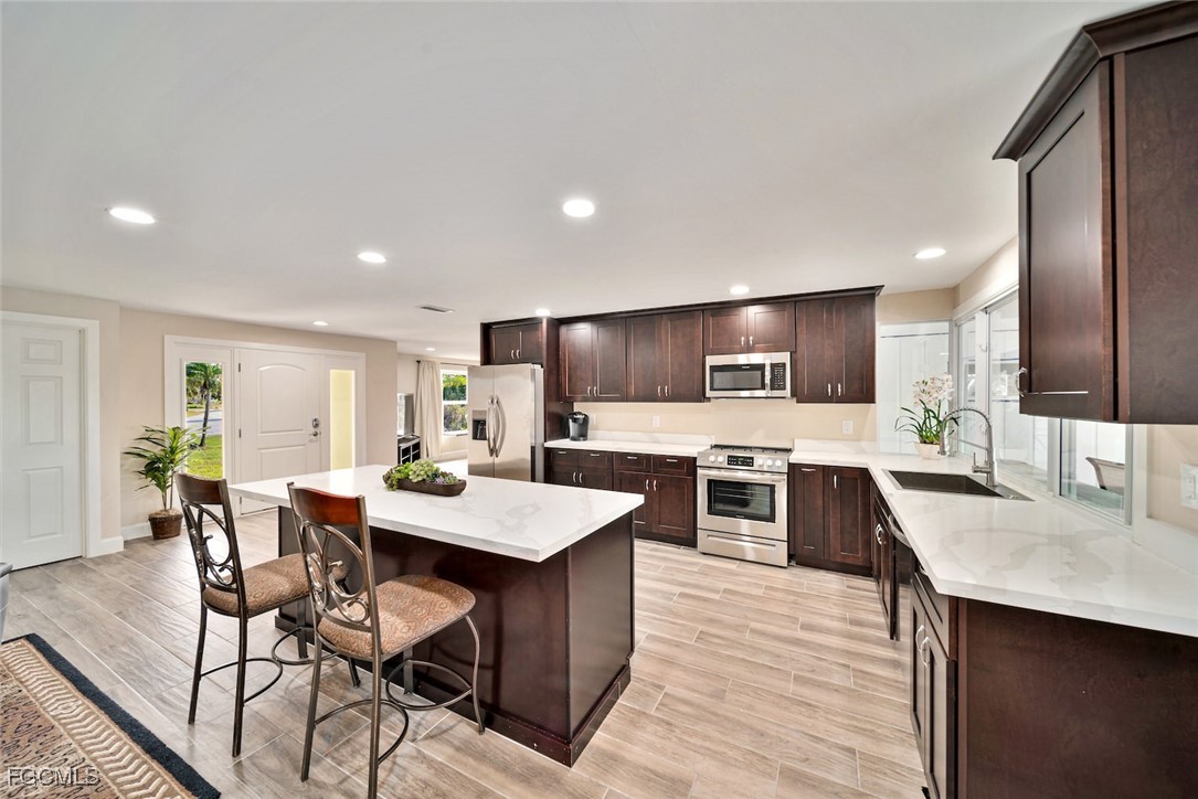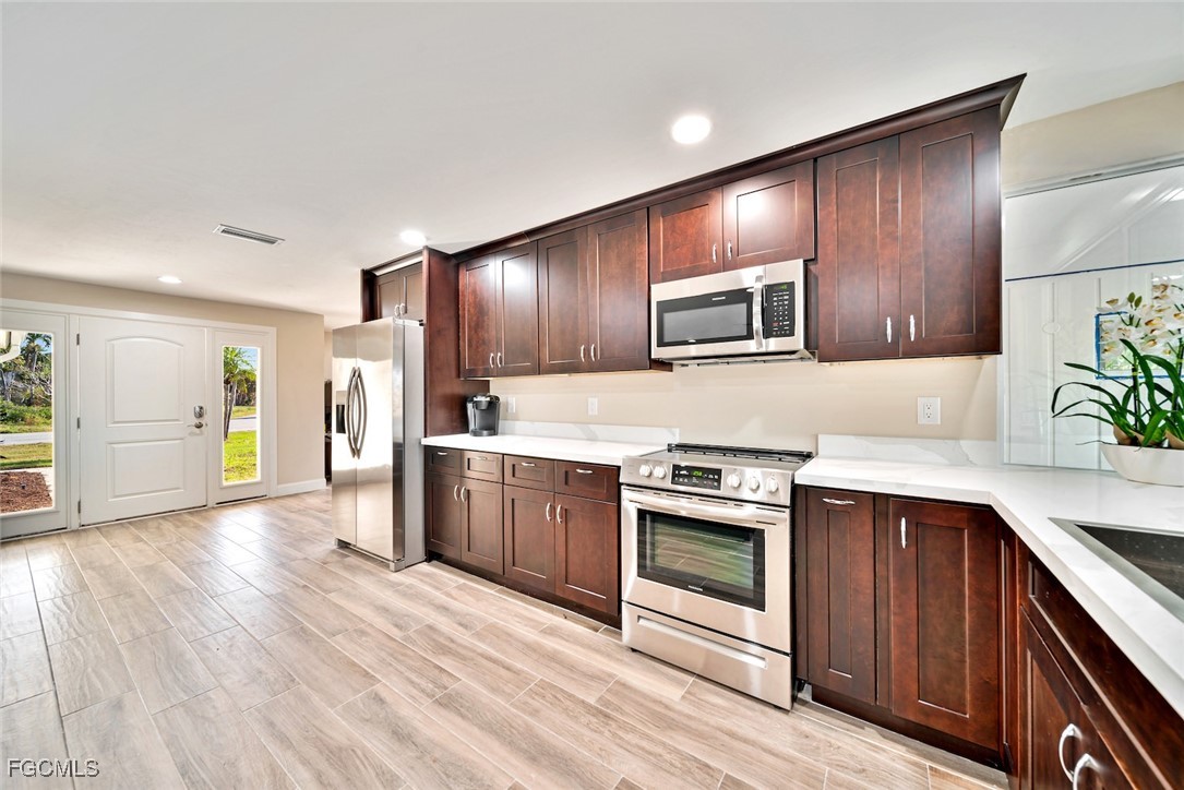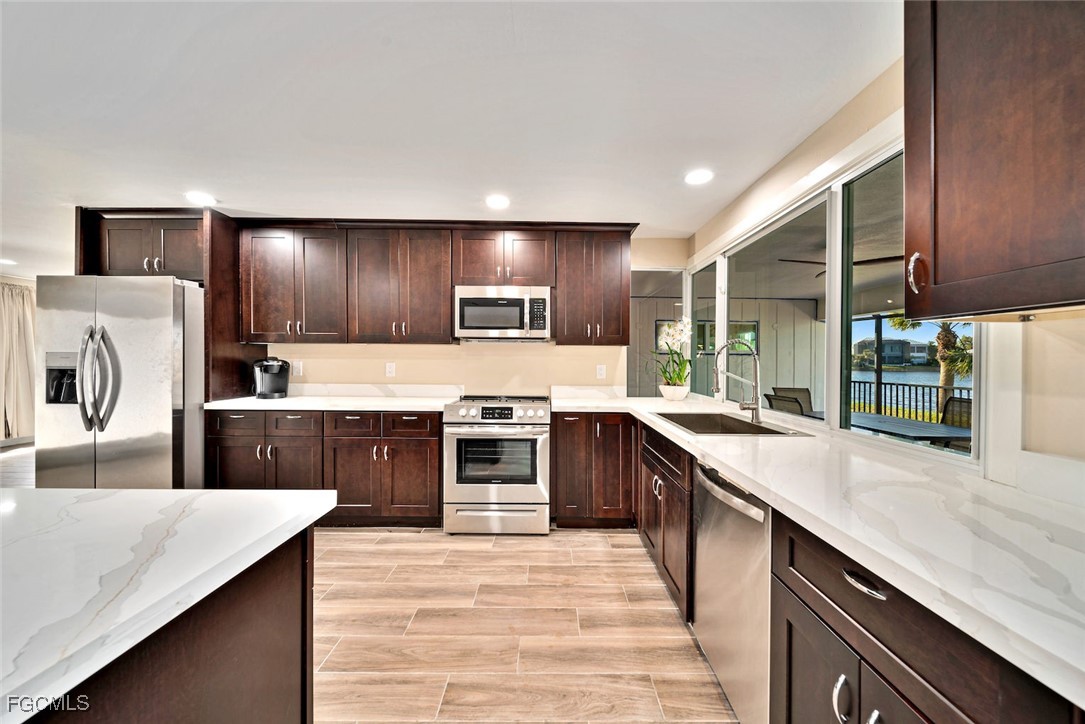 Inside, you'll find tile floors, quartz countertops, and brand-new appliances. Impact windows frame picturesque views and bring in abundant natural light. Enjoy the spacious layout that provides privacy with a split floor plan for both homeowners and guests.