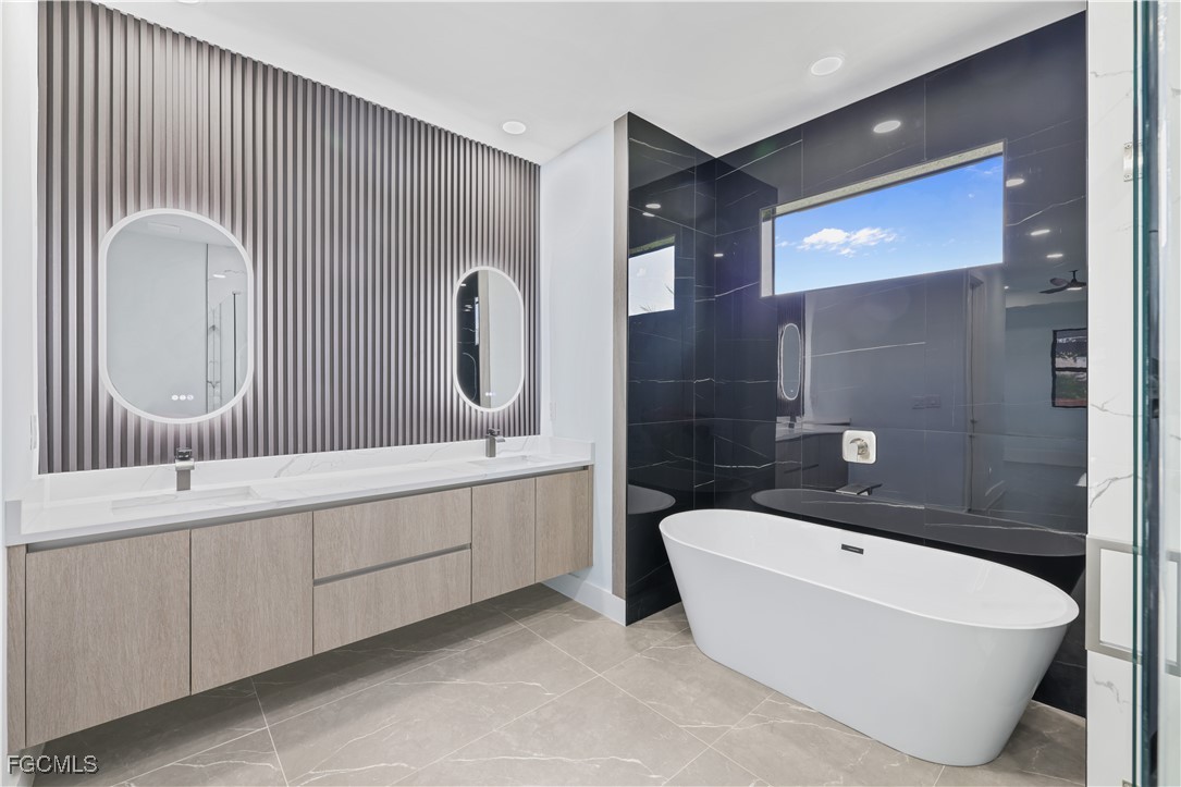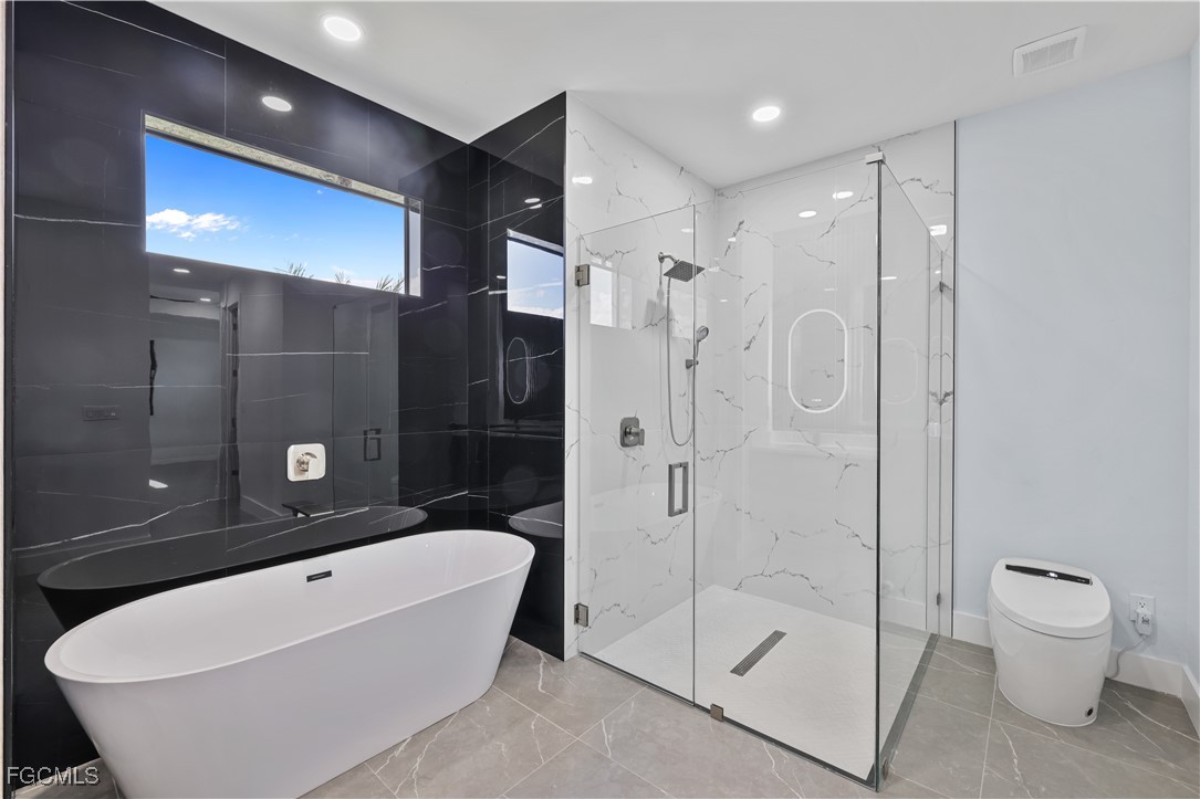 The primary suite includes dual walk-in closets and a spa-style bathroom with a freestanding tub and rainfall shower.