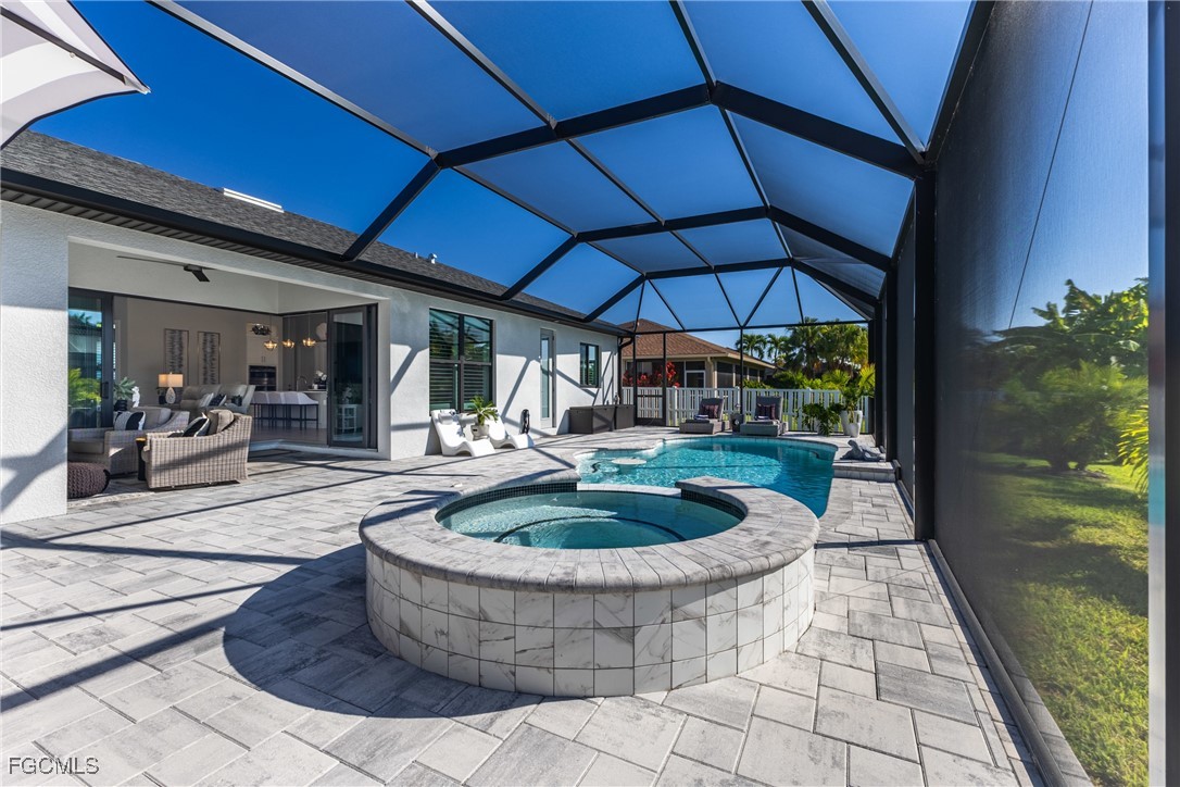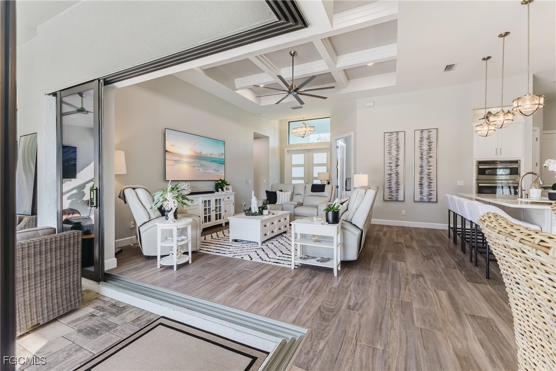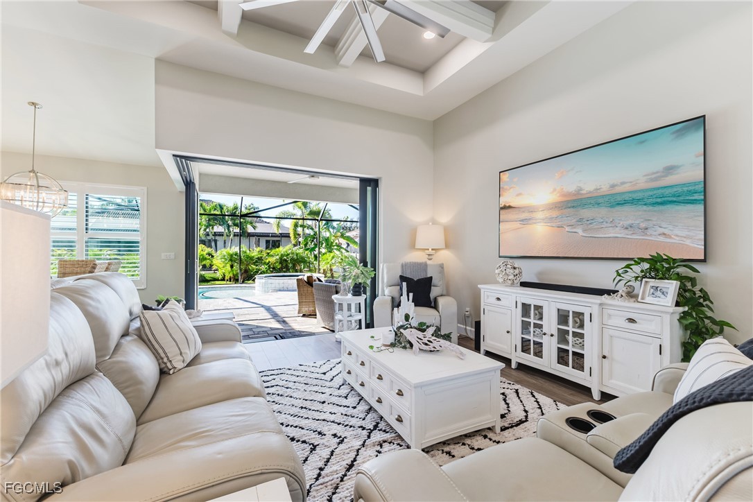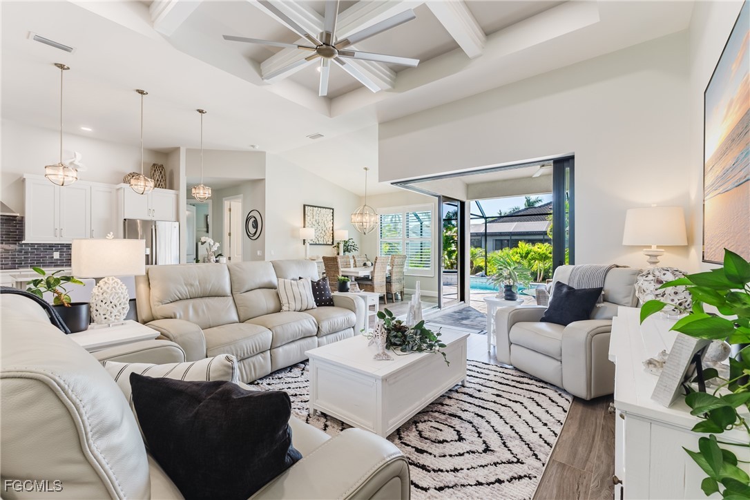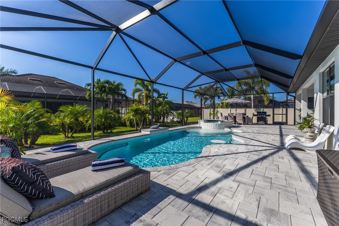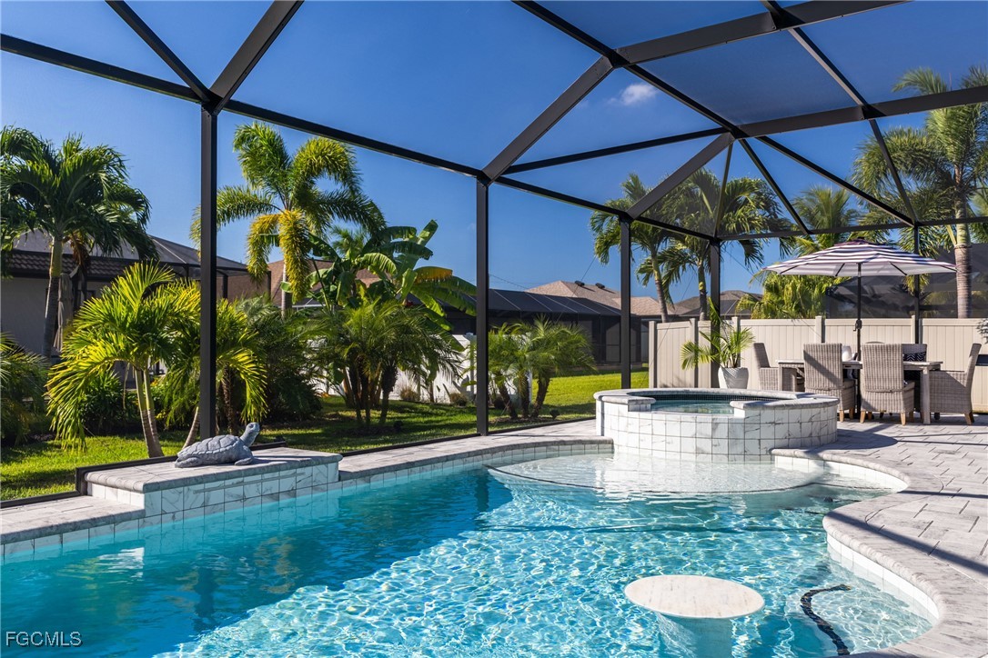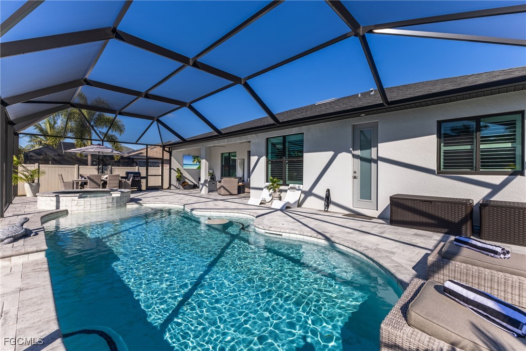 Stunning contemporary home showcasing pristine finishes, sophisticated design, and exceptional craftsmanship throughout. This beautifully appointed 3-bedroom + den, 2-bath property features a spacious open-concept layout with soaring ceilings, elegant lighted niches, and dramatic zero-corner impact sliding glass doors that create a seamless blend of indoor and outdoor living. The great room is anchored by a striking custom illuminated coffered ceiling that elevates the home’s modern aesthetic. The gourmet kitchen offers refined quartz countertops, premium GE Profile appliances, an induction cooktop, built-in range and microwave, and a “Closets By Design" custom walk-in pantry—a perfectly curated space for everyday living and entertaining. Sleek, upgraded tile flooring extends throughout the home for a clean, cohesive flow. The luxurious primary suite serves as a private retreat, featuring two “Closets By Design" custom walk-in closets, plantation shutters, and a tray ceiling. The spa-style ensuite includes a spacious car-wash-style shower and high-end finishes for a truly indulgent experience. Guest bedrooms each feature custom accent walls, plantation shutters, and thoughtful design details that enhance comfort and style. The south-facing backyard is an exceptional outdoor oasis, highlighted by a 2024 custom heated saltwater pool and spa with smart-app controls, fountain feature, in-pool table and bench, sun shelf, and pool bath. The expansive lanai spans the full width of the home, offering abundant space for outdoor dining, lounging, and entertaining. A spacious three-car garage with epoxy flooring and utility tub adds both practicality and premium appeal. Additional upgrades include impact windows and doors, an elegant brick-paver driveway, full paver pool surround, professional tropical landscaping with 12 mature palm trees, Built in safe, and an in-ground sprinkler system. Located in the highly sought-after Surfside area of SW Cape Coral, this home offers quick access to Veterans Pkwy and places you just minutes from Cape Coral’s best shopping, dining, and entertainment. This home delivers elevated style, comfort, and quality in every detail—schedule your private showing today!