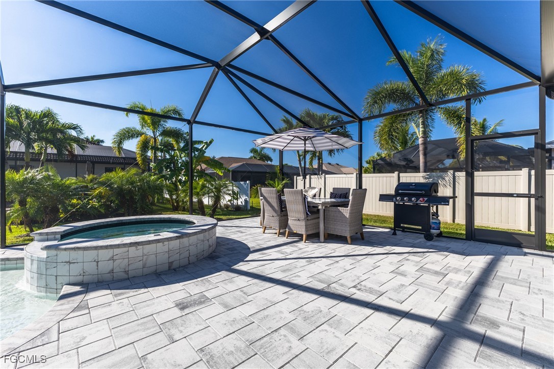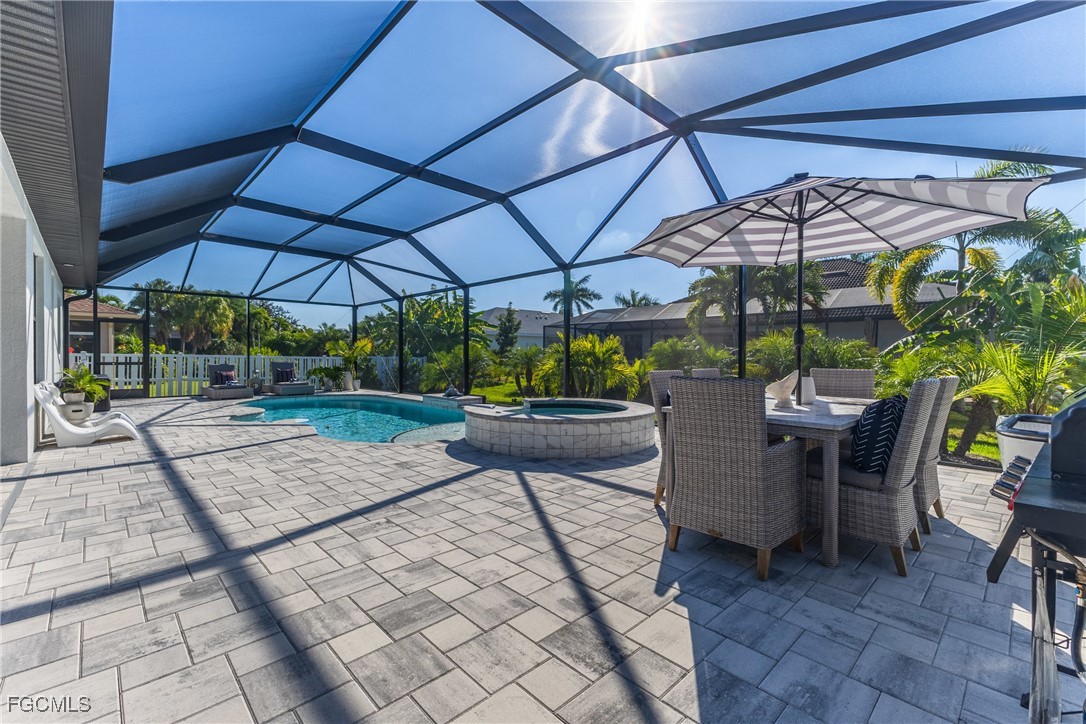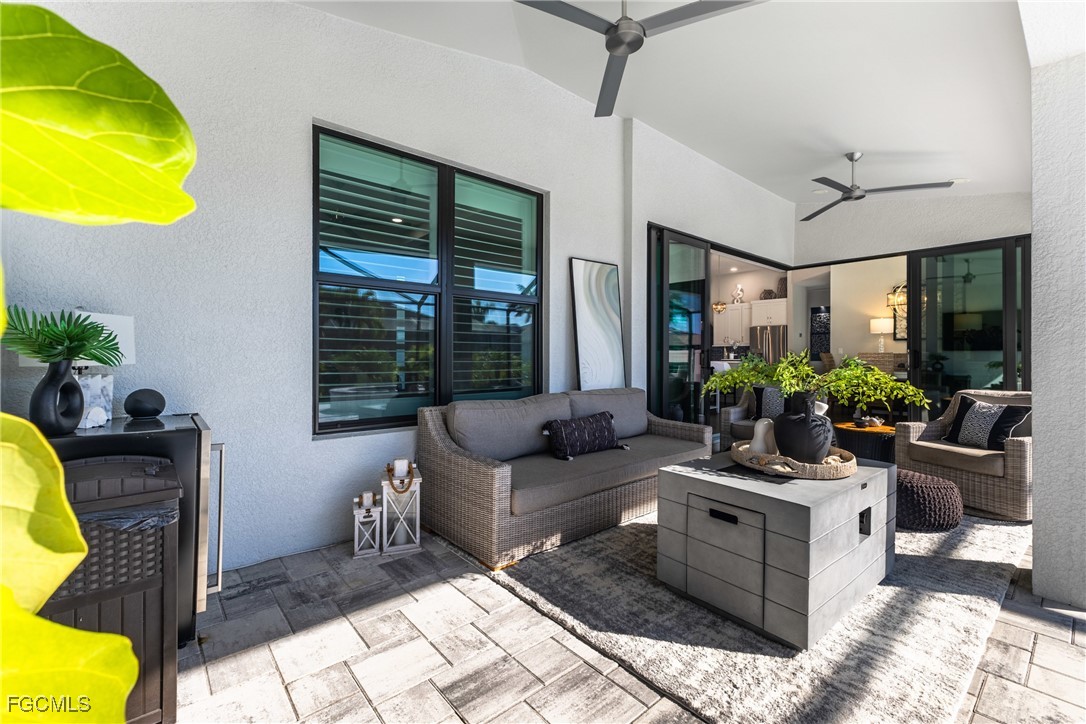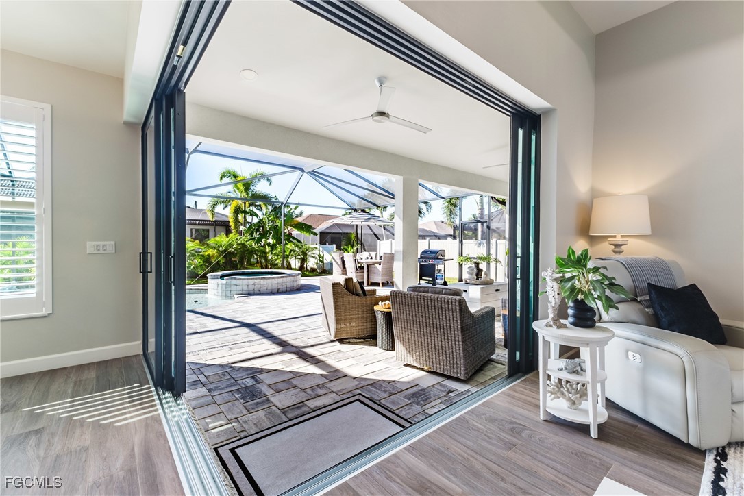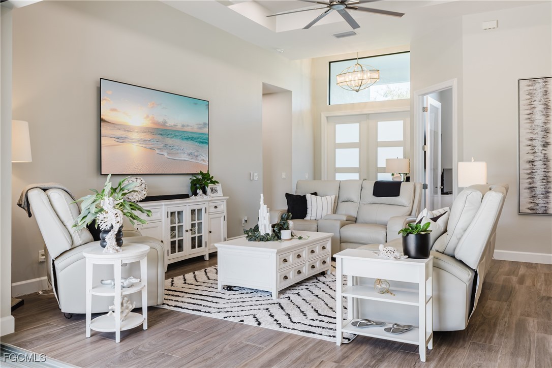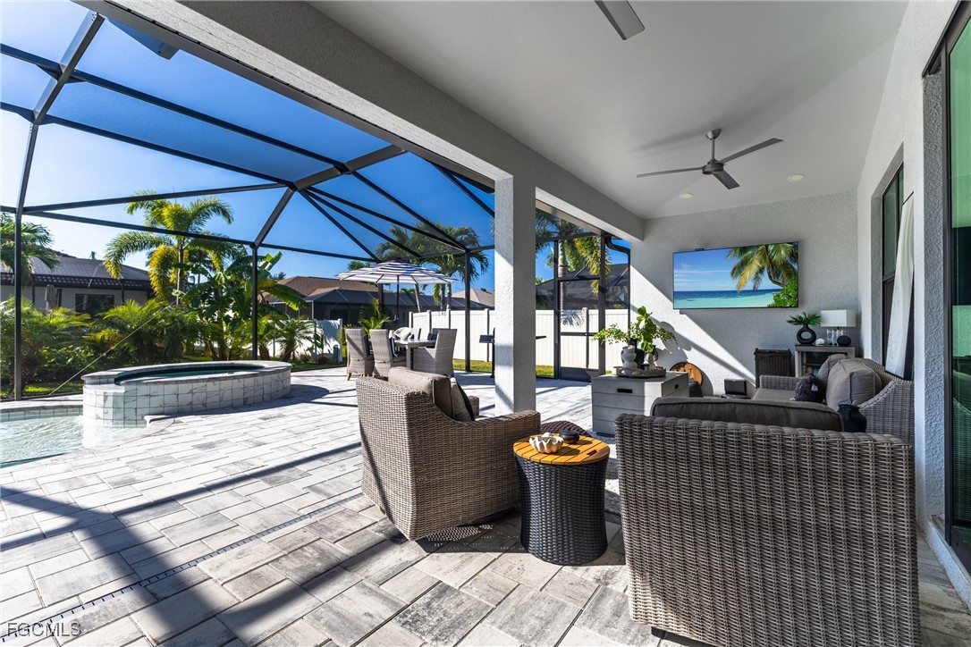 Stunning contemporary home showcasing pristine finishes, sophisticated design, and exceptional craftsmanship throughout. This beautifully appointed 3-bedroom + den, 2-bath property features a spacious open-concept layout with soaring ceilings, elegant lighted niches, and dramatic zero-corner impact sliding glass doors that create a seamless blend of indoor and outdoor living. The great room is anchored by a striking custom illuminated coffered ceiling that elevates the home’s modern aesthetic. The gourmet kitchen offers refined quartz countertops, premium GE Profile appliances, an induction cooktop, built-in range and microwave, and a “Closets By Design" custom walk-in pantry—a perfectly curated space for everyday living and entertaining. Sleek, upgraded tile flooring extends throughout the home for a clean, cohesive flow. The luxurious primary suite serves as a private retreat, featuring two “Closets By Design" custom walk-in closets, plantation shutters, and a tray ceiling. The spa-style ensuite includes a spacious car-wash-style shower and high-end finishes for a truly indulgent experience. Guest bedrooms each feature custom accent walls, plantation shutters, and thoughtful design details that enhance comfort and style. The south-facing backyard is an exceptional outdoor oasis, highlighted by a 2024 custom heated saltwater pool and spa with smart-app controls, fountain feature, in-pool table and bench, sun shelf, and pool bath. The expansive lanai spans the full width of the home, offering abundant space for outdoor dining, lounging, and entertaining. A spacious three-car garage with epoxy flooring and utility tub adds both practicality and premium appeal. Additional upgrades include impact windows and doors, an elegant brick-paver driveway, full paver pool surround, professional tropical landscaping with 12 mature palm trees, Built in safe, and an in-ground sprinkler system. Located in the highly sought-after Surfside area of SW Cape Coral, this home offers quick access to Veterans Pkwy and places you just minutes from Cape Coral’s best shopping, dining, and entertainment. This home delivers elevated style, comfort, and quality in every detail—schedule your private showing today!