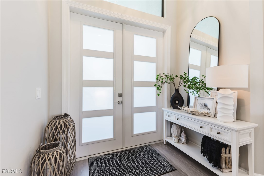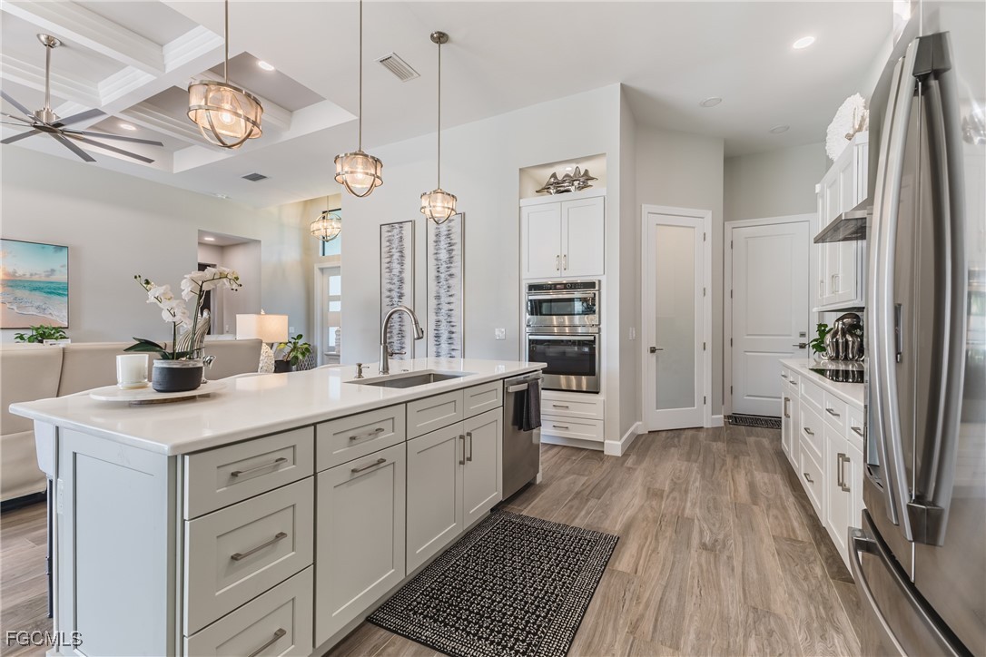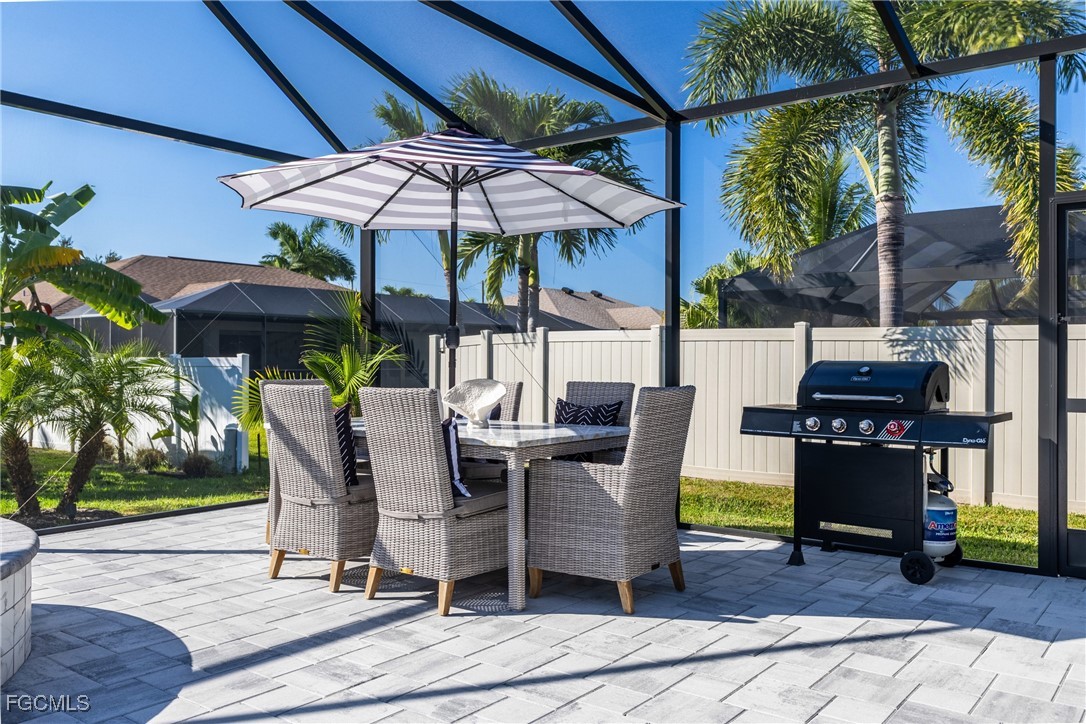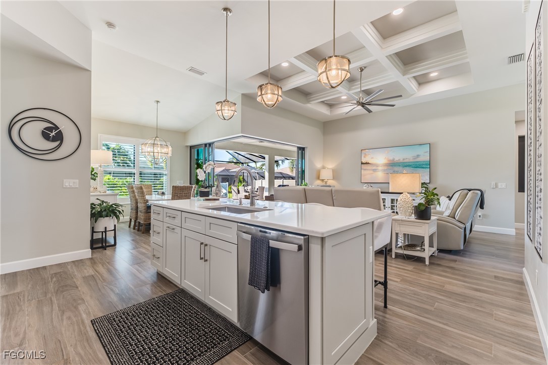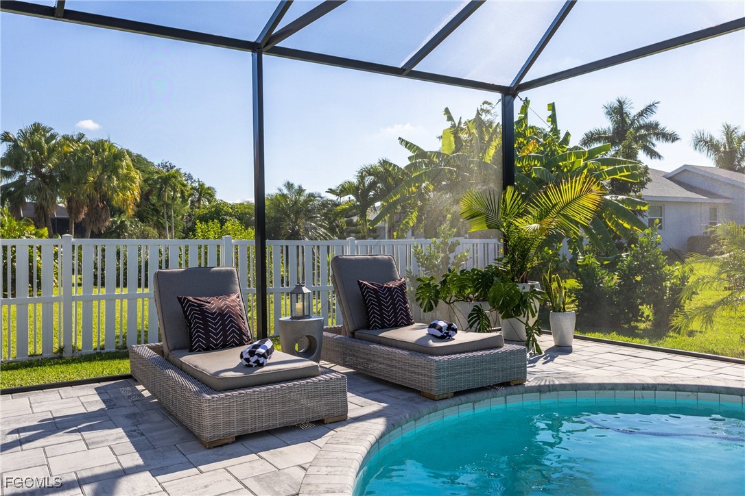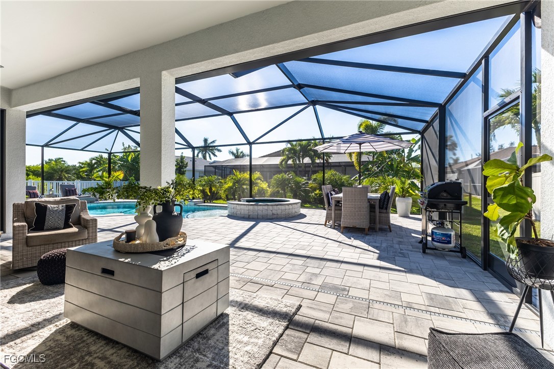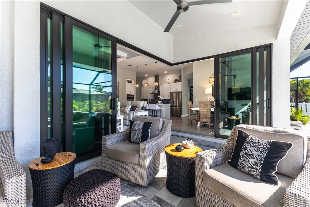 Stunning contemporary home showcasing pristine finishes, sophisticated design, and exceptional craftsmanship throughout. This beautifully appointed 3-bedroom + den, 2-bath property features a spacious open-concept layout with soaring ceilings, elegant lighted niches, and dramatic zero-corner impact sliding glass doors that create a seamless blend of indoor and outdoor living. The great room is anchored by a striking custom illuminated coffered ceiling that elevates the home’s modern aesthetic. The gourmet kitchen offers refined quartz countertops, premium GE Profile appliances, an induction cooktop, built-in range and microwave, and a “Closets By Design" custom walk-in pantry—a perfectly curated space for everyday living and entertaining. Sleek, upgraded tile flooring extends throughout the home for a clean, cohesive flow. The luxurious primary suite serves as a private retreat, featuring two “Closets By Design" custom walk-in closets, plantation shutters, and a tray ceiling. The spa-style ensuite includes a spacious car-wash-style shower and high-end finishes for a truly indulgent experience. Guest bedrooms each feature custom accent walls, plantation shutters, and thoughtful design details that enhance comfort and style. The south-facing backyard is an exceptional outdoor oasis, highlighted by a 2024 custom heated saltwater pool and spa with smart-app controls, fountain feature, in-pool table and bench, sun shelf, and pool bath. The expansive lanai spans the full width of the home, offering abundant space for outdoor dining, lounging, and entertaining. A spacious three-car garage with epoxy flooring and utility tub adds both practicality and premium appeal. Additional upgrades include impact windows and doors, an elegant brick-paver driveway, full paver pool surround, professional tropical landscaping with 12 mature palm trees, Built in safe, and an in-ground sprinkler system. Located in the highly sought-after Surfside area of SW Cape Coral, this home offers quick access to Veterans Pkwy and places you just minutes from Cape Coral’s best shopping, dining, and entertainment. This home delivers elevated style, comfort, and quality in every detail—schedule your private showing today!