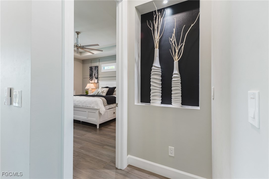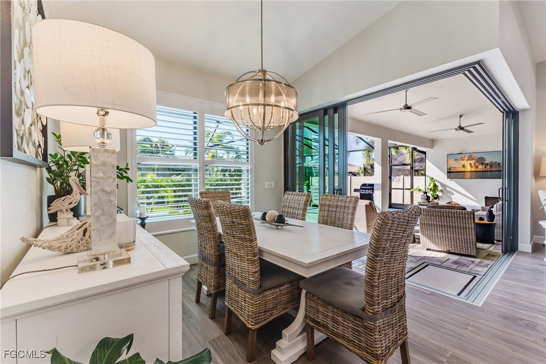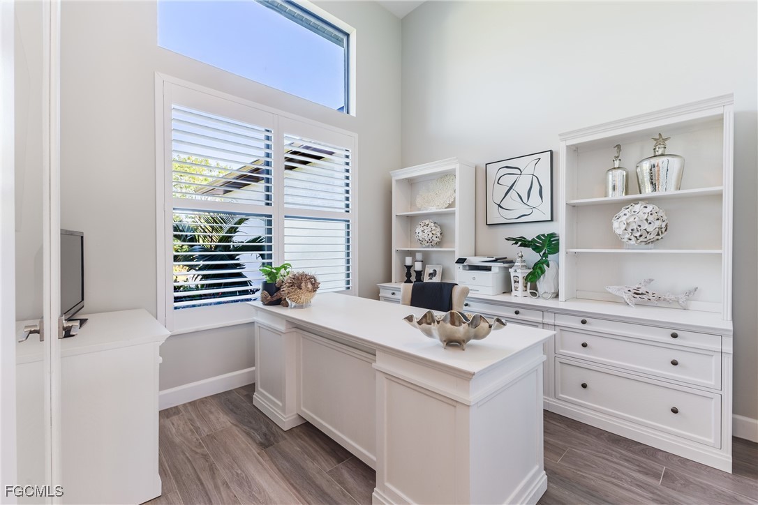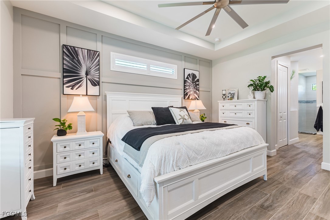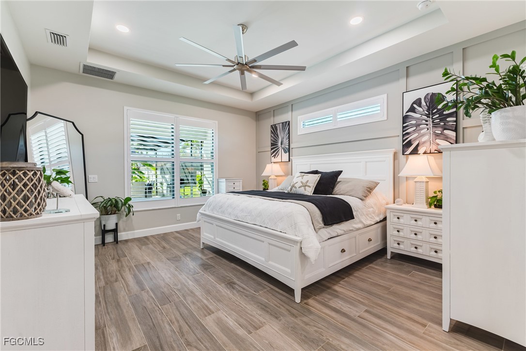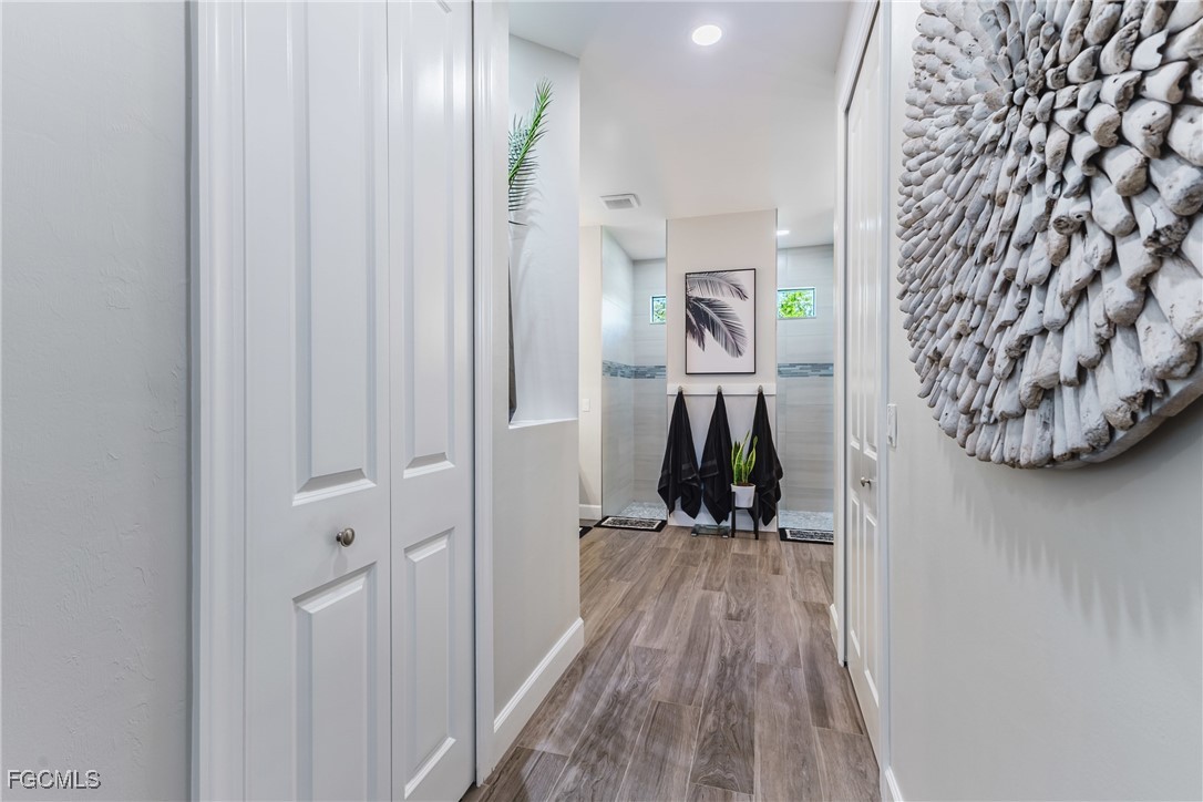 Stunning contemporary home showcasing pristine finishes, sophisticated design, and exceptional craftsmanship throughout. This beautifully appointed 3-bedroom + den, 2-bath property features a spacious open-concept layout with soaring ceilings, elegant lighted niches, and dramatic zero-corner impact sliding glass doors that create a seamless blend of indoor and outdoor living. The great room is anchored by a striking custom illuminated coffered ceiling that elevates the home’s modern aesthetic. The gourmet kitchen offers refined quartz countertops, premium GE Profile appliances, an induction cooktop, built-in range and microwave, and a “Closets By Design" custom walk-in pantry—a perfectly curated space for everyday living and entertaining. Sleek, upgraded tile flooring extends throughout the home for a clean, cohesive flow. The luxurious primary suite serves as a private retreat, featuring two “Closets By Design" custom walk-in closets, plantation shutters, and a tray ceiling. The spa-style ensuite includes a spacious car-wash-style shower and high-end finishes for a truly indulgent experience. Guest bedrooms each feature custom accent walls, plantation shutters, and thoughtful design details that enhance comfort and style. The south-facing backyard is an exceptional outdoor oasis, highlighted by a 2024 custom heated saltwater pool and spa with smart-app controls, fountain feature, in-pool table and bench, sun shelf, and pool bath. The expansive lanai spans the full width of the home, offering abundant space for outdoor dining, lounging, and entertaining. A spacious three-car garage with epoxy flooring and utility tub adds both practicality and premium appeal. Additional upgrades include impact windows and doors, an elegant brick-paver driveway, full paver pool surround, professional tropical landscaping with 12 mature palm trees, Built in safe, and an in-ground sprinkler system. Located in the highly sought-after Surfside area of SW Cape Coral, this home offers quick access to Veterans Pkwy and places you just minutes from Cape Coral’s best shopping, dining, and entertainment. This home delivers elevated style, comfort, and quality in every detail—schedule your private showing today!