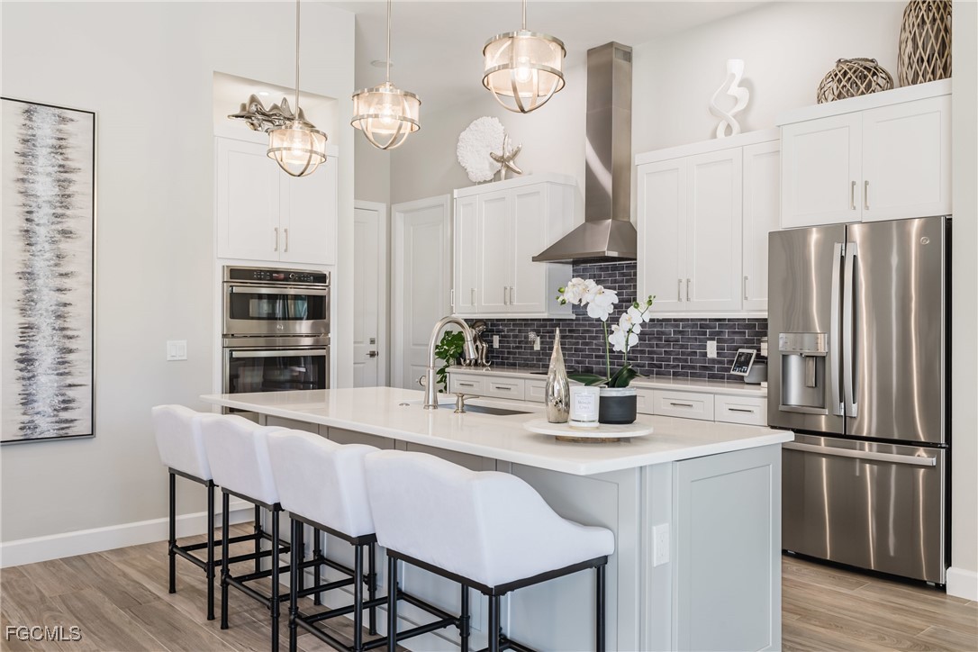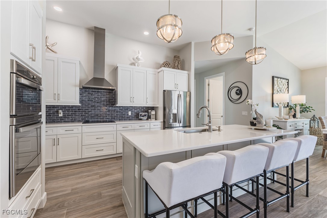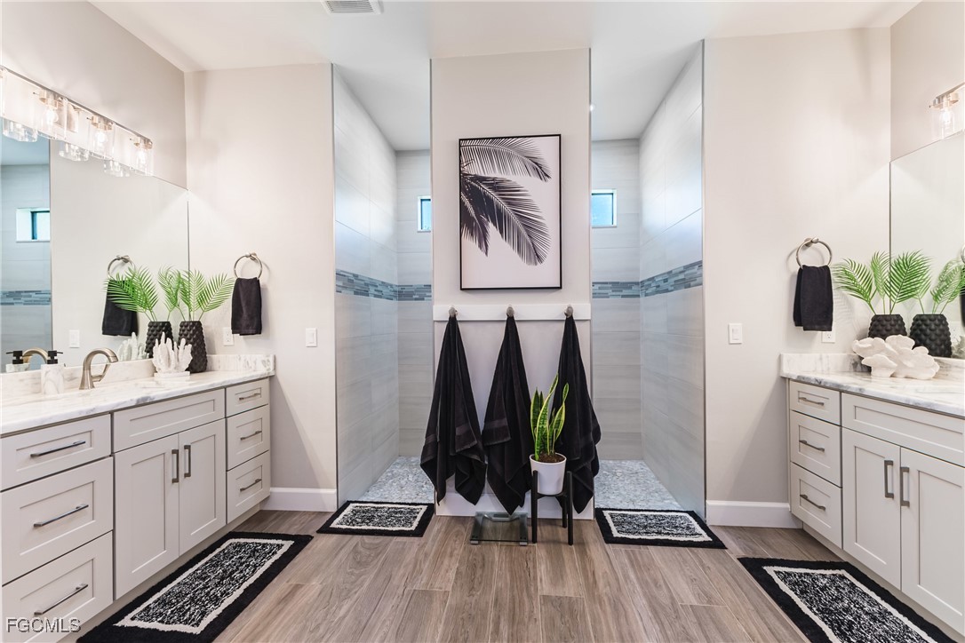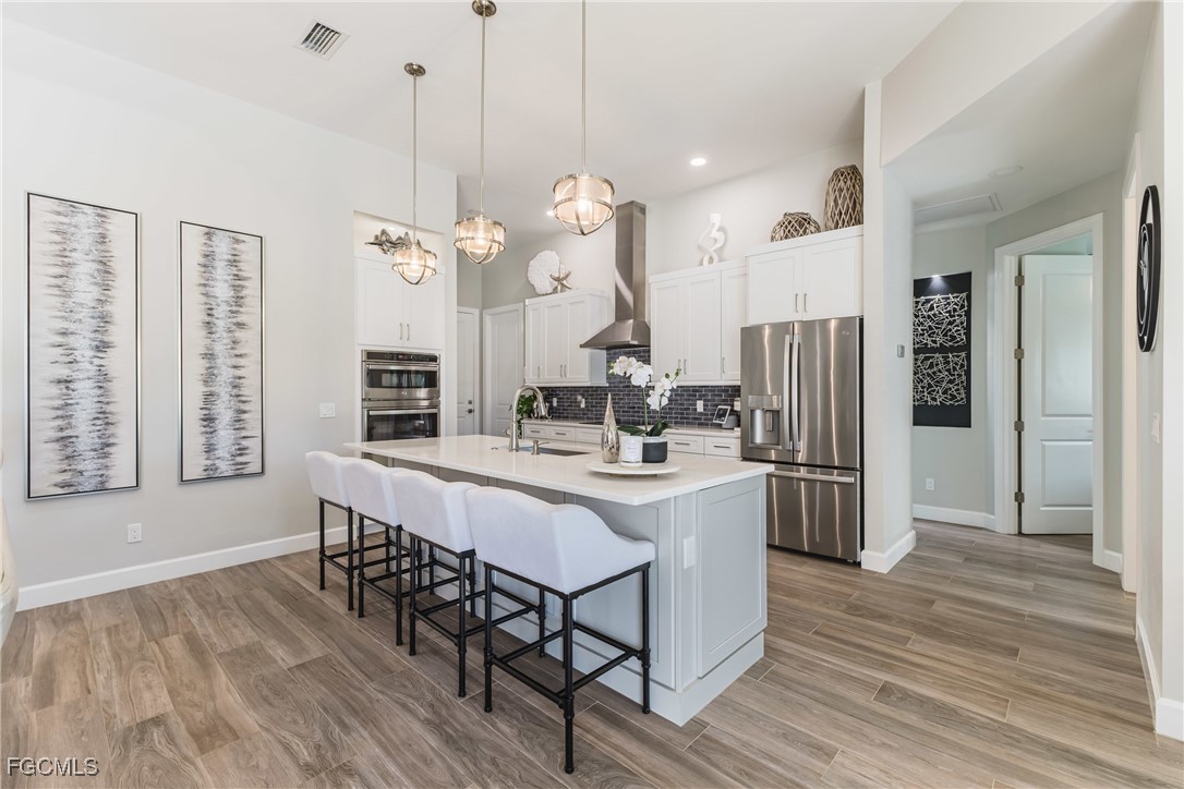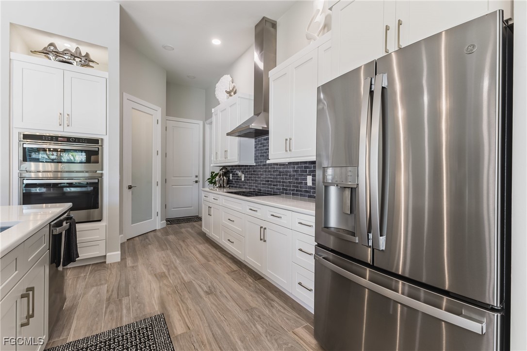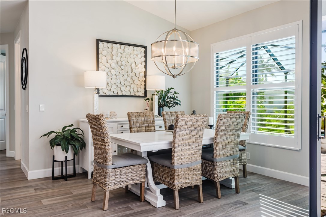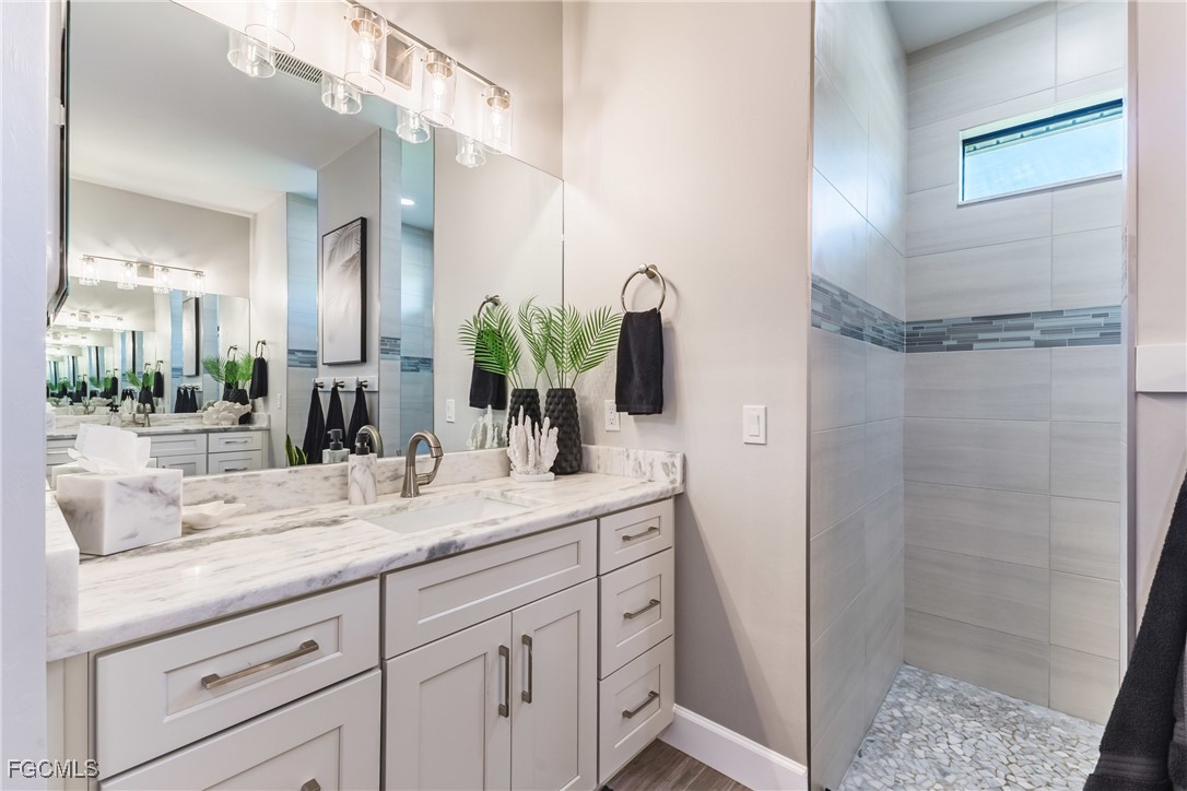 Stunning contemporary home showcasing pristine finishes, sophisticated design, and exceptional craftsmanship throughout. This beautifully appointed 3-bedroom + den, 2-bath property features a spacious open-concept layout with soaring ceilings, elegant lighted niches, and dramatic zero-corner impact sliding glass doors that create a seamless blend of indoor and outdoor living. The great room is anchored by a striking custom illuminated coffered ceiling that elevates the home’s modern aesthetic. The gourmet kitchen offers refined quartz countertops, premium GE Profile appliances, an induction cooktop, built-in range and microwave, and a “Closets By Design" custom walk-in pantry—a perfectly curated space for everyday living and entertaining. Sleek, upgraded tile flooring extends throughout the home for a clean, cohesive flow. The luxurious primary suite serves as a private retreat, featuring two “Closets By Design" custom walk-in closets, plantation shutters, and a tray ceiling. The spa-style ensuite includes a spacious car-wash-style shower and high-end finishes for a truly indulgent experience. Guest bedrooms each feature custom accent walls, plantation shutters, and thoughtful design details that enhance comfort and style. The south-facing backyard is an exceptional outdoor oasis, highlighted by a 2024 custom heated saltwater pool and spa with smart-app controls, fountain feature, in-pool table and bench, sun shelf, and pool bath. The expansive lanai spans the full width of the home, offering abundant space for outdoor dining, lounging, and entertaining. A spacious three-car garage with epoxy flooring and utility tub adds both practicality and premium appeal. Additional upgrades include impact windows and doors, an elegant brick-paver driveway, full paver pool surround, professional tropical landscaping with 12 mature palm trees, Built in safe, and an in-ground sprinkler system. Located in the highly sought-after Surfside area of SW Cape Coral, this home offers quick access to Veterans Pkwy and places you just minutes from Cape Coral’s best shopping, dining, and entertainment. This home delivers elevated style, comfort, and quality in every detail—schedule your private showing today!