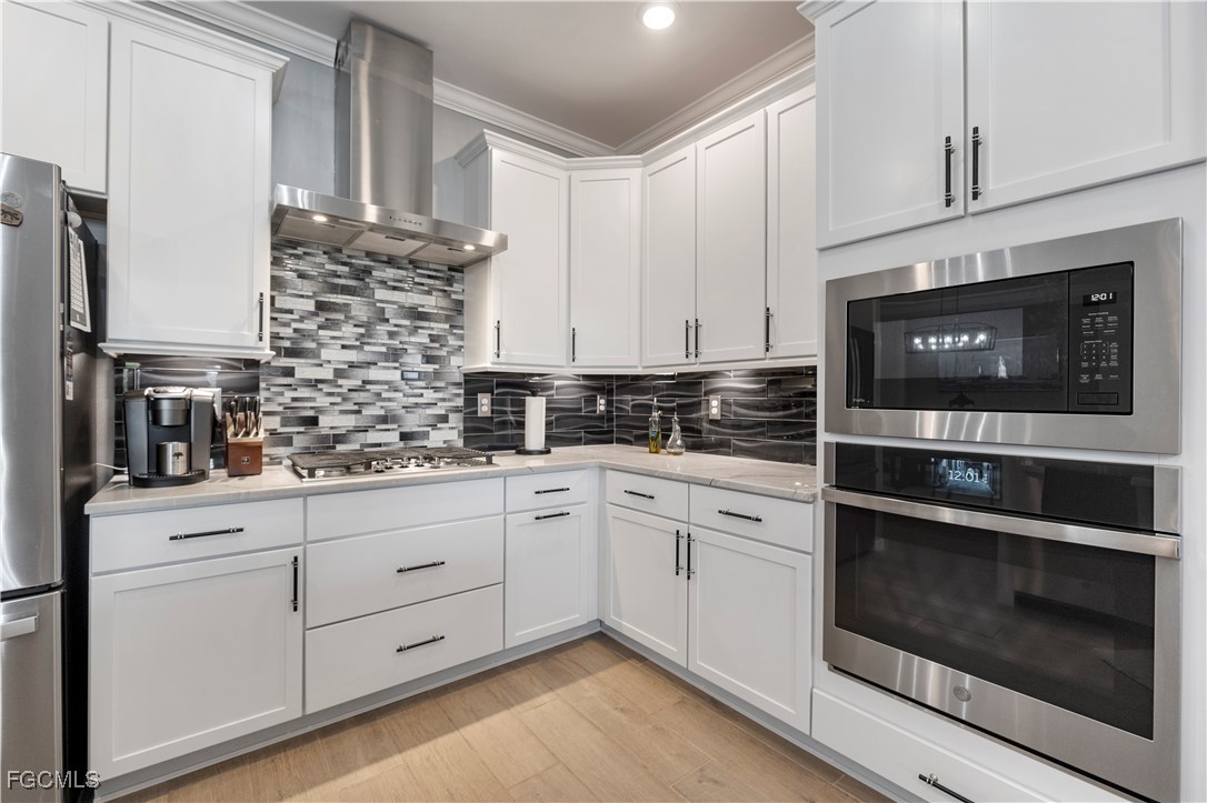 The living space reflects sophistication with a coffered ceiling, recessed lighting, and an entertainment wall complete with shelving and an electric fireplace. A cozy bar setup invites gathering and relaxation. Throughout the home, custom paint, tile floors, crown molding, quartzite kitchen countertops w/a custom backsplash, & upgraded appliances elevate the daily living experience. The master suite is designed as a tranquil retreat, boasting dual custom walk-in closets, a sitting area, and a luxurious bathroom featuring dual vanities, a tub, and a shower.