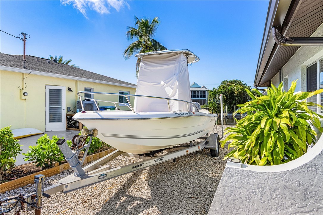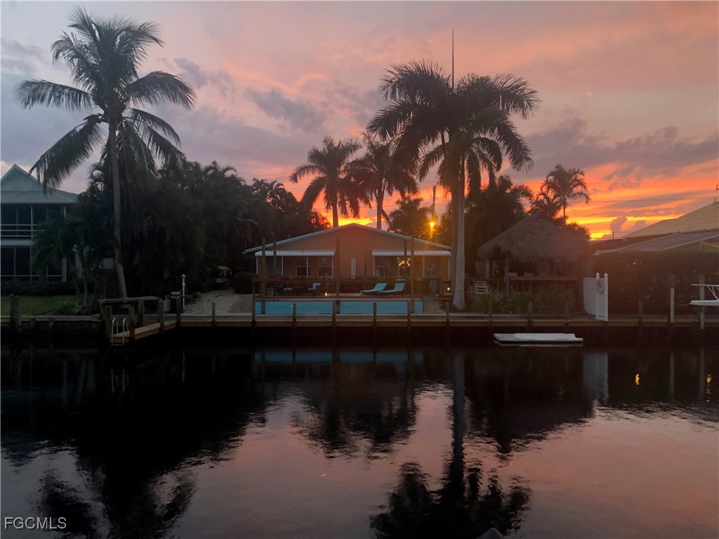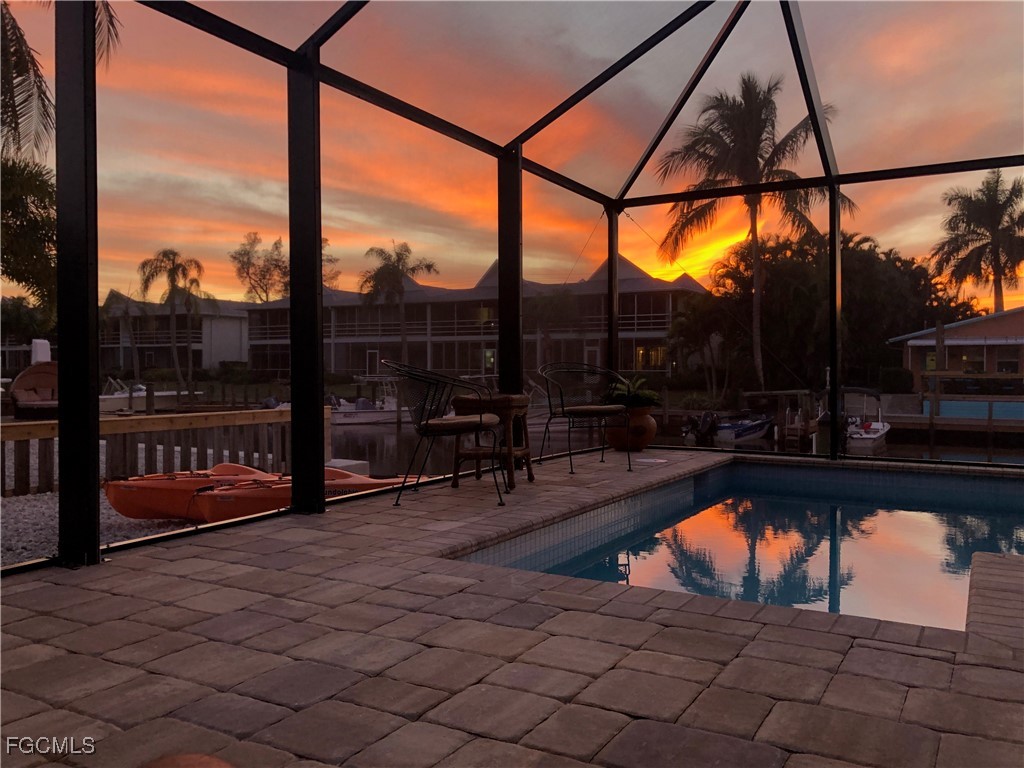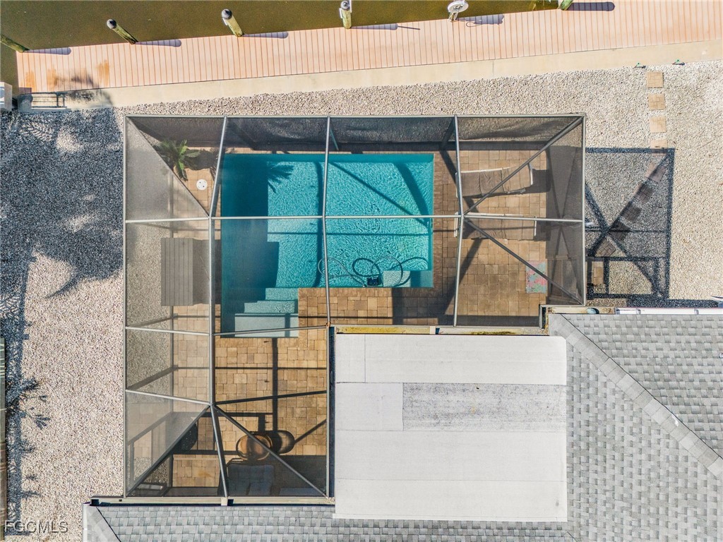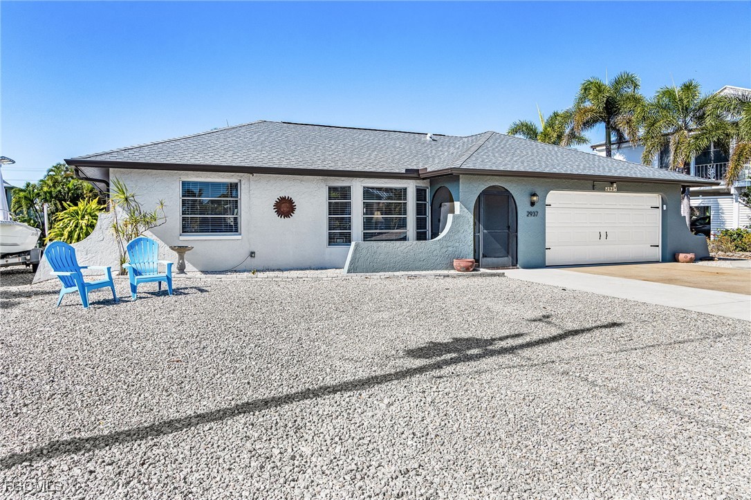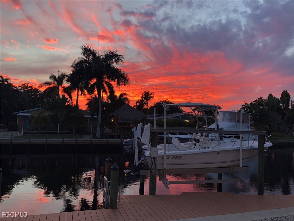 Are you tired of shoveling snow already? Then don't let this beautiful waterfront pool home with quick access to the Gulf of Mexico with no bridges or locks get away! This 3 bedroom/2 bath/2 car garage home has some furnishings that are negotiable! This home boasts: new vinyl seawall (by Honc) replaced in 2014, new screened pool in 2019, new roof in 2023, new electrical panel, new laminate flooring, no copper piping, newer almost 80' long composite dock and 7K pound lift, with water, electric and a fish cleaning station. Why wait to build, when you can move right in at closing? There is no mandatory HOA, and no restrictions, so you can leave your boat/trailer/RV next to your home. And, think of the money you will save by not having to pay for lawn maintenance with the stone yard! There are fruit trees on the property, and I hear the mangoes are delicious!