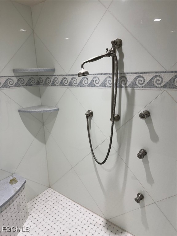 The master suite features a spa-inspired bathroom with a generous walk-in shower equipped with multiple shower heads and a dramatic overhead waterfall fixture. A separate soaking tub and double vanity with ample storage complete the retreat-like experience. All bedrooms are generously sized, complemented by three full bathrooms and a dedicated laundry room for added convenience.