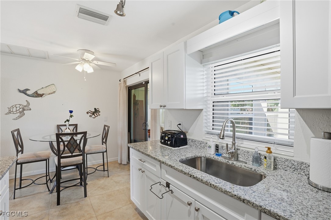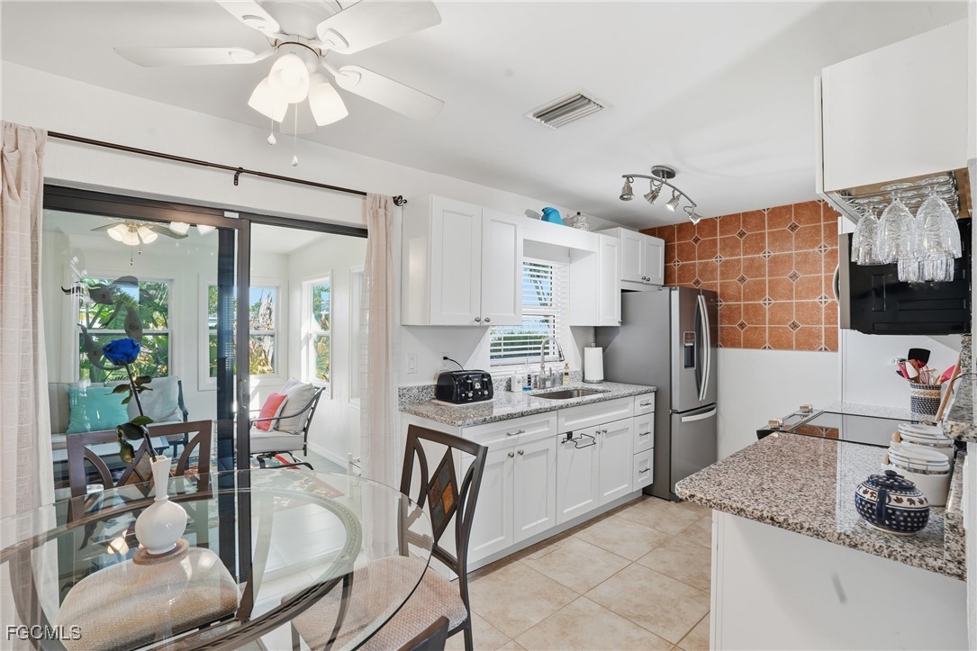 The updated kitchen features granite countertops, white cabinetry, stainless steel appliances, and a convenient breakfast bar — perfect for casual dining. The adjacent dining area flows seamlessly into a bright enclosed Florida room surrounded by windows, creating the perfect space for morning coffee, reading, or enjoying peaceful garden views year-round with its own mini-split A/C adds valuable flexible living space beyond the official square footage.