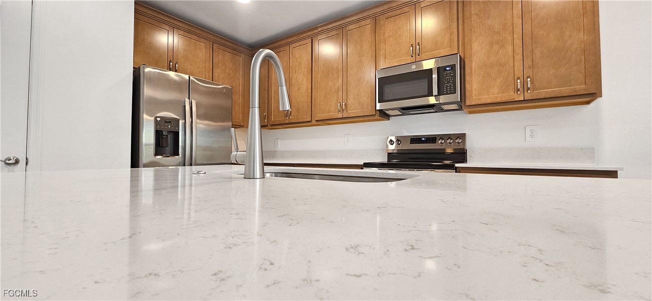 Inside, you’ll find 12x24 ceramic tile flooring throughout the main living areas and owner’s suite, with Mohawk carpet and upgraded 6-lb padding in the secondary bedrooms. The open-concept kitchen is designed to impress with 42” wood shaker cabinets with crown molding, soft-close drawers, quartz countertops, a single-bowl stainless undermount sink, and a full suite of brand-new GE stainless steel appliances. An upgraded LED lighting package and enhanced plumbing fixtures add a polished, modern finish throughout the home. Even the garage is upgraded with a durable epoxy-coated floor.
