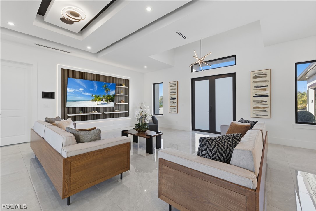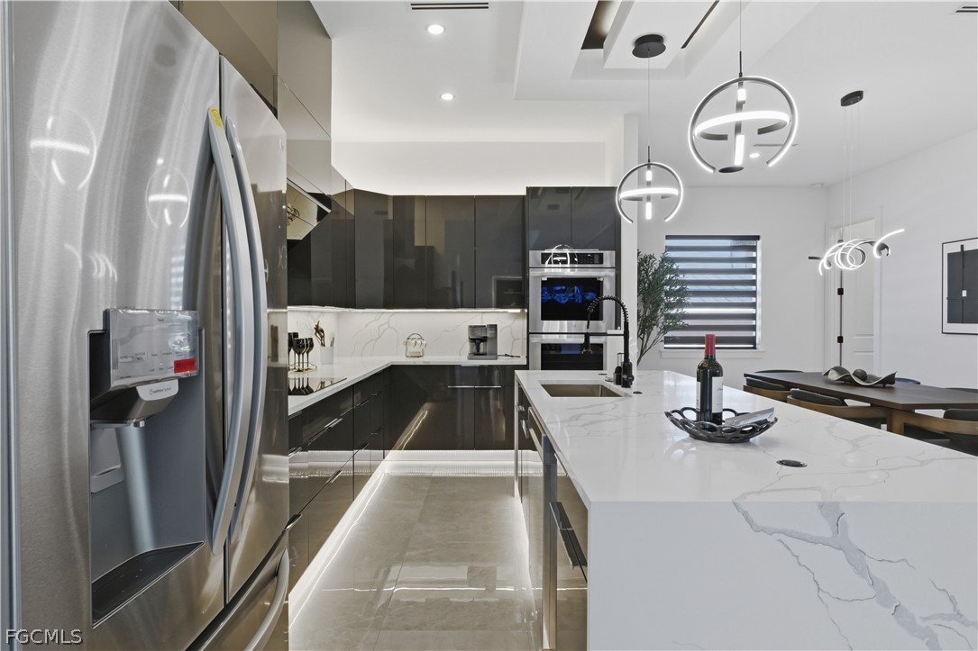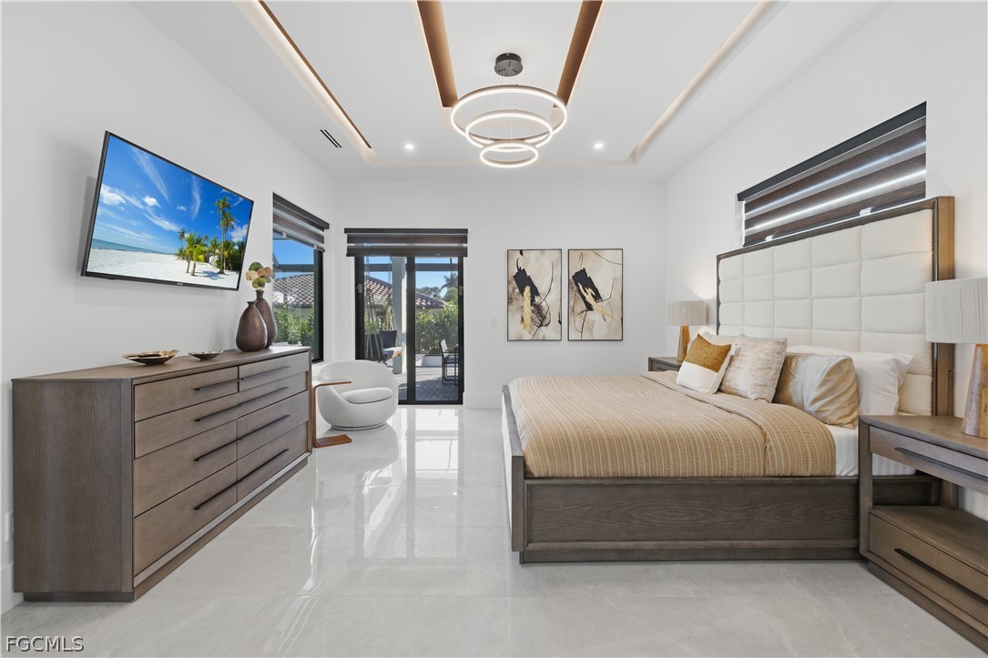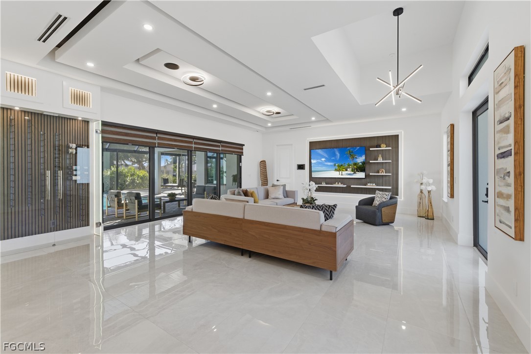 Inside, soaring tray ceilings, gorgeous designer lighting throughout, and an abundance of natural light create an airy, upscale atmosphere. Zebra blinds add both style and convenience, while the tiled garage elevates even the functional spaces of the home. Every detail has been carefully selected to create a refined yet welcoming feel.