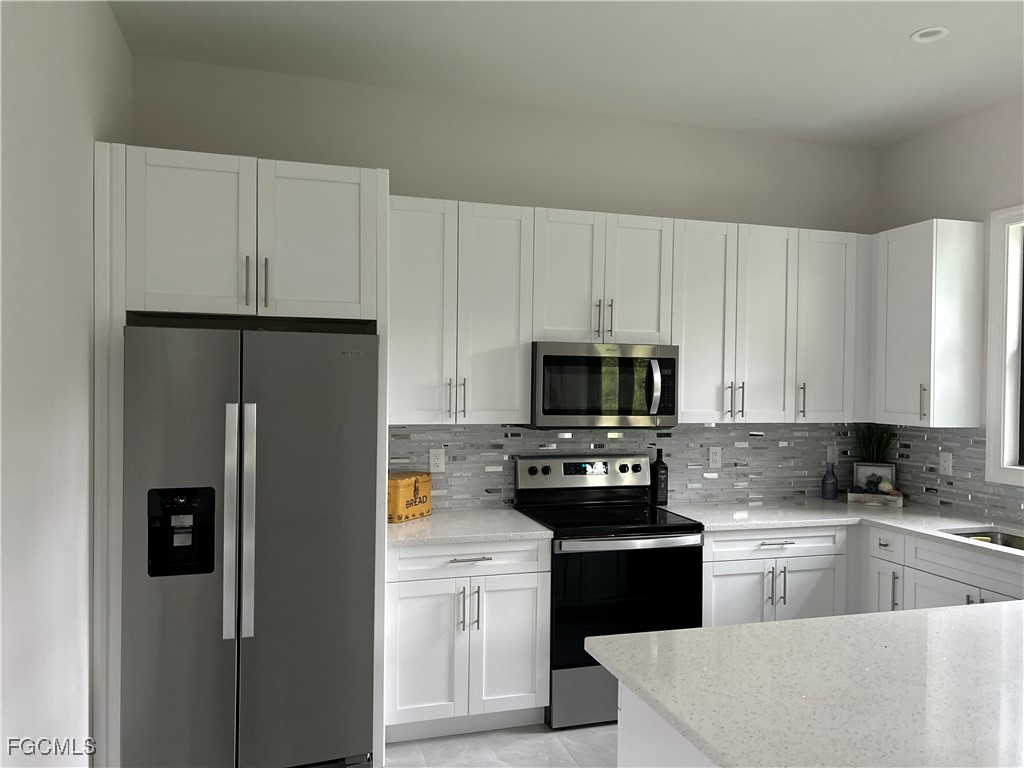 Featuring a desirable split floor plan, this home showcases an open-concept kitchen with quartz countertops, soft-close cabinetry, breakfast bar, and stainless-steel appliances — perfect for both everyday living and entertaining. Tile flooring throughout, vaulted ceilings with ceiling fans, and a spacious laundry room with sink and built-in cabinets provide added comfort and functionality.