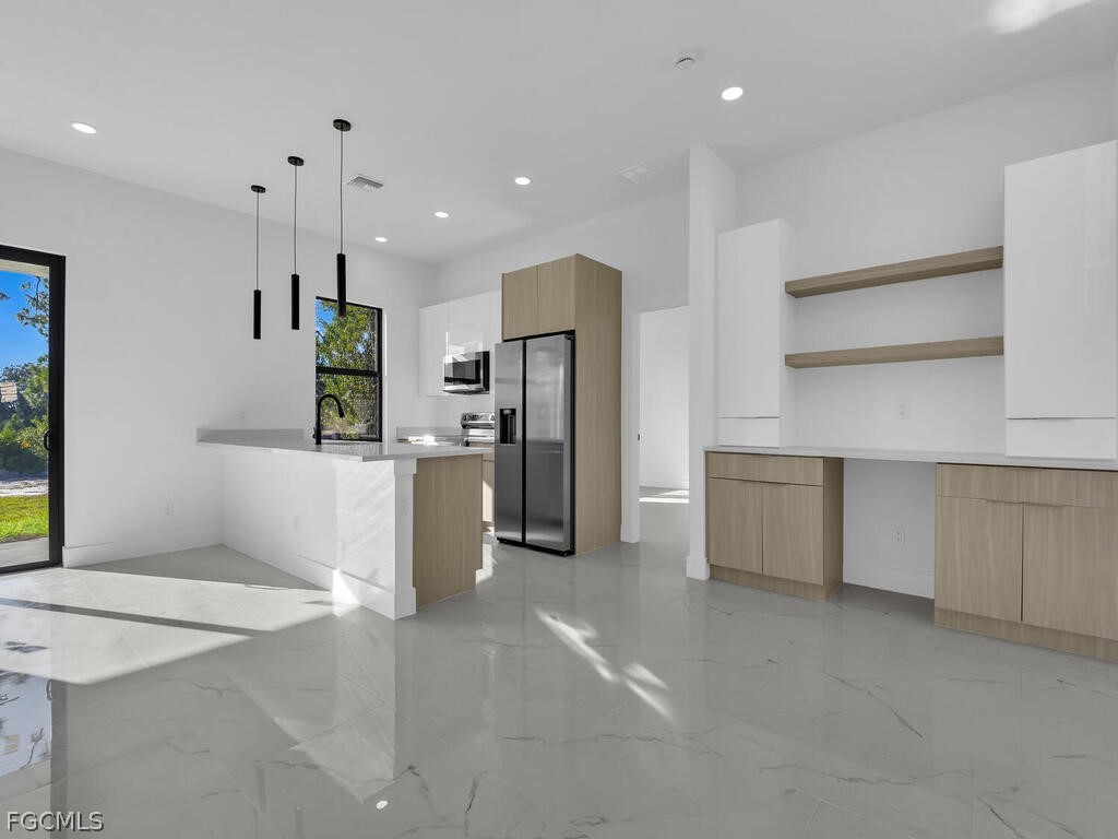 Welcome to this beautifully crafted new construction home in Lehigh Acres, offering 3 bedrooms plus a den and 2 bathrooms in a peaceful, private neighborhood. Situated on an oversized .28-acre lot, this property provides added space, privacy, and endless possibilities for outdoor living. Designed with a modern minimalist style, this bright and airy residence features an open-concept floor plan ideal for both everyday living and entertaining. The spacious living and dining areas flow seamlessly into a contemporary kitchen equipped with stainless steel appliances, ample cabinetry, and generous counter space. A dedicated bar/coffee area in the dining space adds both functionality and charm—perfect for entertaining or creating a stylish beverage station. Large windows fill the home with natural Florida sunshine, while impact-resistant windows offer added security, energy efficiency, and peace of mind. The primary suite provides a private retreat featuring a double vanity and well-appointed finishes. Two additional bedrooms offer comfort for family or guests, and the versatile den is ideal for a home office, study, or flex space. With its oversized lot, modern design, impact windows, and thoughtful upgrades throughout, this home perfectly blends style, functionality, and the best of Florida living.