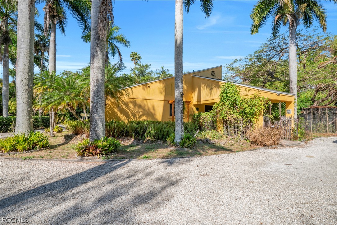 Discover a serene 1.7-acre retreat of lush, fully gated gardens and mature palm trees, perfectly private and secure. This remarkable estate features two residential buildings: a spacious main residence (3 large bedrooms, 3 baths) and a charming two-bedroom, two-bath bungalow guest house. A circular gravel driveway leads you to the property, where a double carport and a separate aluminum shop/storage structure (convertible to an additional garage) provide abundant parking and utility space.