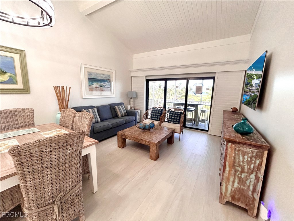 The Gulf-front living and dining areas flow seamlessly together, complemented by coastal décor and contemporary recessed lighting that elevate the atmosphere. Impact-rated sliding doors lead to a screened patio with sweeping panoramic views of the Gulf.