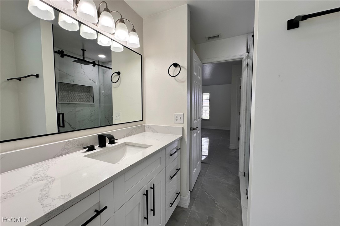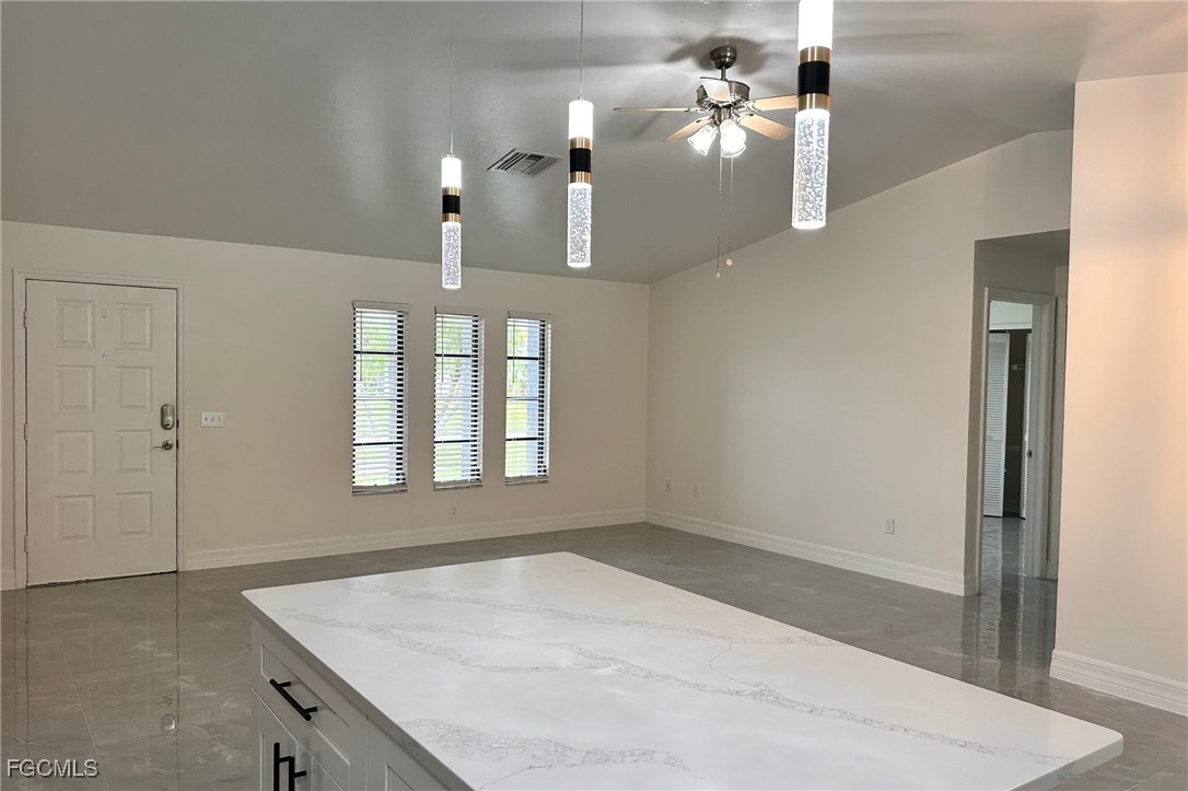 The interior features a spacious open-concept floorplan that is perfect for entertaining family and friends. Stunning large gray marble-look tile floors flow throughout, creating a sleek and modern backdrop. The kitchen is a chef’s dream, highlighted by a large quartz island with a matching quartz backsplash, premium shaker cabinets with bold black hardware, stainless steel appliances including a washer and dryer, and a generous walk-in pantry. Premium LED lighting and ceiling fans enhance comfort and style in every room.