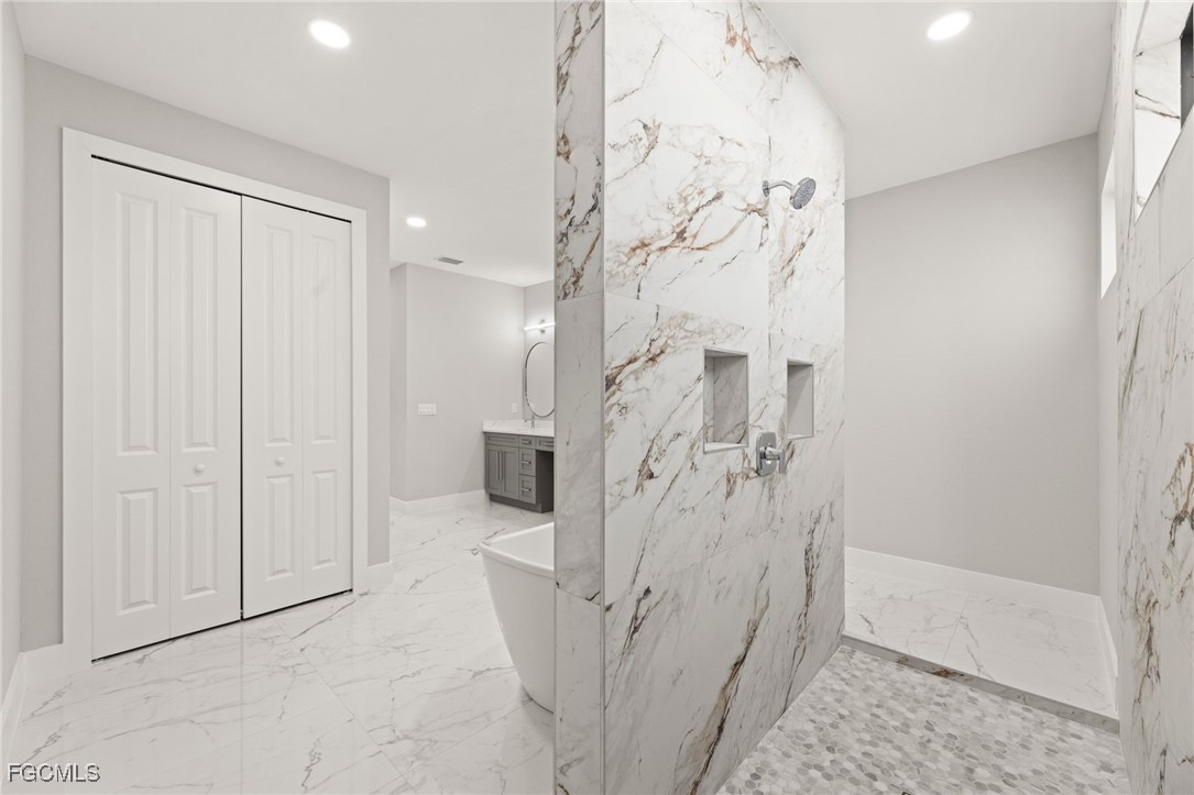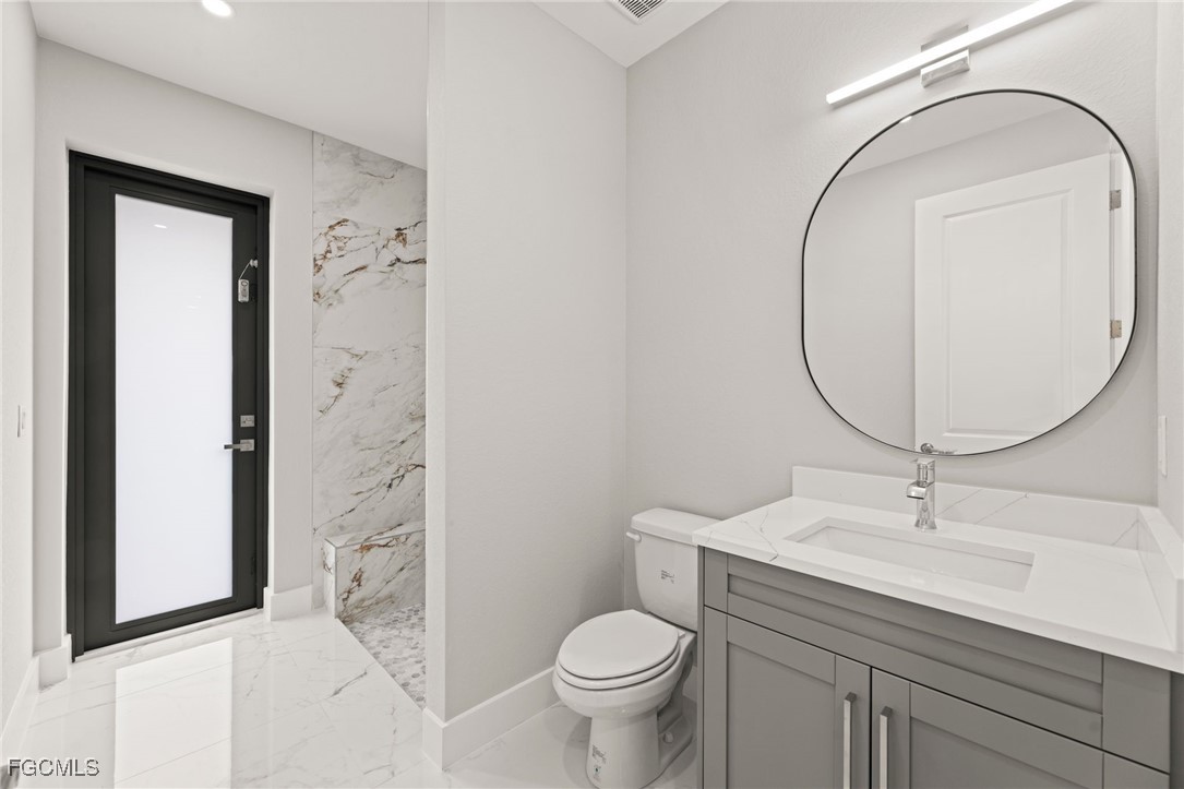 There is a full-size pool bath with a standup shower and beautiful tile. The living room has 10ft coffered ceilings along with a custom built in TV enclosure with tile from top to bottom including an electric fireplace and a 70-inch smart TV (The enclosure can accommodate larger sizes). The entryway has 14ft cascading ceilings along with three large windows to offer plenty of natural light throughout the day. Overlooking the living room is the large waterfall kitchen island with quartz countertops and extra seating.