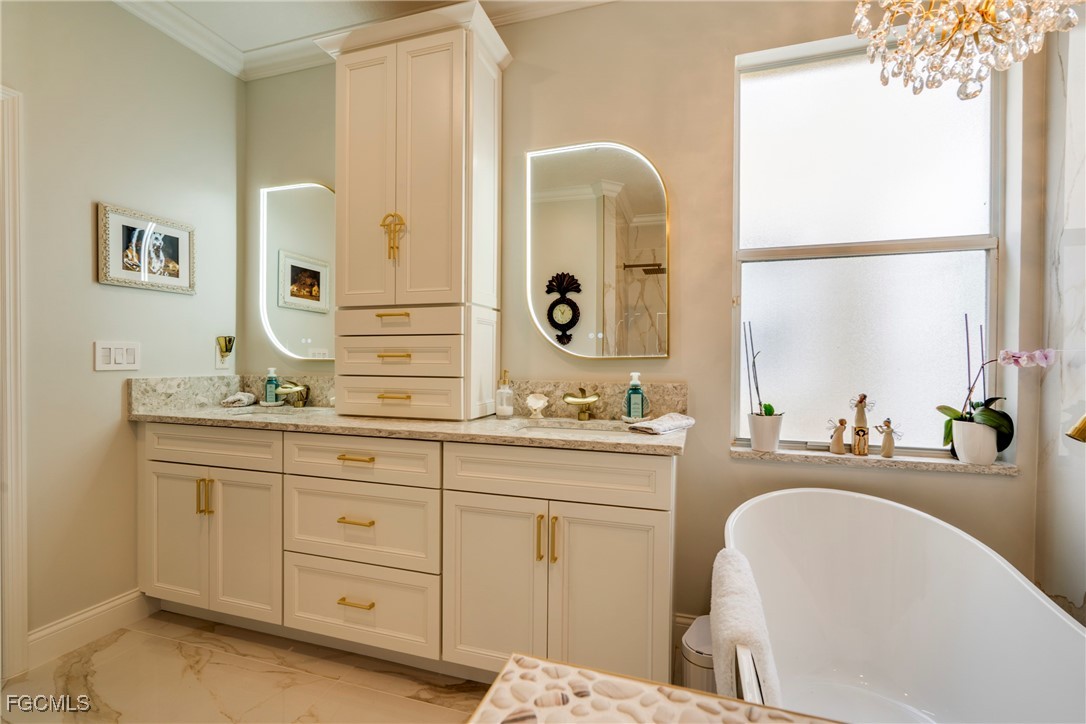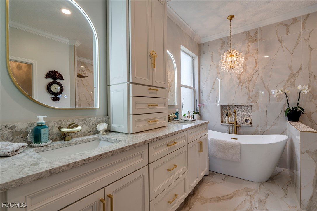 Main suite with walk-in shower, garden tub, dual sinks & walk-in closets