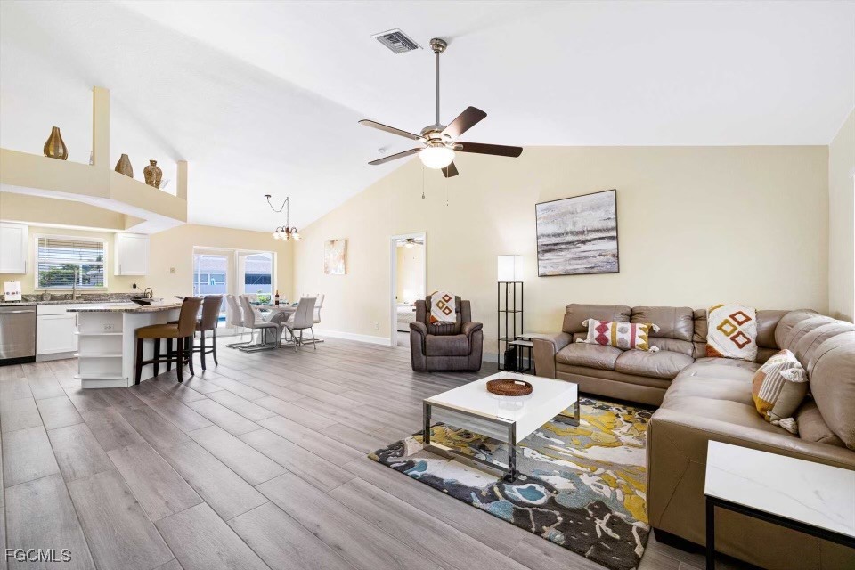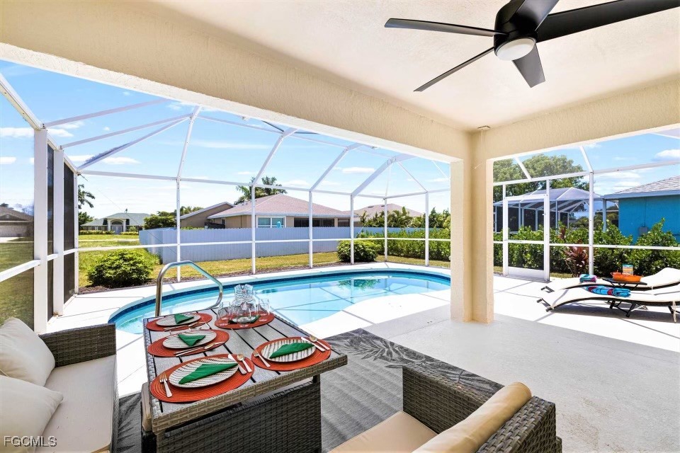 Welcome to Villa Joy, a beautifully remodeled 4-bedroom, 2-bathroom home located in the highly sought-after Southwest area of Cape Coral, FL. Built in 2004 and boasting 1,711 sq ft of living space, this home is perfect for both relaxing and entertaining. The modern kitchen is equipped with stainless steel appliances, granite countertops, and elegant white cabinets. Vaulted ceilings in the living room create a spacious, airy feel. Porcelain wood plank tile is throughout the house except for bedrooms. Relax by the pool and enjoy Florida living. Fully furnished and turnkey-ready Villa Joy offers a perfect blend of style, comfort, and convenience. Pool care, lawn care, trash removal are included.