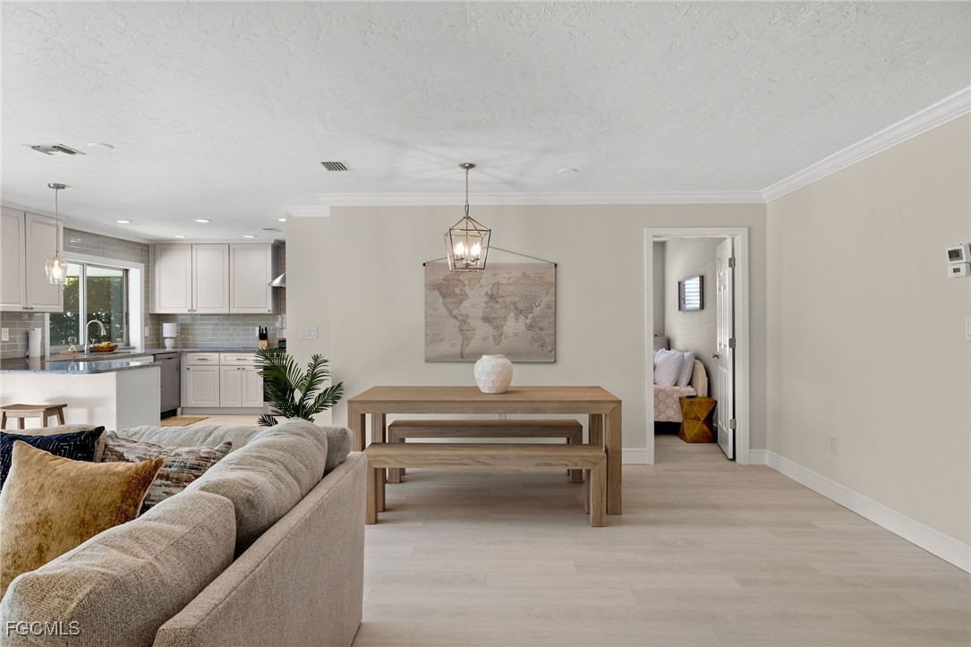 Step inside to a bright, open-concept floor plan that blends contemporary finishes with relaxed coastal charm. The living area features new flooring, recessed lighting in the kitchen, and modern neutral tones, all centered around sliding glass doors that open directly to the screened lanai and sparkling pool. The chef’s kitchen boasts stainless steel appliances, granite countertops, subway tile backsplash, and ample cabinet space — perfect for both everyday cooking and entertaining.