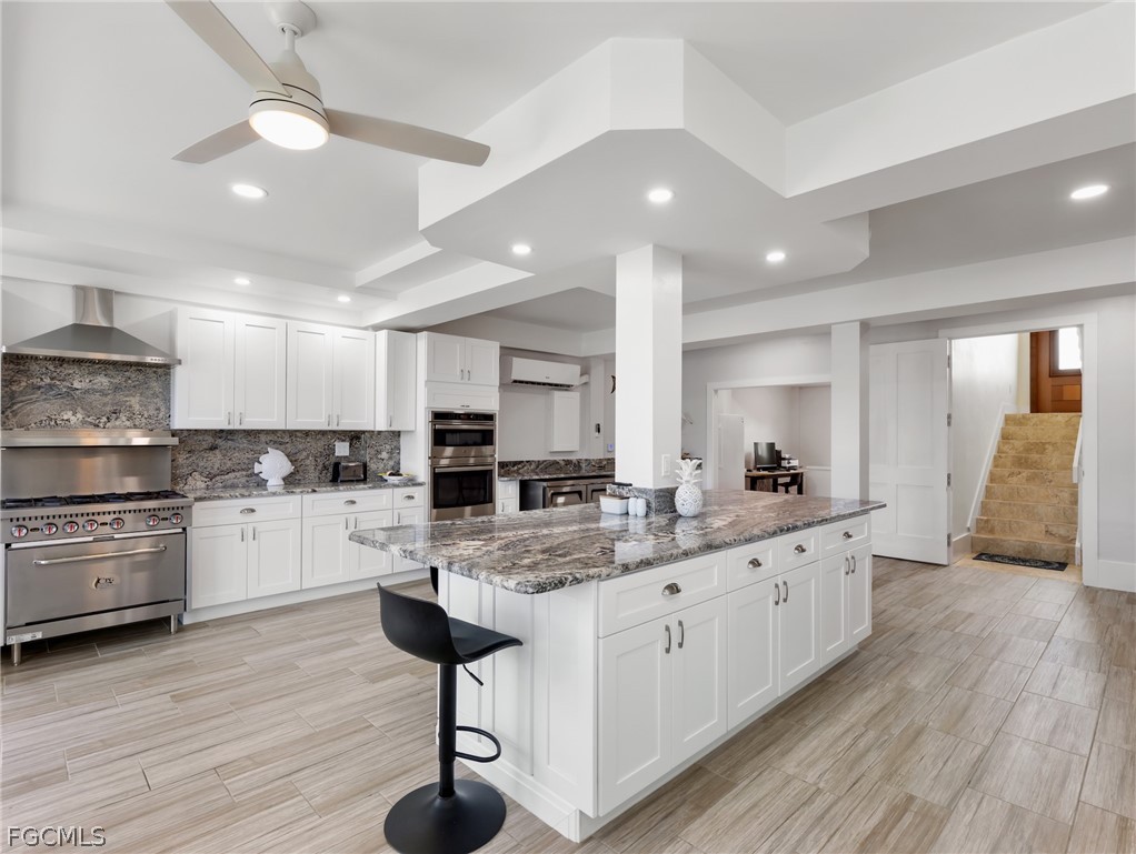 Designed for entertaining on a grand scale, the ground level features an expansive chef’s kitchen equipped with an industrial 6-burner CPG gas range with hood, multiple ovens, wall microwave, Valpro refrigerator, stand-up refrigerator, cabinet freezer, dual sinks, shaker cabinetry, granite countertops, and two convenient pass-through windows to the lanai. This level also includes a guest suite with full bath and direct lanai access, a half bath, and a finished 2-car garage with tiled flooring.