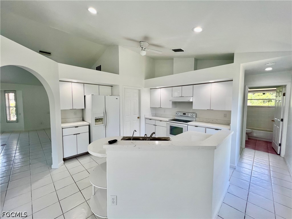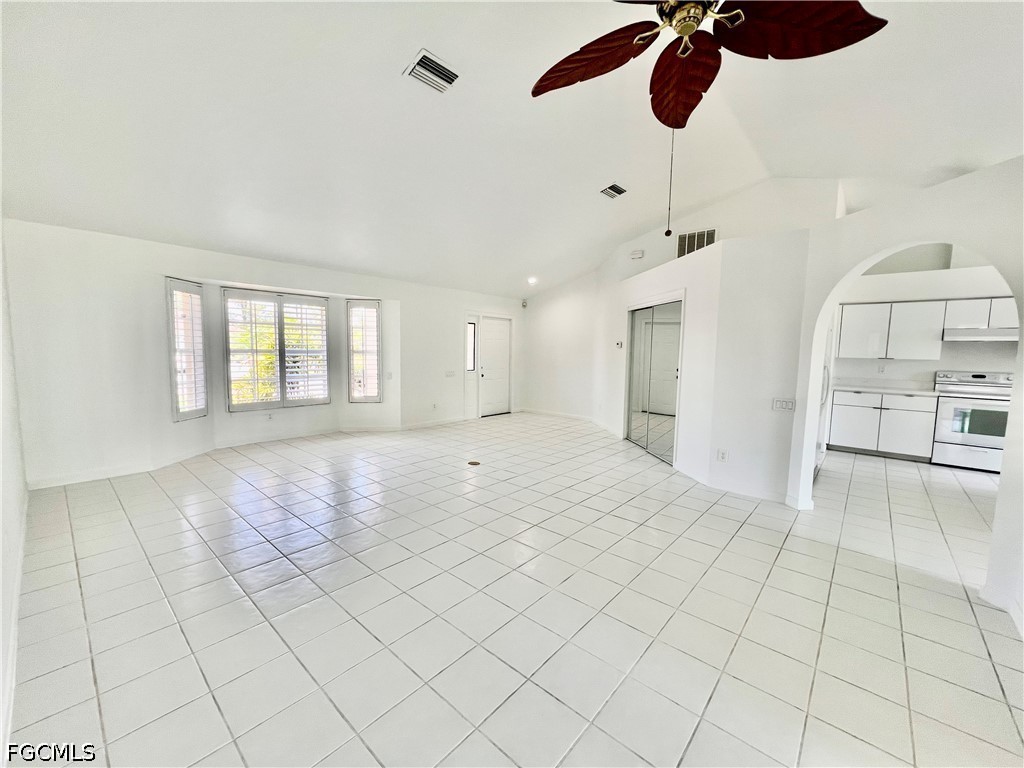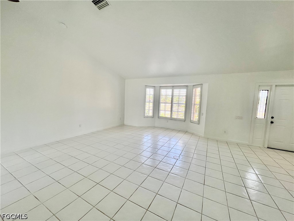 NEW DIMENSIONAL SHINGLE ROOF IN 2018, NEW WATER HEATER 2025, NEW WATER TREATMENT EQUIPMENT IN 2025, newer interior doors, nicely landscaped corner lot, 20 X 9 enclosed family room/den under central heat and air, cathedral ceilings, plant shelves, ceramic tile floors throughout the entire home, QUARTZ tops in the kitchen with breakfast bar and nook area, cathedral ceilings and plant shelves, great room with living and dining area, decorative plantation shutters, primary bedroom with walk in closet and private ensuite bathroom with newly tiled walk in shower, new commodes in both bathrooms, LED lighting throughout, freshly painted interior, large indoor laundry room with laundry tub, quiet low traffic location, located just minutes to I-75, Ft Myers and the International airport, NO FLOOD INSURANCE REQUIRED. LEHIGH IS THE HIGHEST ELEVATION IN LEE COUNTY.