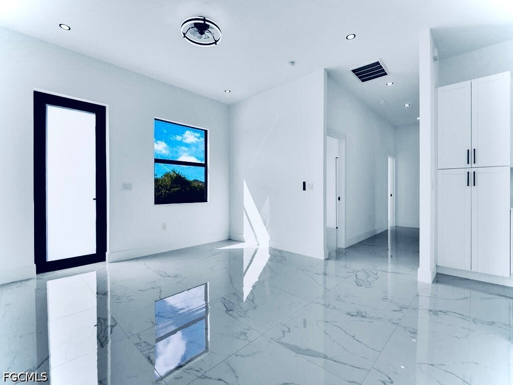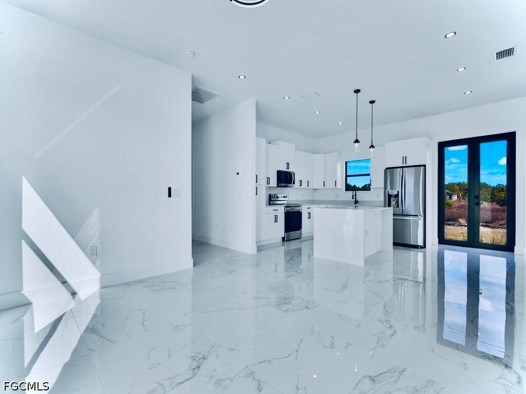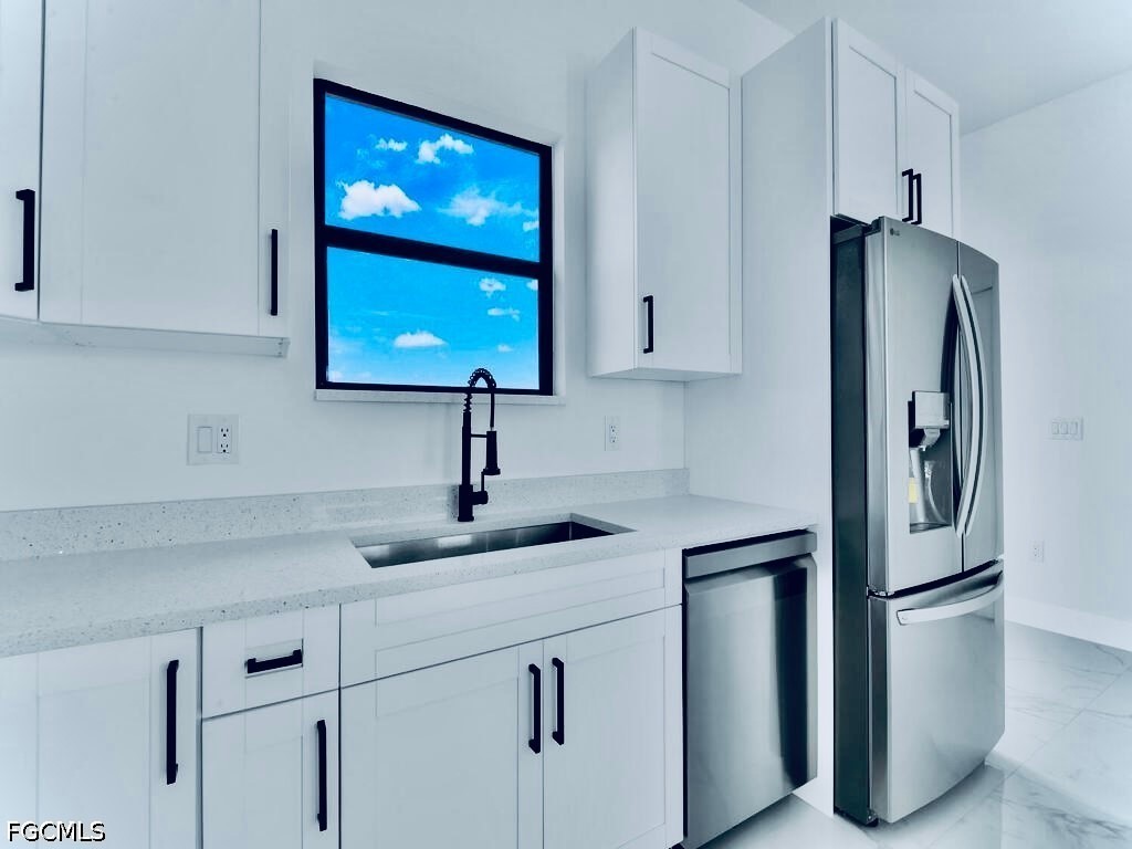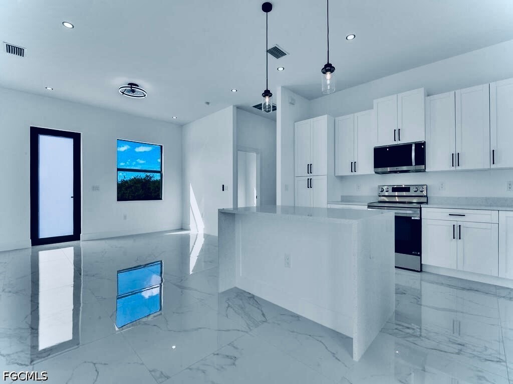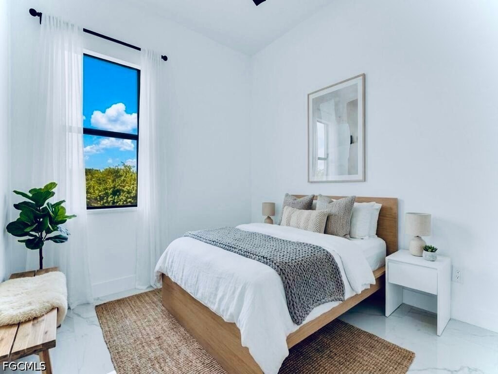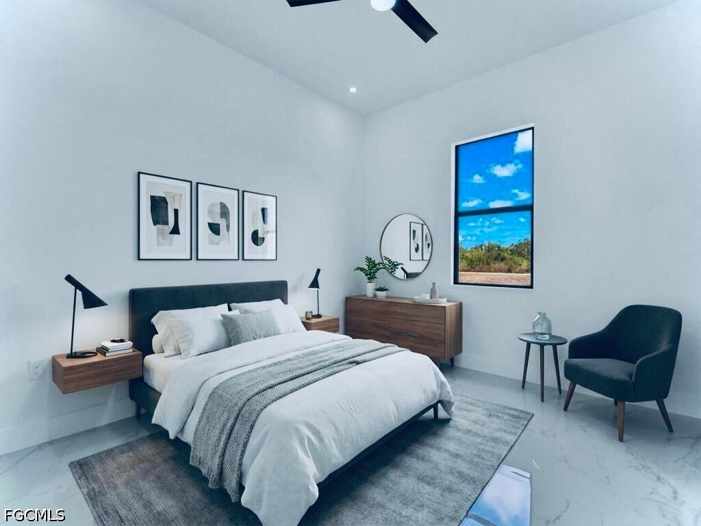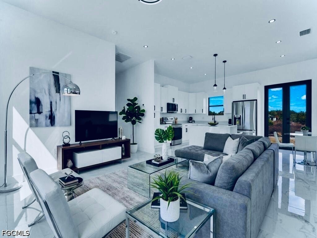 Welcome to this MAGNIFICENT MODERN 3/3 Nestled away on a quiet DEAD END cul-de-sac just minutes to all major amenities & a quick commute to Fort Myers. These GRAND elevations with high Volume ceilings & 8FT IMPACT windows & doors spotlights attractive OVERSIZED porcelain tile throughout, a welcoming breakfast bar with rainfall QUARTZ countertops, soft-close shaker cabinets, high end LG STAINLESS STEEL appliances, and IMPRESSIVE frame-less glass TILED showers. This open floor plan with GREAT room highlights Premium fixtures with remotes, Pendant & recessed lighting, walk-in closet & Desirable closet organizers, enticing QUARTZ countertops in baths, and an open back patio with Potential Pool bath or efficiency access. It also features a HIGH EFFICIENCY washer & dryer under air, epoxy flooring in garage, custom mirrors, entertainment pre-wired, nicely tiled front entrance and a walkway around to garage. Schedule your private showing today!