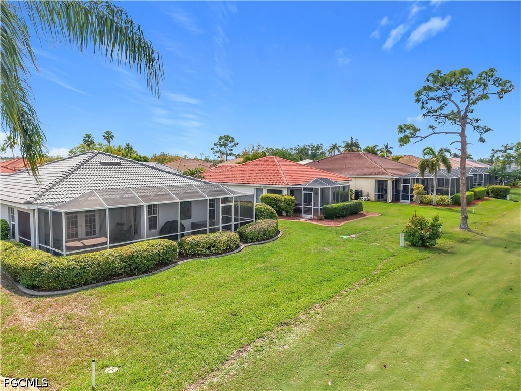 Welcome to this sunny LaConia floorplan in HERONS GLEN GOLF AND COUNTRY CLUB, where the 8th fairway stretches out beyond your back lanai and the lifestyle you have been looking for is right outside your door. A PAVER driveway and 2026 NEW ROOF welcomes you home, and inside, TILE PLANK FLOORING flows through the living areas alongside CROWN MOLDING, wainscoting, PLANTATION SHUTTERS, and thoughtfully upgraded fans and fixtures that add a refined touch to every room. The vaulted great room opens through elegant FRENCH DOORS to a house-width screened LANAI, creating a seamless indoor-outdoor living experience with tranquil GOLF COURSE VIEWS, a NEWER SPA (included), and plenty of room to relax or entertain. The primary suite also connects directly to the lanai through French doors, so the golf course views greet you every morning. The en suite bath offers dual sinks, a spacious and sun-filled walk-in shower, and a linen closet for easy organization. At the front of the home, a screened entry lanai invites you to open both doors and let a refreshing cross breeze move through the entire house. In the kitchen, a newer BLACK STAINLESS APPLIANCE SUITE, upgraded SHAKER bead board cabinetry, large rectangular sink, and NATURAL STONE countertops with an extended breakfast bar, and a separate eat-in area all come together to create a space that works beautifully for everything from quiet mornings to lively gatherings. A smart thermostat and a Trane A/C system provide year-round comfort and efficiency, and the professionally installed landscape curbing adds to the home's polished curb appeal. Herons Glen is more than a neighborhood; it is a vibrant, active lifestyle community where neighbors become friends and every day brings something to enjoy, from tennis, pickleball, and bocce to dining, social events, and of course, world-class golf on a course ranked #2 in Florida. This home is an easy walk, golf cart ride, or short drive to the clubhouse, putting all of that right at your doorstep.