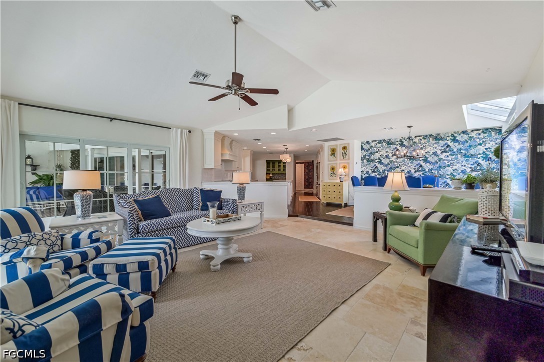 This oversized 4 bed / 4.5 bath pool home in Spanish Wells Golf & Country Club offers a direct lake view, two ensuite master bedrooms, two guest bedrooms, and the perfect reading nook. Spend time with family and friends in the two living rooms and a separate family/TV room off of the kitchen. The home has an amazing amount of natural lighting with beautiful skylights and expansive sliders. The large and inviting kitchen is well stocked with all of the necessities and more.A butler pantry is also in the kitchen. In the cooler months, enjoy the fresh air and perfect view by completely opening up the lanai doors off of the back living room. This also serves as a great extension to the outdoor space. The screened-in lanai features a private heated pool, lounge chairs, relaxed seating and dining tables and chairs. There is also a full cabana bathroom which includes a shower and is accessible directly from the lanai.