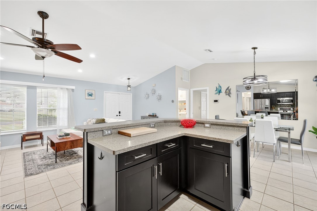 Step inside through the elegant double-door entry and into a spacious open-concept living area with soaring vaulted ceilings, creating a bright and airy atmosphere perfect for relaxing or entertaining. The updated kitchen features newer custom cabinetry and flows seamlessly into the main living space.