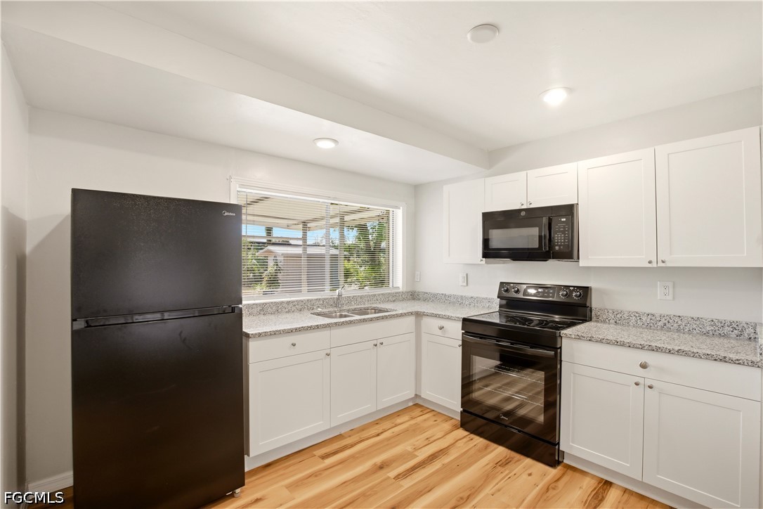 The kitchen was done right. White shaker cabinets, granite countertops, black appliances, and recessed lighting overhead. Warm, functional, and easy to love.