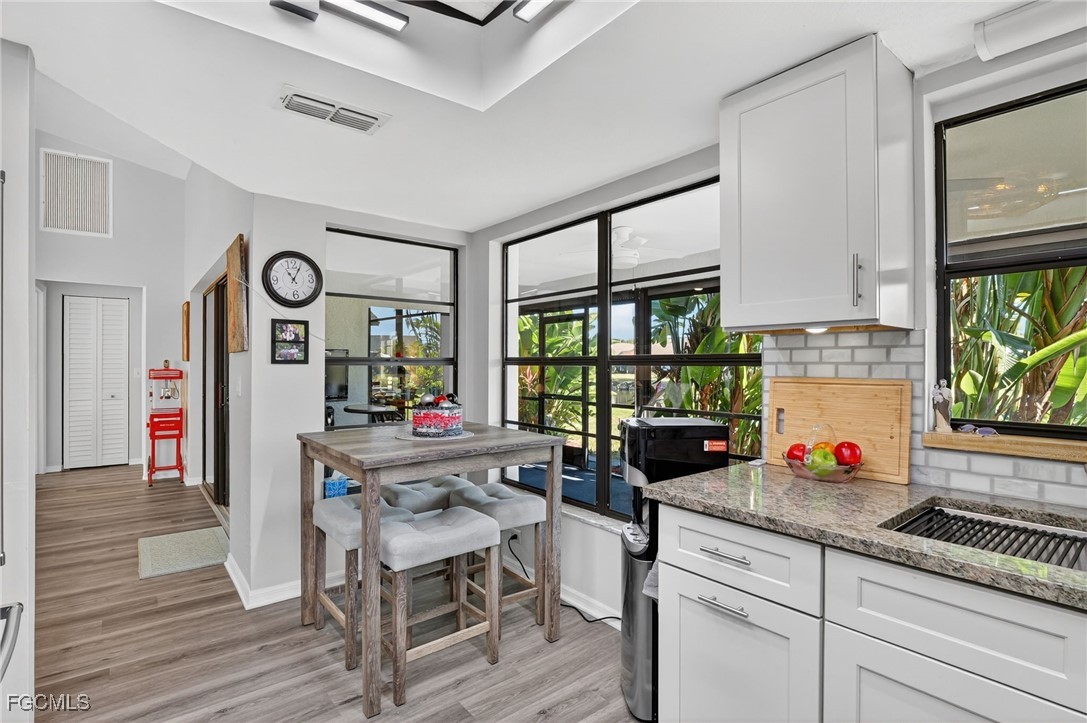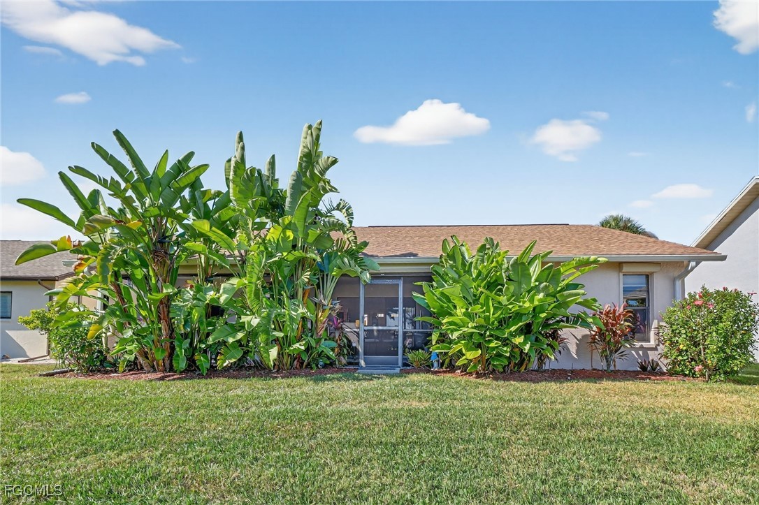 Renovated home, not in a flood zone, perfectly positioned on the 13th tee with beautiful water views! This home features extensive updates including new blinds, new fans, new plumbing, new electrical, added attic insulation, newer roof and HVAC, electric shutters, newer laminate wood floors, upgraded fixtures and a vaulted ceiling. The updated kitchen offers granite countertops , a stone backsplash, upgraded cabinets with new hardware, upgraded stainless steel appliances, and a deep stainless steel sink. The large main suite features two closets, double vanities with solid surface tops, and a tile walk in shower. Enjoy the covered screened patio with an awesome golf and water view, perfect for relaxing and entertaining. Don't miss out on the chance to call this gem HOME!