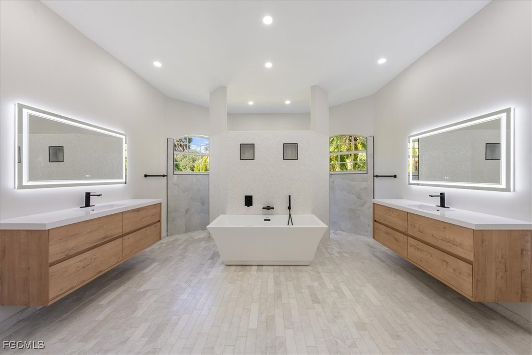 The interior showcases a brand-new modern kitchen featuring a large quartz island ideal for entertaining, full quartz backsplash, and custom cabinetry with soft-close finishes. A built-in bar enhances the entertaining experience, while bathrooms throughout the home feature floating vanities for a sleek, modern aesthetic. Additional interior features include a floor safe the stunning owner's suite.